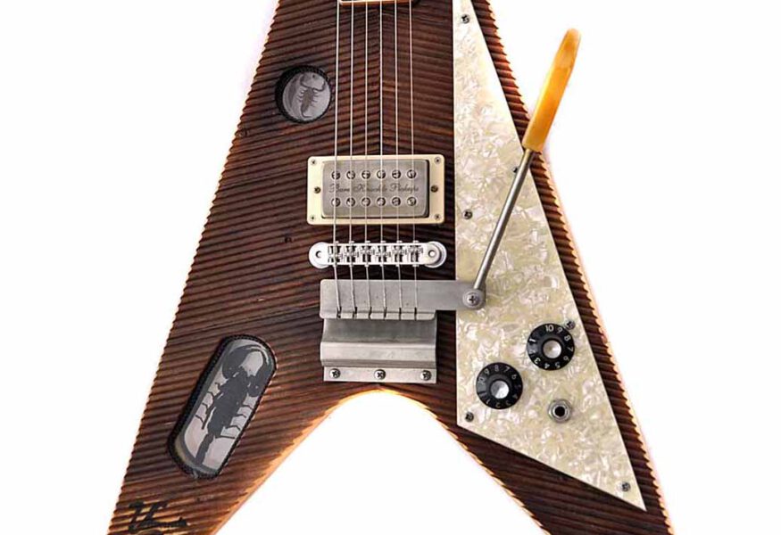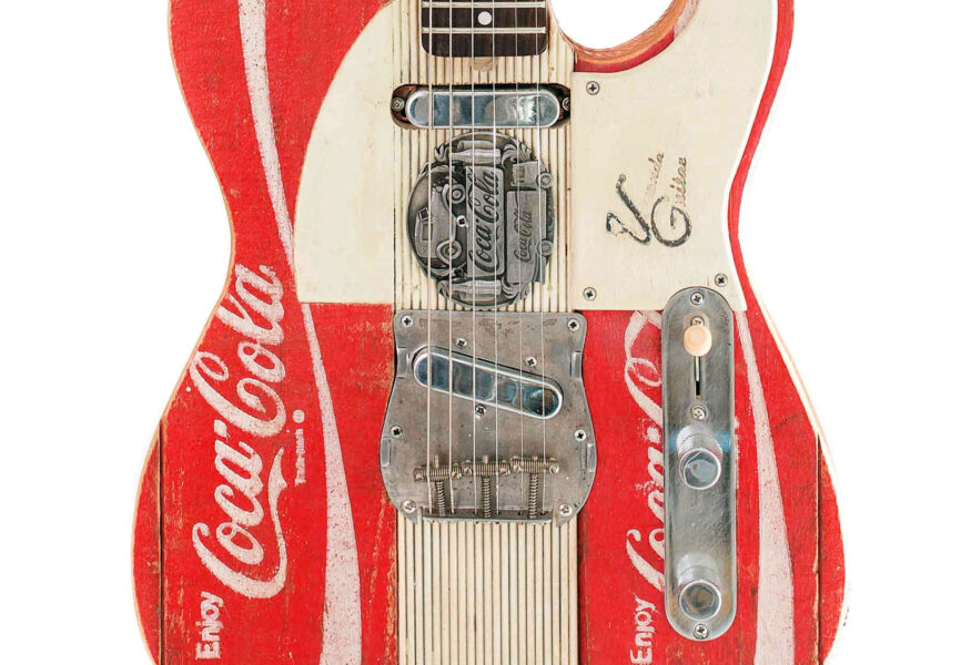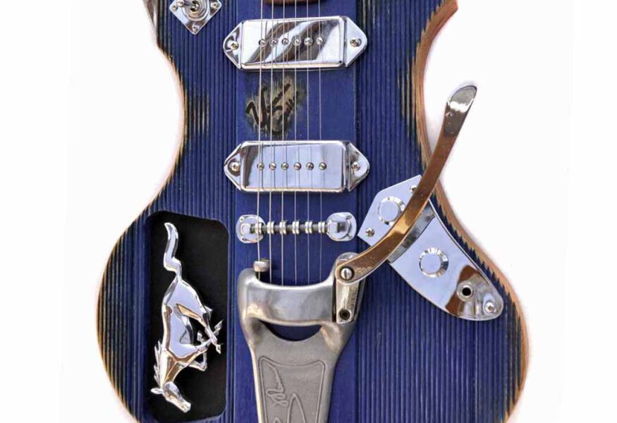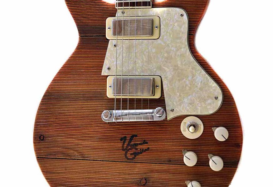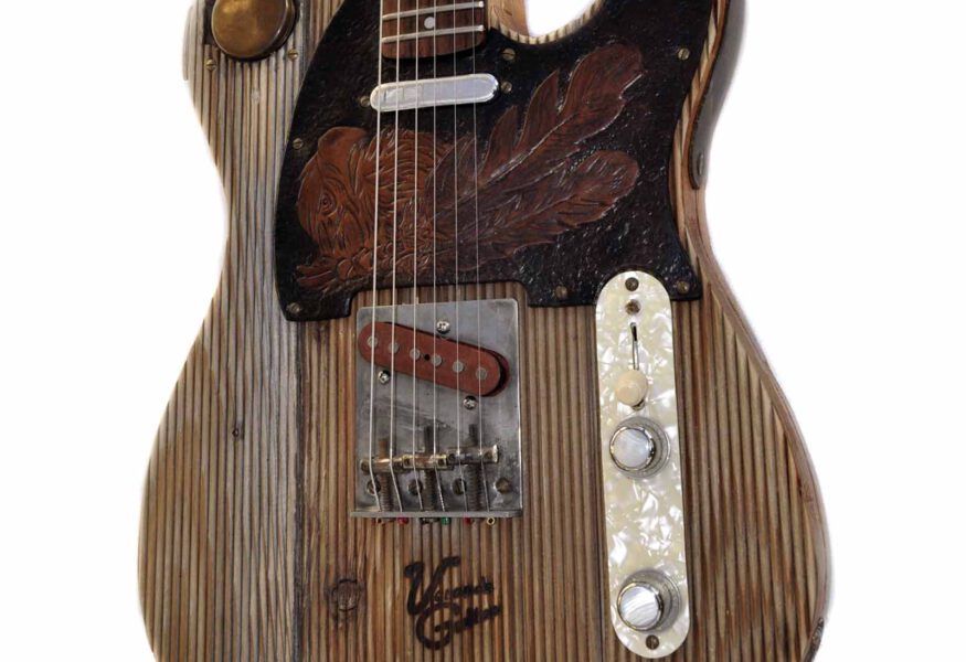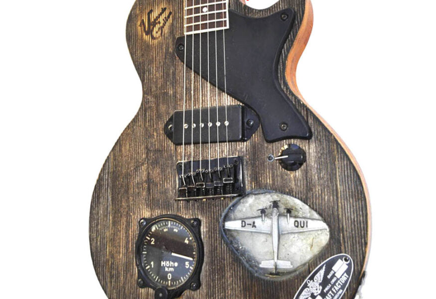 Die „Aviator“ ist meine erste reine Themen-Gitarre. Im Grunde handelt es sich um eine LP Junior mit einen grandios klingenden „Lindy Fralin“ P-90 Tonabnehmer handmade in the USA. Die Decke ist aus stark verwittertem Verandaholz – allein das verleiht ihr schon