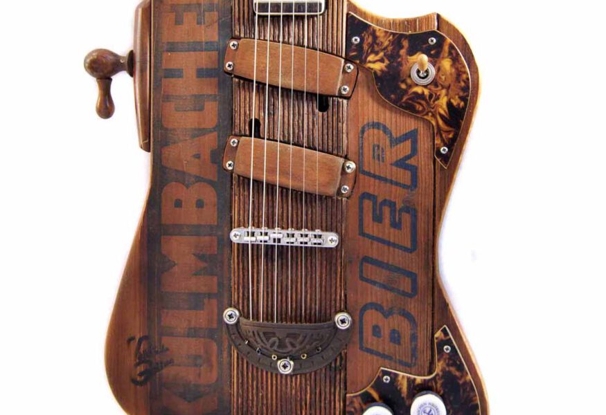 Auch in diesem Fall ging es mit einer alten Holzkiste los. Genauer gesagt mit einer alten Bierkiste der Kulmbacher Brauerei vermutlich aus den 1950er Jahren. Beim Versuch, den kompletten Schriftzug auf die Gitarre zu bringen entstand dann diese doch etwas bizarre Korpusform.