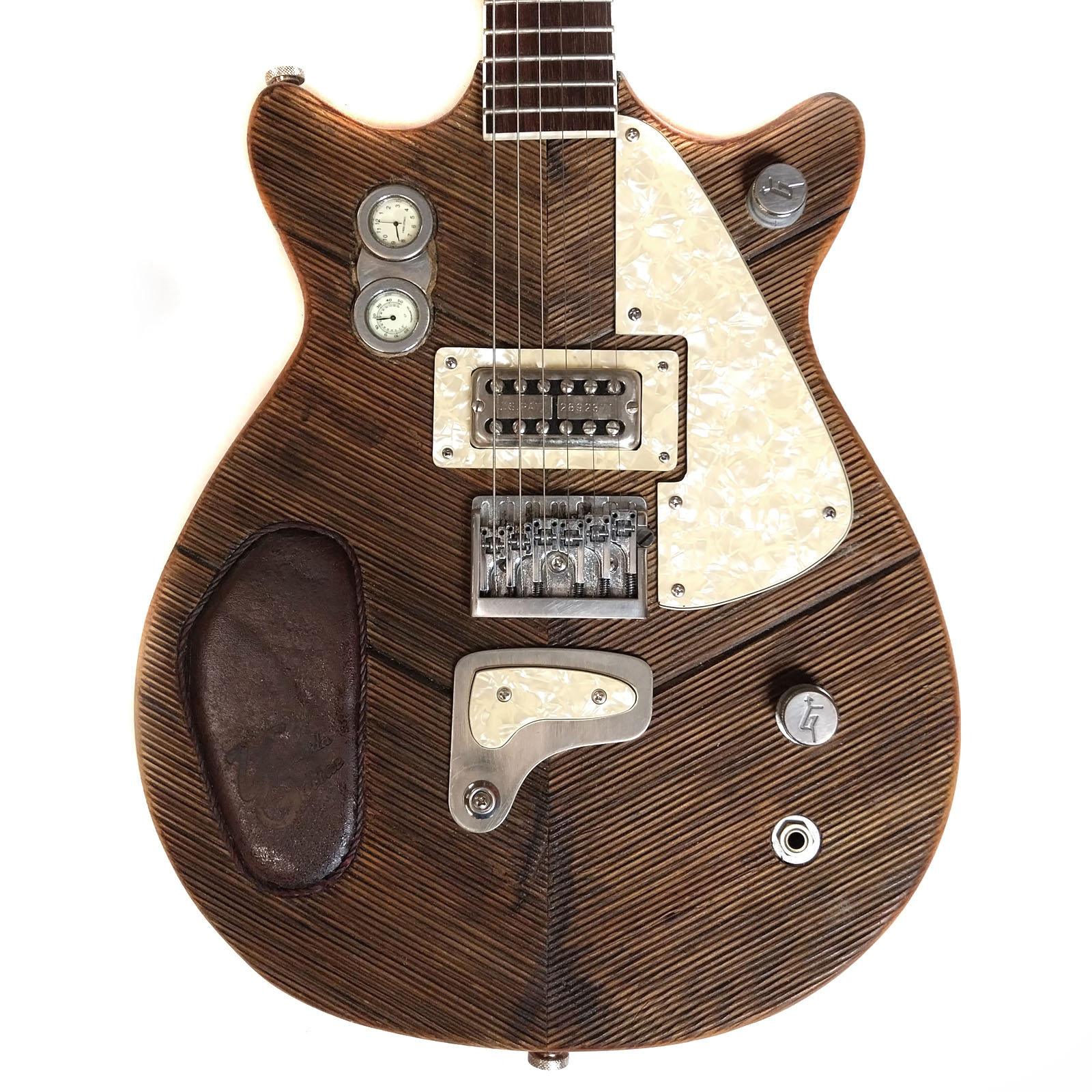 Inspiration für meine Veranda Jetlag war zweifellos die alte Gretsch Duojet von Malcom Young von AC/DC. Hauptsächlich kam es mir auf die coole Form und den Gretsch Filtertron Humbucker an. Die Brücke des Originals war mir allerdings etwas zu windig – hab mich für eine solide Schaller 3D-6 entschieden. Hals und Potiknöpfe stammen übrigens von einer echten Gretsch Gitarre. Die Uhr-Thermometer Kombination war lang an meinem alten Motorrad montiert, ist aber jetzt auch in der Gitarre sehr sinnvoll: man kann genau stoppen, wie lange es dauert bis der Saal kocht! Sie ist meine aktuelle Lieblings-Gebrauchsgitarre: Lässt sich traumhaft spielen und setzt sich im Bandgefüge besser durch als alles was ich bisher in Händen halten durfte.