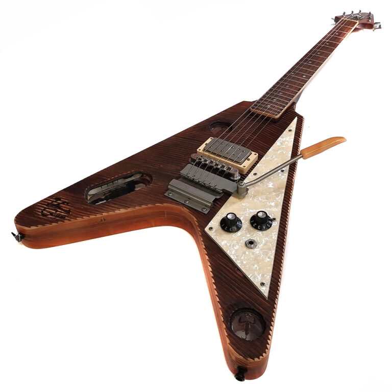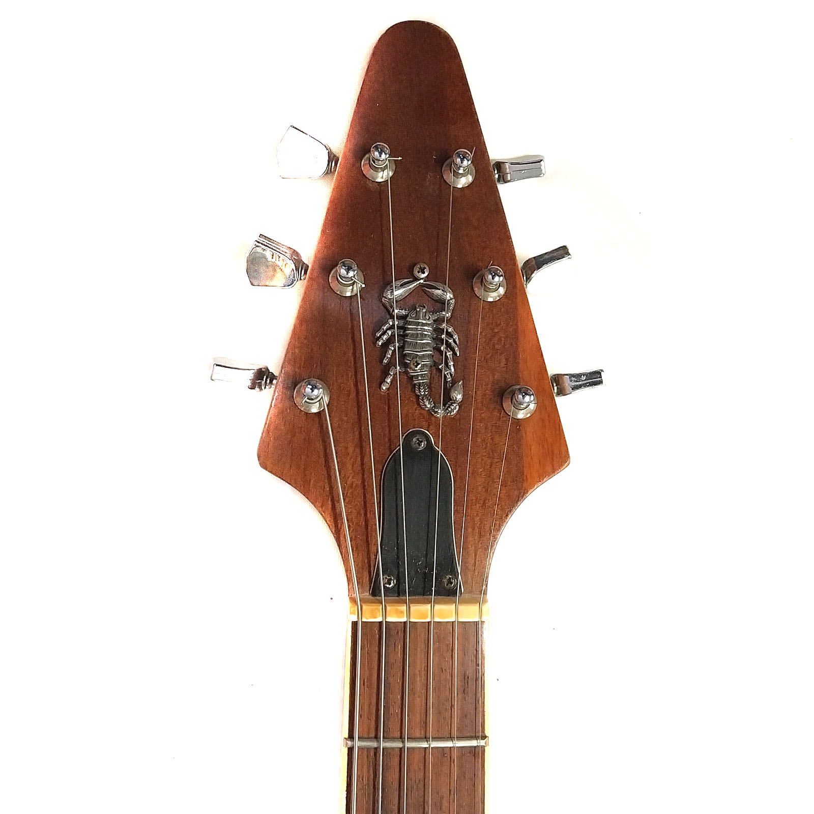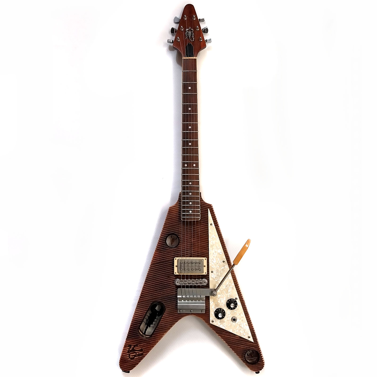 Ein echtes Alleinstellungsmerkmal der Gitarre dürften die drei echten (!) in Kunstharz gegossenen Skorpione sein! Aber bevor jetzt eine Welle des Protestes über mich hinwegrollt: Keines der drei Tiere musste sein Leben für diese Gitarre lassen! Sie hatten alle schon ein Zweitleben – einer als Briefbeschwerer die beiden anderen als Schlüsselanhänger.