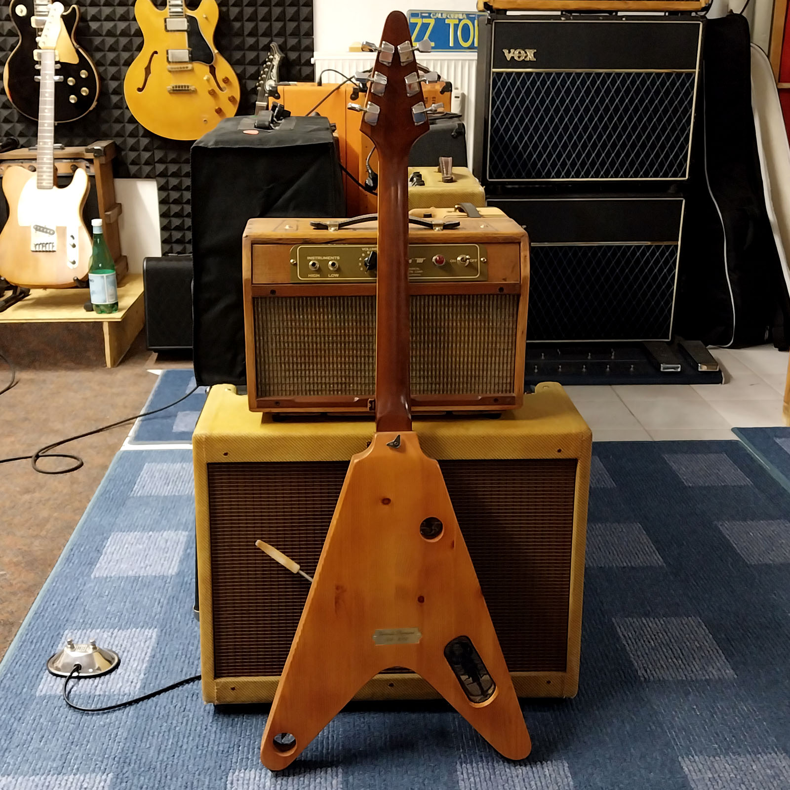 Ansonsten ist das Instrument sehr klassisch gehalten. Ein alter Mahagonyhals, ein Veranda-Body in V-Form, ein old school Vibrola-Tremolo mit Roller-Bridge und ein mächtiger Bareknuckle Humbucker mit der Seriennummer WP0214 sorgen für den amtlichen Sound. Die Spezifikationen des Bareknuckles wären: Bridge Position, Standard Spacing, braided two conductor, long leg mit aged and engraved Nickel Cover! So steht’s jedenfalls auf der Packung geschrieben….