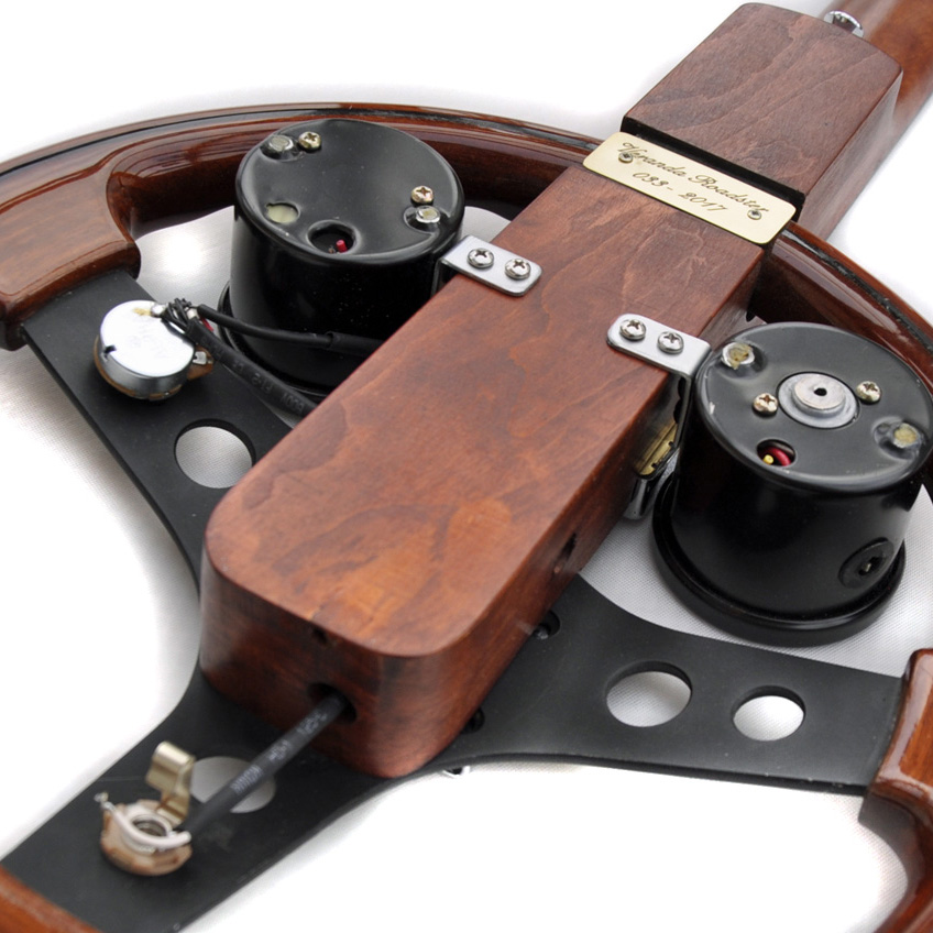 Das Herzstück – sozusagen den Korpus – bildet ein wirklich edles Holzlenkrad italienischer Herkunft! Daran schmiegt sich ein toller Hals mit stylischer Kopfplatte und „Flames“, wie man sie auch gern auf schnelle Autos lackiert, als Griffbrett-Inlays. Um den „Roadster“ – Charakter abzurunden, gibt es selbstredend auch Tacho und Drehzahlmesser im runden Uhrengehäuse am Instrument. Als Hardwarekomponenten aus Chrom wurden imposante Stimm-Mechaniken, ein Humbucker von Gretsch und eine Brücke des US-Herstellers Kramer verwendet. In zwei der drei Sprossen des Lenkrads wurde jeweils das Volumen-Poti mit Chickenhead-Knopf und die Klinkenbuchse eingebaut. Das Handling und der Sound der federleichten Gitarre sind absolut hervorragend, wie auch im (unteren)Video eindrucksvoll zu sehen und zu hören ist. Wieder mal toll eingespielt vom genialen Stanley Nesvarba! Im oberen Video stelle ich die Gitarre in der Livesendung „Wir in Bayern“ des BR bei Dominik Pöll vor.