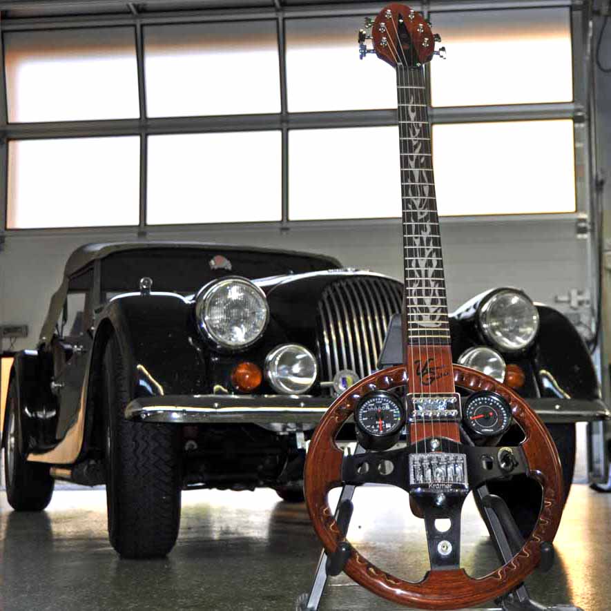 Hier ist nun schon die dritte Weltneuheit im Upcycling-Gitarrenbau von Veranda Guitars am Start! Nach der ersten Metallbaukasten Gitarre (No 014 – Veranda Shining) und der ersten Gitarre aus einem Betten-Lattenrost (No 027 – Veranda Slat Frame) gibt es jetzt auch noch die erste Lenkrad-Gitarre! Ob die Welt darauf gewartet hat und schon reif dafür ist, kann momentan noch nicht abgeschätzt werden. Wer allerdings eine Schwäche für richtig coole Autos wie den abgebildeten Morgan hat, sollte sich doch auch für die neue „Roadster“ Gitarre erwärmen können.