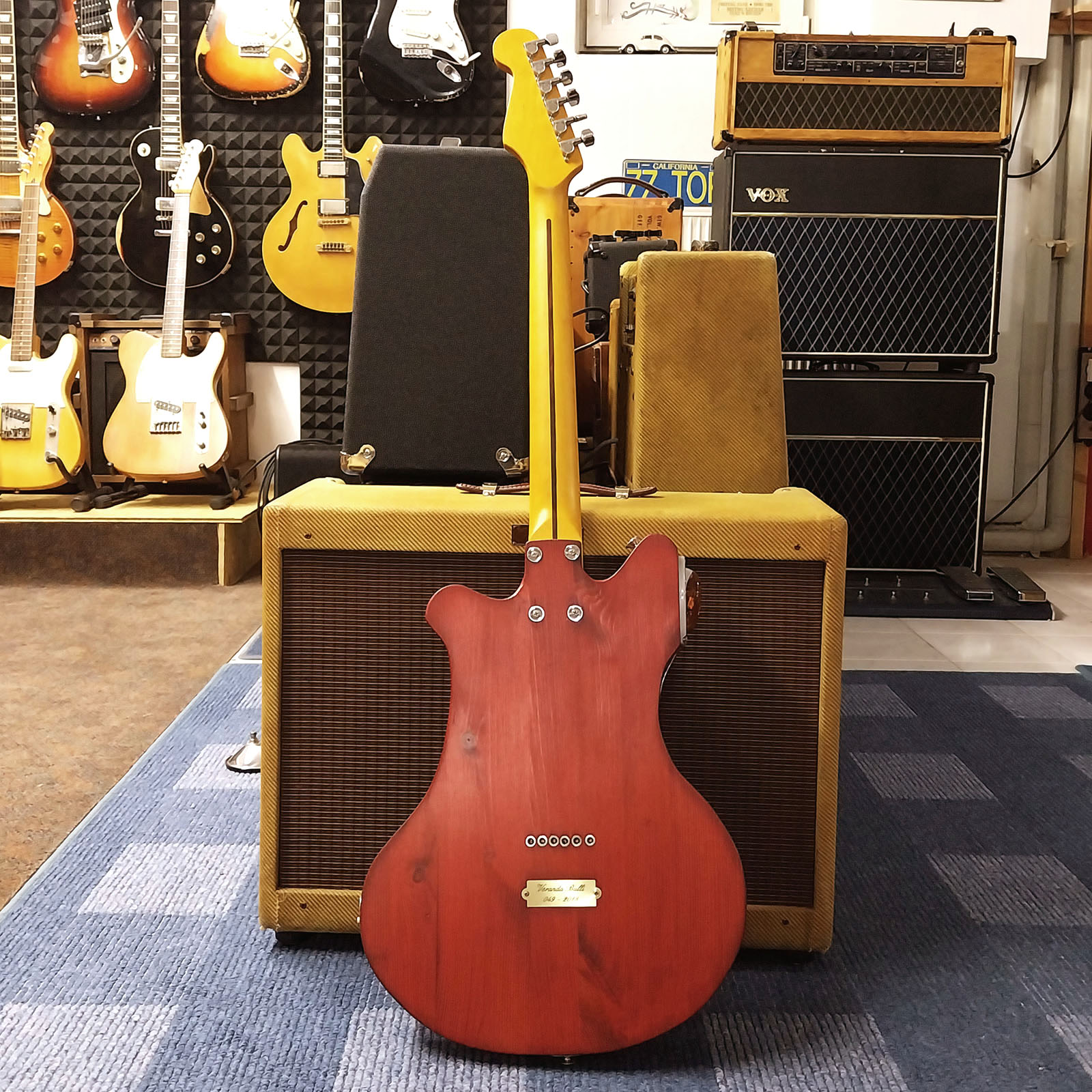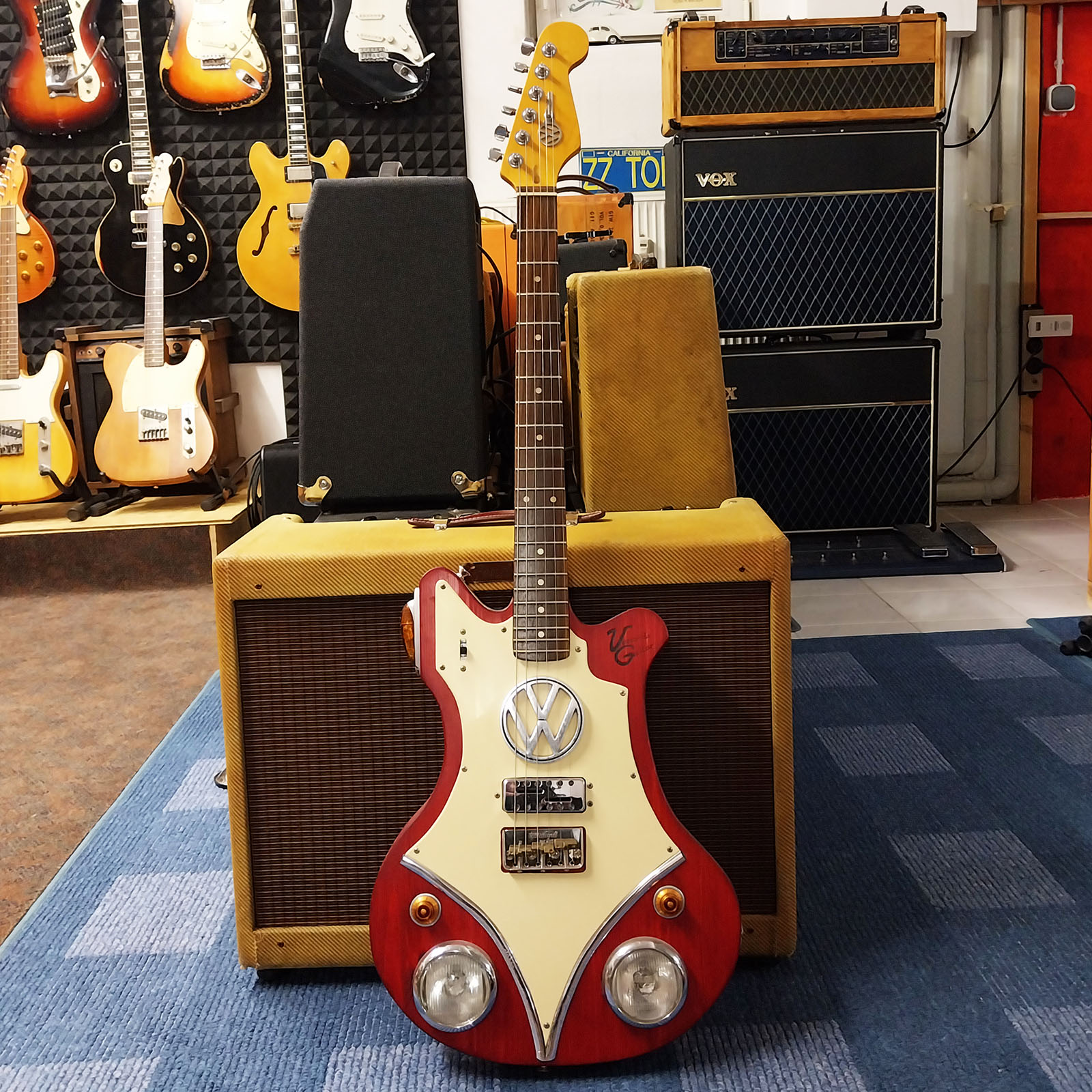 Die beiden alten Fahrradscheinwerfer stammen von Bosch und kommen denen vom Bulli ziemlich nahe. Die beiden Frontblinker werden von Volumen- und Tonepoti mit bernsteinfarbenen Knöpfen und Chromrand nachempfunden. Eine Art Schallloch stellt das originale und sehr alte VW Emblem dar. Die Brücke mit kompensierten Messingreitern ist von Wilkinson, der Humbucker PU und die Mechaniken vom deutschen Hersteller „Schaller“. Die Kopfplatte ziert ebenfalls noch ein echter alter VW Zündschlüssel. Die Saiten werden mittels Hülsen durch den Body geführt, dessen Zargen eine umlaufende Zierleiste fasst. Der Clou ist der kleine Schiebeschalter am oberen Horn: Schiebt man ihn nach hinten, leuchten die beiden Scheinwerfer auf und können beispielsweise für Klarheit auf zu dunklen Bühnen sorgen. Spielt man mal ein extrem wichtiges Solo, kann man den Schiebeschalter nach vor schieben und damit den orangenen Spoiler-Blinker anmachen, um maximale Aufmerksamkeit vom Puplikum zu bekommen. Welche andere Gitarre kann das schon bieten?