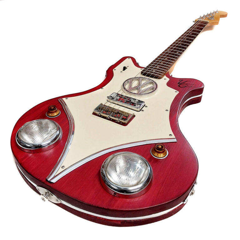 Der alte VW Bulli wurde weder im Dritten Reich entwickelt, noch ist er groß vom Dieselskandal betroffen. Vielmehr war er der Inbegriff der Freiheit in meiner Jugendzeit: Junge Leute aus der ganzen BRD sind damit in Scharen nach Italien, Jugoslawien, Griechenland oder gar durch Afrika oder Indien gefahren. Man konnte einfach nur damit Urlaub machen oder eben versuchen, sich selbst in exotischen Ländern zu finden. Heute genießt er absoluten Kultstatus und vor allem die alten T-1 Versionen erzielen atemberaubende Liebhaberpreise. Schier grenzenlos ist auch die Anzahl der vom „Bulli“ inspirierten Fan-Artikel: vom Topflappen zum Toaster, Gartengrill, Kinderbett, Handyhülle oder Kühlschrank gibt es fast alles in Bulli-Optik. Und jetzt gibt es erfreulicherweise auch noch die bisher fehlende E-Gitarre!