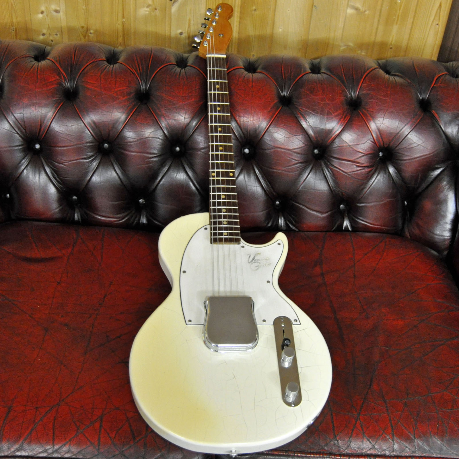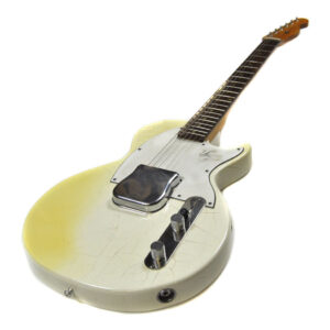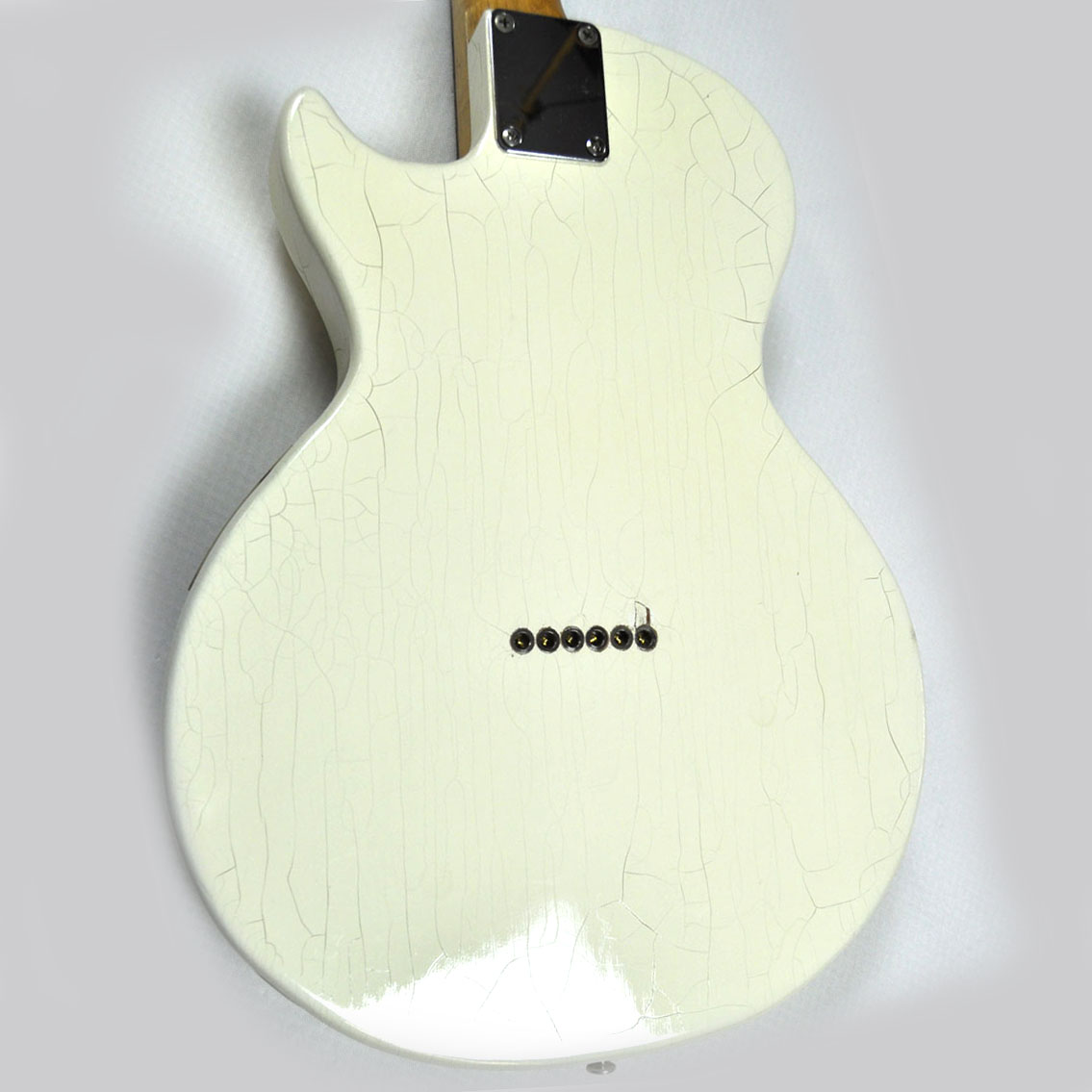 Das kommt nun dabei raus, wenn man eine Les Paul und eine Esquire (Einpickupversion der Telecaster) länger allein in der Besenkammer lässt: die Lesquire! Die Korpusform hat sie von Papa Paul, alles andere von der Mama. Soweit die Kurzversion. Inspiriert wurde ich zu dieser Variante zweifellos von den coolen Fano Gitarren aus Arizona. Die Jungs bauen ihre „Kreuzungen“ allerdings mit LP Kopfplatte und -Pickguard. Ich wollte es noch etwas puristischer. Außerdem wollte ich das Wortspiel „Lesquire“ unterbringen. Deshalb hab ich nur einen Tonabnehmer in der Brücke installiert. Es handelt sich hierbei um den splitbaren DiMarzio DP381W Fast Track Humbucker, der sowohl im Singlecoil- wie auch im Humbuckerbetrieb echt überzeugt! Als die Gitarre dann schon lange fertig war, hab ich den Begriff „Lesquire“ dann doch auch mal gegoogelt und leicht erschrocken feststellen müssen, dass es die Bezeichnung schon bein US Hersteller Crook Guitars gibt. Ich möcht hier nur kurz anmerken, dass ich hier nicht abgekupfert hab, sondern nur eine Idee hatte, die andere auch schon vor mir hatten. Egal. Meine Variante zitiert jedenfalls sehr konsequent eine 60er Jahre Tele in Olympic White mit Rosewoodgriffbrett, weißem 3-lagigem Pickguard und der legendären Brückenabdeckkappe. Ich mag sie sehr!