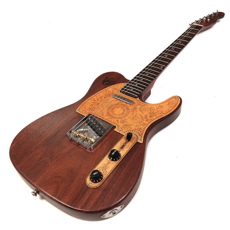 Auch die Basis hierfür hab ich als „Selbstbauprojekt, dass noch ein paar Einstellarbeiten und einer leichten Überarbeitung der Elektronik bedarf“, ersteigert. Ins Auge gestochen ist mir erst mal nur der naturbelassene schöne Mahagonibody. Als ich die Gitarre dann in Händen hielt, wurde so einiges offensichtlich: Der wohl ursprüngliche stratartige Hals wurde mit grober Sägearbeit zum Telecasterhals umgearbeitet. Die Überwurfmuttern der montierten Mechaniken waren so fest angezogen, dass bei einer gleich das Innengewinde abgerissen war. Die Sattelkerben waren viel zu hoch. Die Halstasche war 2mm breiter als der Halsfuß, die Saiten verliefen nicht parallel zum Hals und auch der Halswinkel war nicht korrekt. Das Pickguard wurde sowohl am Halsende wie auch im Brückenbereich grob „nachgearbeitet“. Die Saitendurchführungen im Body wurden freihändig mit der Handbohrmaschine vorgenommen und kamen entsprechend unkontrolliert auf der Rückseite heraus. Die Lötarbeiten waren unter aller Kanone und Masseverbindungen teils nicht wirklich vorhanden. Da war dann wohl jemand mit dem Resultat seiner Arbeit nicht so ganz zufrieden. Tja, was soll ich sagen. Mir macht es jedenfalls großen Spass, solch geschundene Objekte zu zerlegen, nachzuarbeiten und dann neu aufzubauen. Mittlerweile ist aus dem hässlichen Entlein ein richtiger Schwan geworden. Schritt für Schritt hab ich die beschriebenen Mängel behoben, ordentliche Gotoh Mechaniken, eine Wilkinson Brücke mit Messingreitern, ein „Tonerider“ Pickupset, CTS Poties und wie auch schon bei der „Flip“, ein hübsches gelasertes Holzpickguard montiert. Jetzt ist das eine fantastische Tele, die nur noch bei genauerer Betrachtung anhand einiger weniger optischer Spuren ihre einst traurige Vergangenheit erahnen lässt…