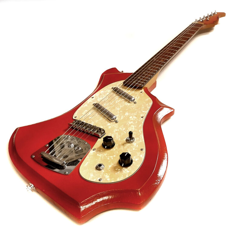 Die Red Surfer ist sozusagen ein leichtes Sommerprojekt. Bei der Hitze draußen wollte ich keinen Korpus selber bauen. Gut, wenn das Materiallager ausreichend gefüllt ist. Da kann man dann auch mal was aus lauter Fertigteilen komponieren, das es bisher nicht gab. Das Kernstück war hier eindeutig ein sehr alter knallrot lackierter Korpus mit einer bemerkenswerten Form. Seine ursprüngliche Herkunft ist mir vollkommen unbekannt, jedoch gibt es ähnliche Formen aus Osteuropa (Orpheus), Italien (EKO) oder Guild (USA). Mein Body dürfte wohl am ehesten aus dem Osten kommen – allein die rote Farbe läßt schon darauf schließen. Lieber rot wie tot. Als Hals kam ein weiterer von „Axl“ zum Einsatz. Axl war mal vor vielen Jahren ein Billiglabel. Die Gitarren ansich waren nichts Besonderes, die Hälse fand ich mit dieser urigen Kopfplatte aber immer klasse. Darum haben auch meine Schorschbräu-, Hansa-Lübeck– und Casterix-Gitarren solche Hälse! Ein altes „Jaguar“-style Tremolo hat fast perfekt in die vorhandene Fräsung gepasst. Das Pickguard hab ich handgefertigt und mit zwei „Kent Armstrong“ Lipstick Tonabnehmern bestückt. Alles andere stammt aus diversen „Krabbelkisten“. Mir gefällt die abgefahrene Optik der entstandenen Gitarre allerbestens und Sound und Handling passen mir auch sehr gut. Viel Gitarre mit relativ wenig Aufwand & Einsatz! Passt!
