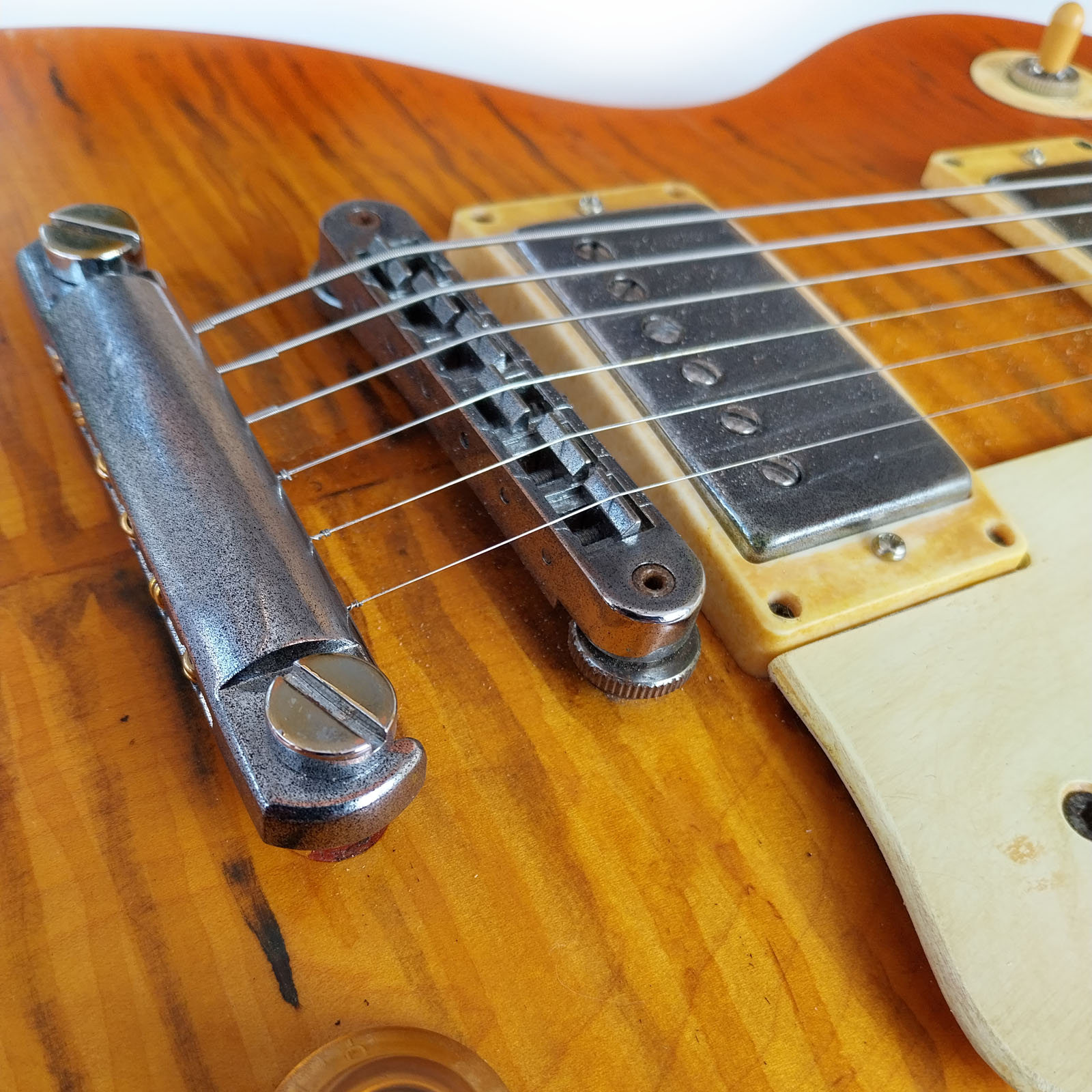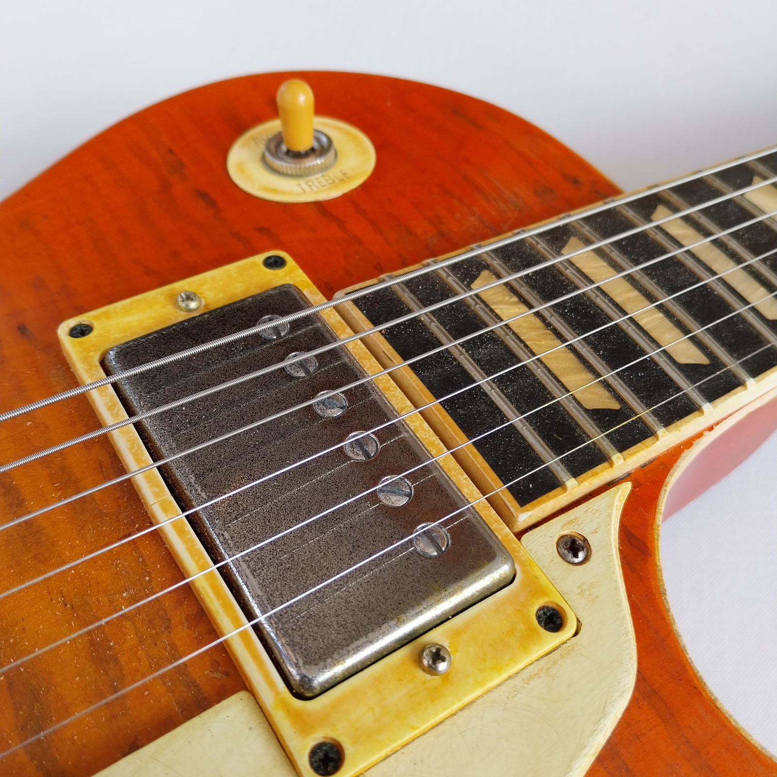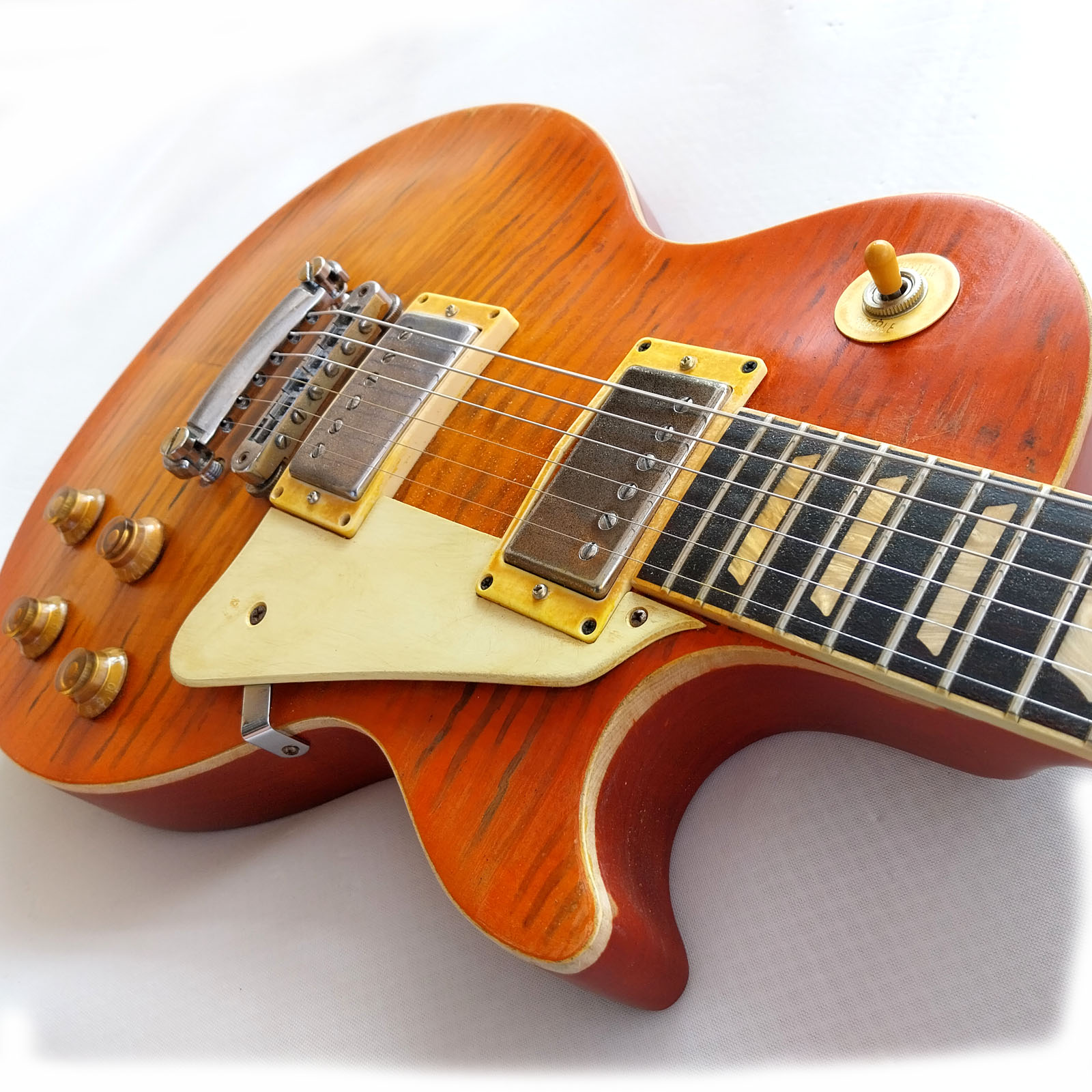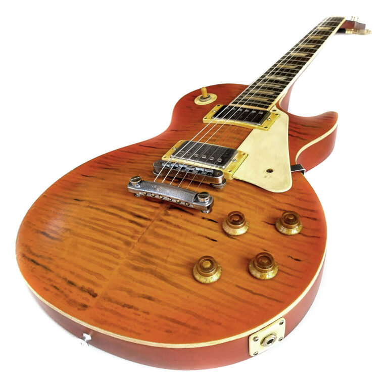 Im Jahr 2019 brachte Gibson die limitierte Les Paul Studio mit Fretboardbinding in „Tangerine Burst“ heraus. Sie war gebraucht um die 1000 Euro zu kriegen und hat sich perfekt geeignet um sie einigermaßen in eine eher klassische „59er Burst“ zu verwandeln. Was alles verändert wurde, kann das geübte Auge vermutlich gut den Fotos entnehmen …