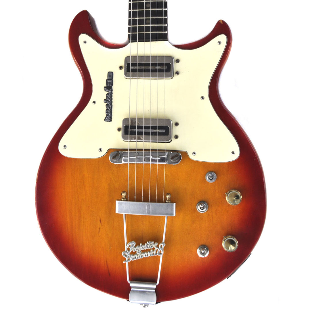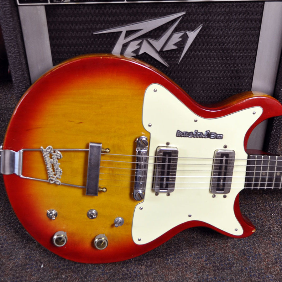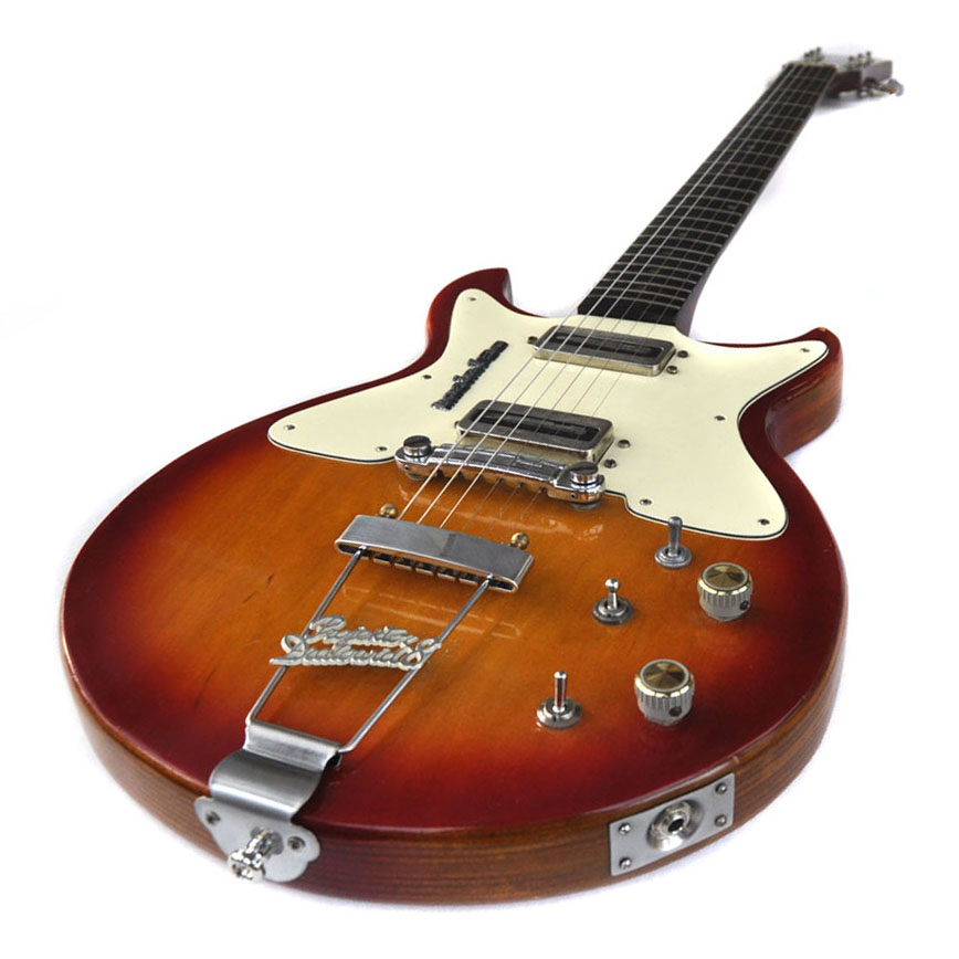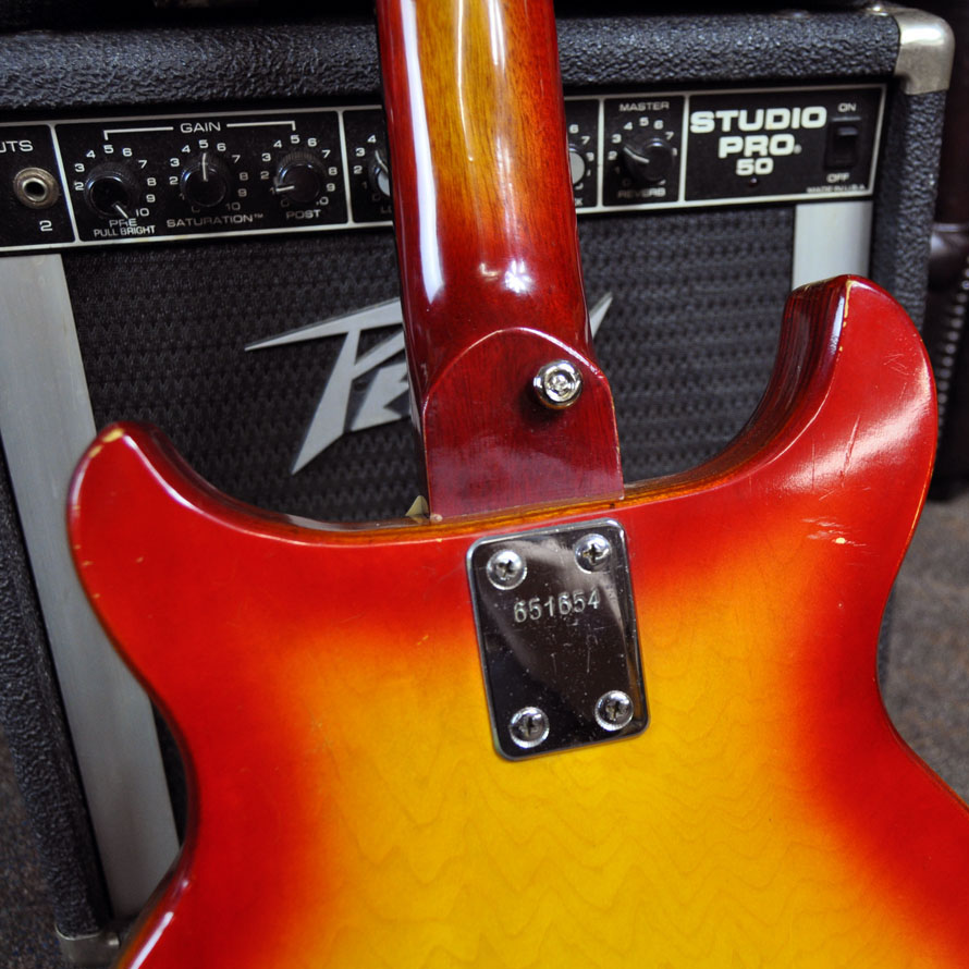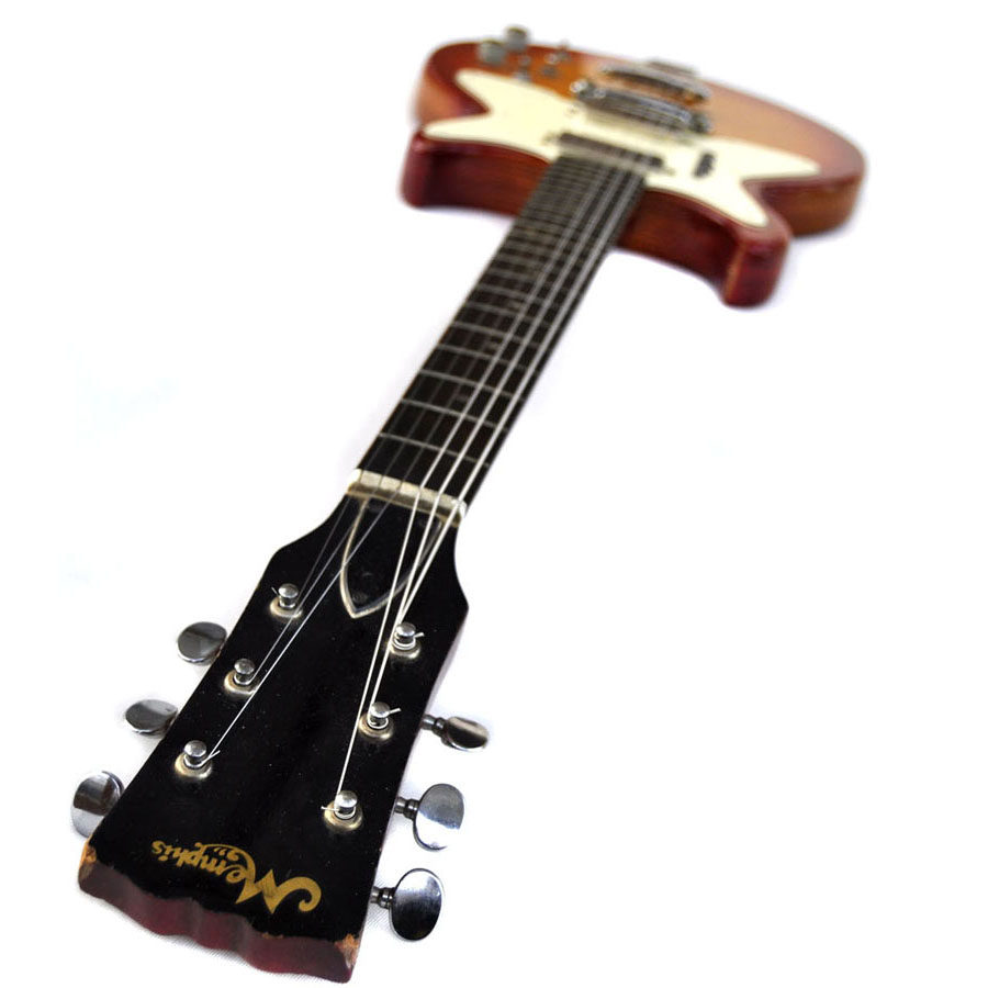Wie schon bei vielen anderen meiner Gitarren, hab ich auch hier wieder ein Instrument aus lauter wirklich alten Teilen neu zusammengestellt. Einzig das Pickguard wurde aus einem neuen Rohling handgemacht. Der Trapezsaitenhalter stammt von einer alten Archtop Gitarre, die Tonabnehmer samt Poties von einer alten Klira Solidbody und die Schalter, Potiknöpfe und Embleme aus meinem reichhaltigen Teilefundus. Brücke, Mechaniken und die schöne Sunburstlackierung sind original Memphis/Japan.