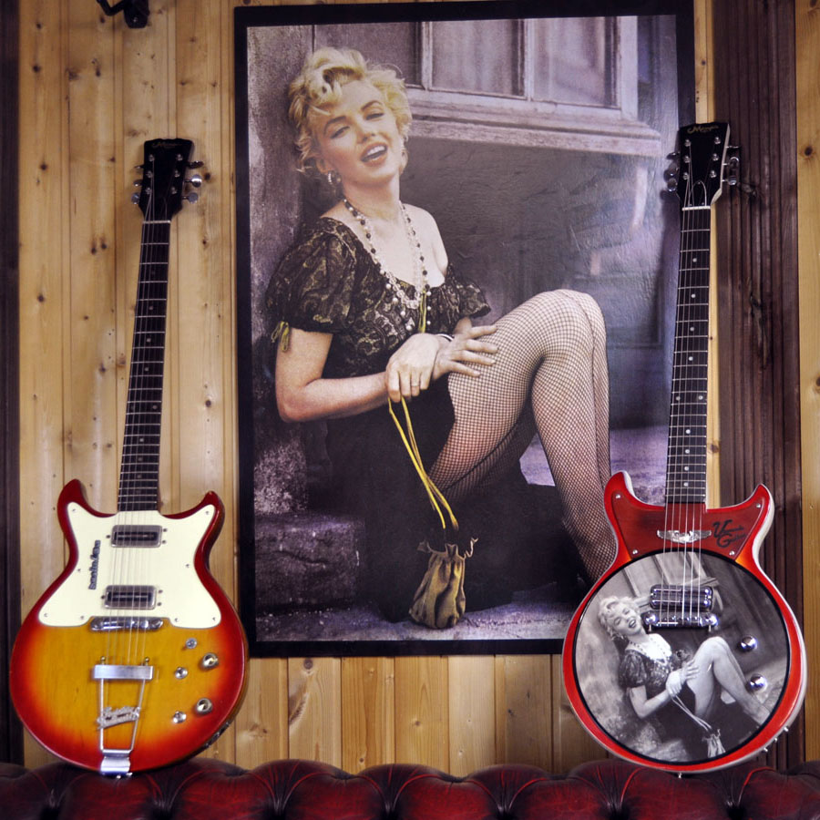 Der aufmerksame Beobachter hat vielleicht bemerkt, dass ich vor vier Jahren schon einmal eine „Memphis“ Gitarre hier vorgestellt habe: Die „Marylin“ von 2017 ist ebenfalls so ein Exemplar. Das war ursprünglich eine Art Les Paul Special Doublecut mit zwei P-90 Pickups aus japanischer Fertigung aus der Zeit um etwa 1970 gebaut. Die originalen Tonabnehmer hatten solide Metallkappen und waren auch etwas größer als reguläre P-90er. Einer dieser seltenen Exemplare befindet sich jetzt in der „Veranda Düsseldorf SG“ (Foto rechts), zwei weitere in der „Veranda Dual“. Gute alte Teile! Der erste „Memphis-Torso“ wurde mit Marilyn Picture Disk und Lipstick Humbucker veredelt, der zweite jetzt zu dieser stimmigen Retrogitarre modifiziert.