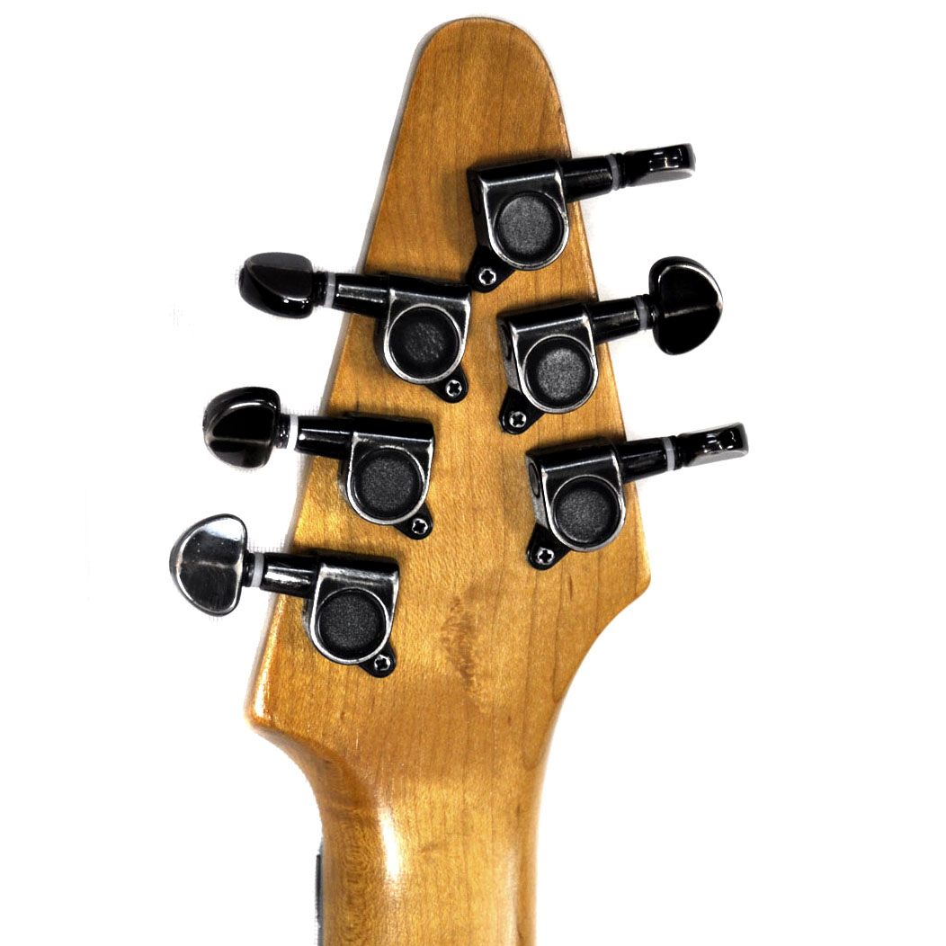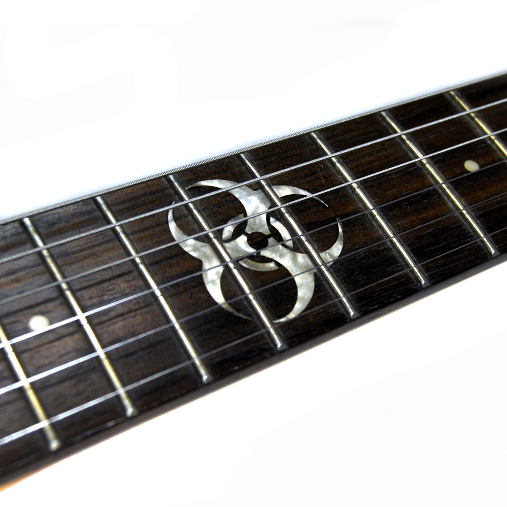 Da die „Basisgitarre“ völlig ohne Markenbezeichnung zu mir kam, ließ sich bisher nicht nachvollziehen, wer diese Heavy Gitarre ursprünglich hergestellt hat. Allein schon die eigenwillige Korpusform hat mir sehr gut gefallen. Zusätzlich überzeugt sie aber auch mit 24 Bünden, einem „Biohazard“ Inlay im 12. Bund und einem „Freudlos“ Vibrato. Diese gehässige Bezeichnung des Floyd Rose rührt ja bekanntlich von der etwas umständlichen Einstellprozedur dieses Types. Zum Benutzen ist es allerdings schon ein Traum: Absolute Stimmstabilität auch bei unkontrolliertesten Einsätzen! Super!