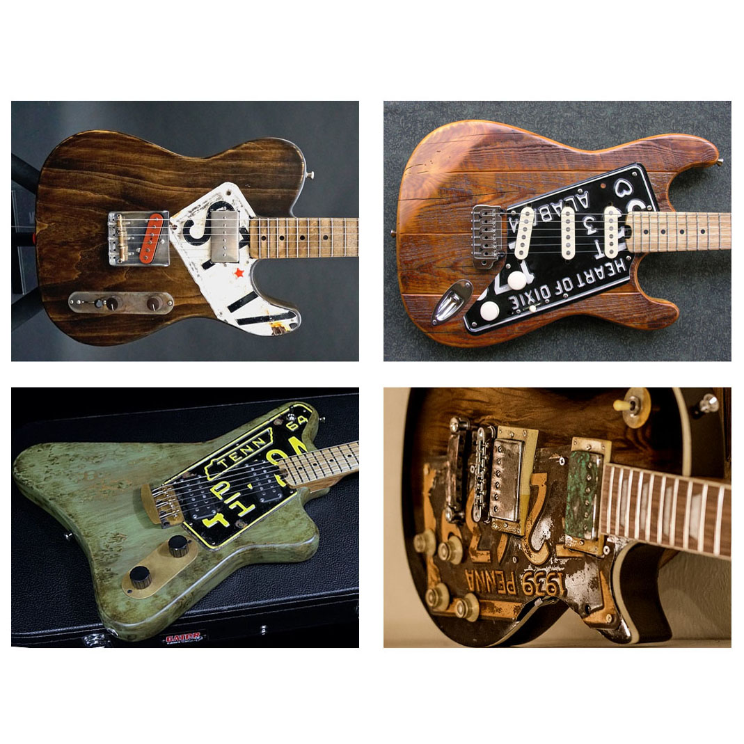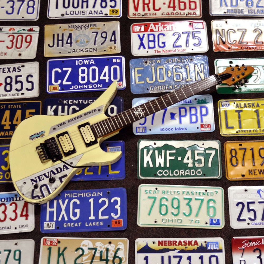 Mit der Nevada hab ich gleich zwei seit längerem gehegte Ideen umgesetzt: Eine US-License Plate als Pickguard verwenden und endlich mal eine Gitarre mit Floyd Rose Vibrato (auf)bauen. Nichts von beidem ist zwar wirklich neu oder allzu originell, hat aber großen Spaß gemacht. Einige Gitarrenbauer haben ja bereits tolle Instrumente mit einem US-Nummernschild als Pickguard kreiert (ein paar Beispielfotos hab ich aus dem Netz gefischt, die Inhaber der Urheberrechte mögen es mir nachsehen!). Jetzt ist eben noch eine weitere dazugekommen.