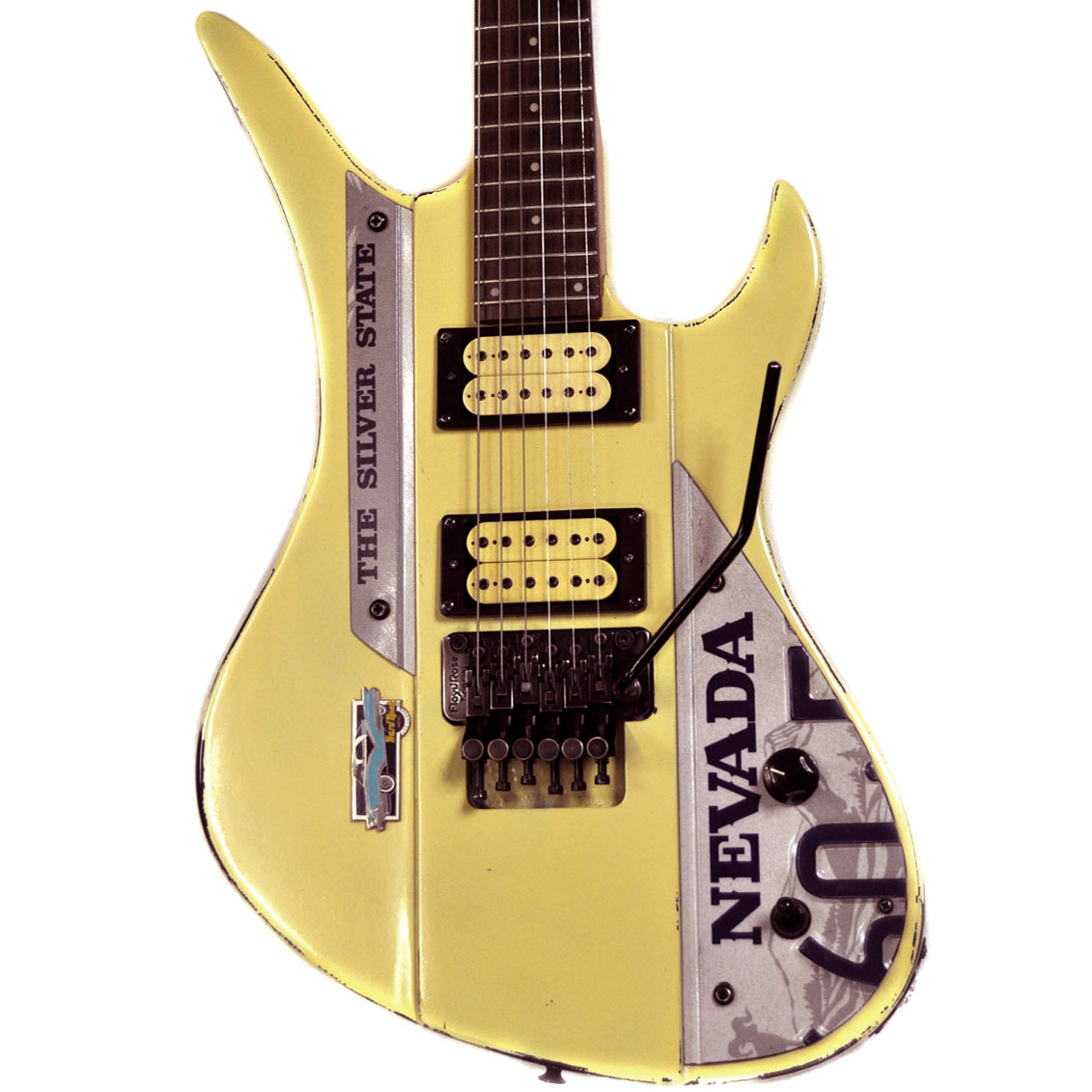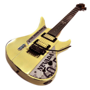 Aus dem unten abgebildeten neuwertigen Nummernschild aus dem Silver State Nevada hab ich zwei Elemente ausgesägt, bearbeitet und den Fotos entsprechend an die Gitarre montiert. Der ursprünglich schwarze Korpus wurde in einer Art „Wüstengelb“ lackiert und mit dezenten Gebrauchsspuren versehen. Ein stimmiger „Hard Rock Hotel Las Vegas“ Pin ziert die Stelle neben dem Vibrato. Auch den Hals samt Kopfplatte hab ich mit einem „tinted“ Lack bearbeitet und ihm damit ebenso wie der gesamten schwarzen Hardware einen coolen „Used Look“ verpasst.
