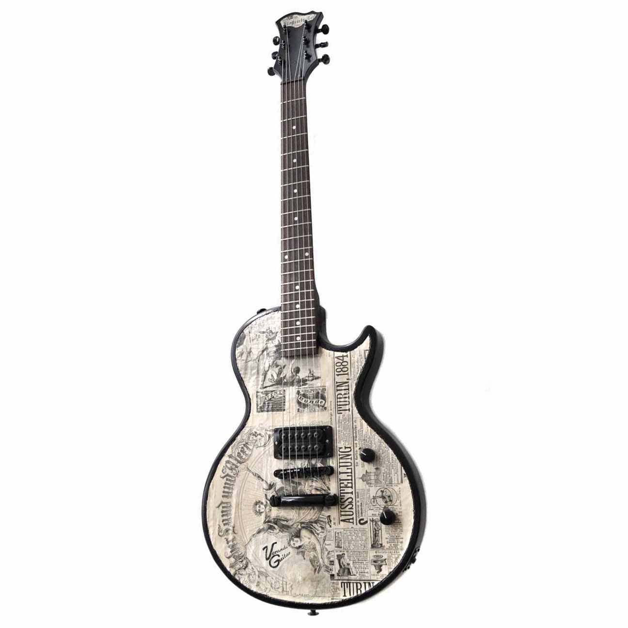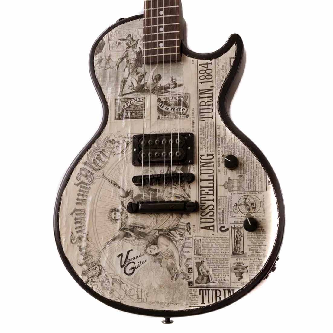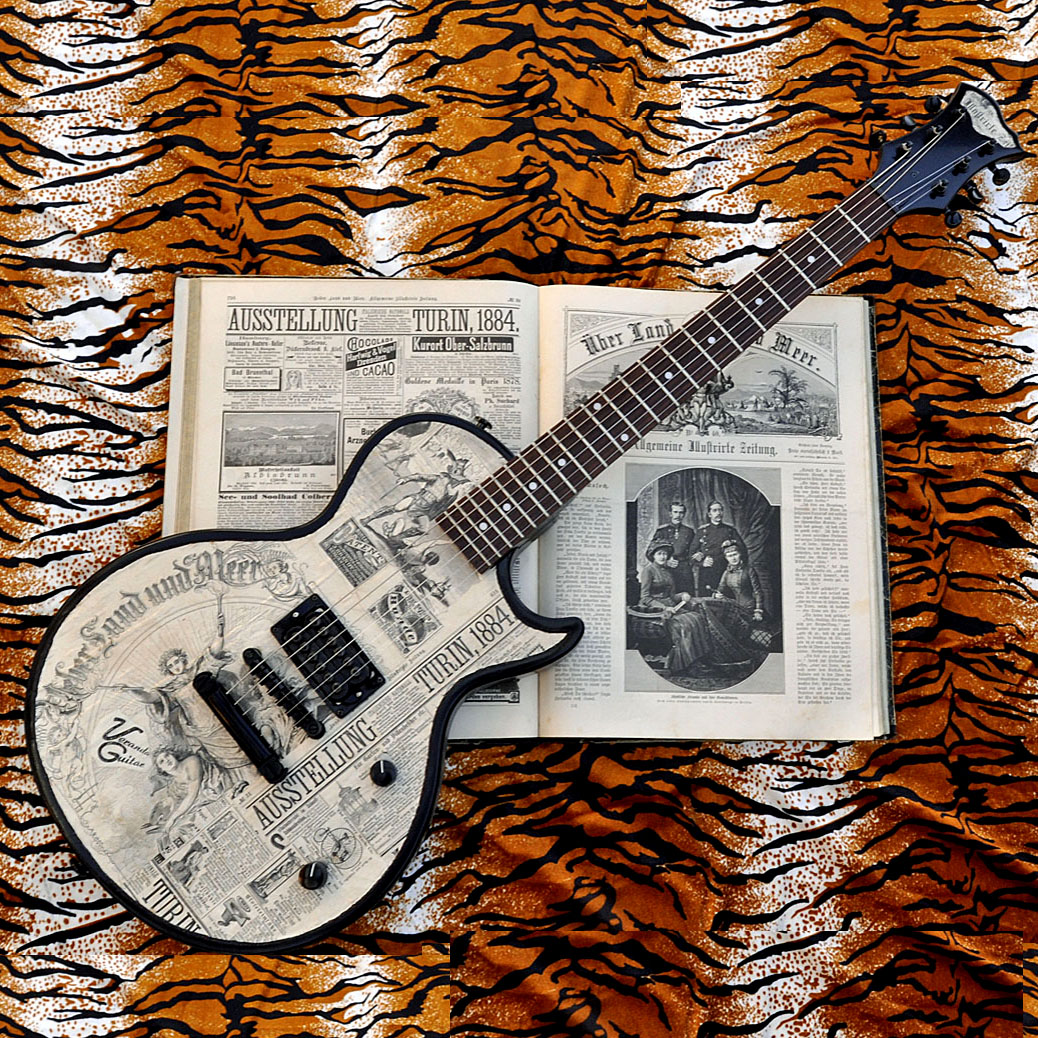 Die zweite Gitarre meiner „Zeitungs Serie“. Was es genauer damit auf sich hat, kann man gut im Artikel über die „Veranda Düsseldorf 1880“ nachlesen. Im Jahr 1884 fand eine große internationale Kunst- und Gewerbeausstellung im italienischen Turin statt. Eine seltene originale Gedenkmedaille zu diesem Ereignis von 1884 wurde noch zusätzlich in eine gerahmte und signierte Collage (60 x 100 cm) mit integriert. Weltberühmt ist Turin wegen seines rätselhaften Grabtuches. Und das war sonst noch wichtig 1884: Otto von Bismark hat die gesetzliche Unfallversicherung in Deutschland eingeführt, in Neumarkt in der Oberpfalz wird die erste Fahrradfabrik Europas gegründet, die Express Werke, der deutsche Kaiser Wilhelm I. legt den Grundstein für das Berliner Reichstagsgebäude, das nach den Plänen des Architekten Paul Wallot errichtet wird und der coole Mark Twain schreibt The Adventures of Huckleberry Finn (Die Abenteuer des Huckleberry Finn).