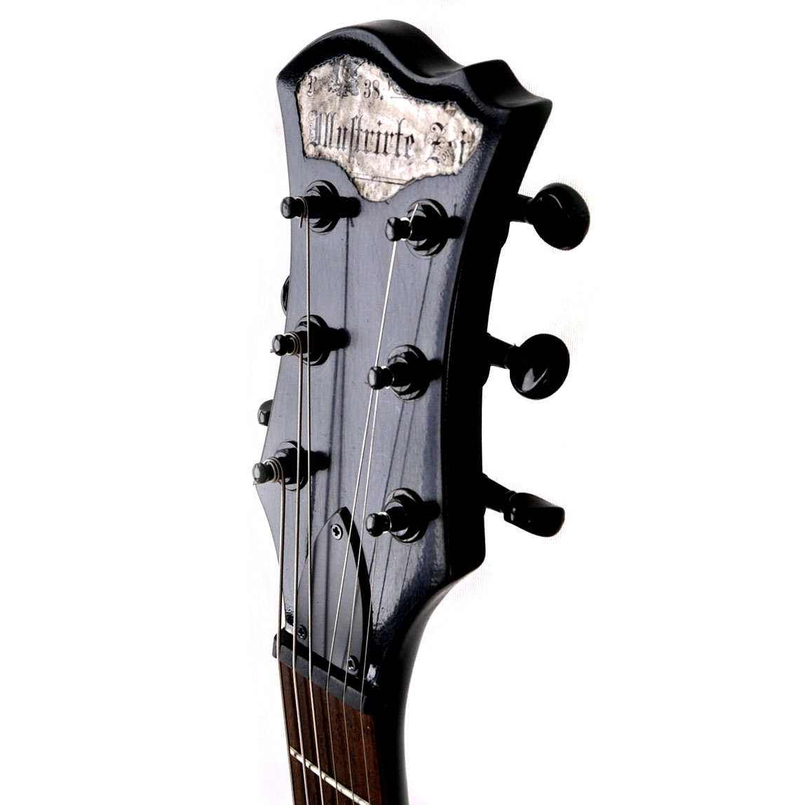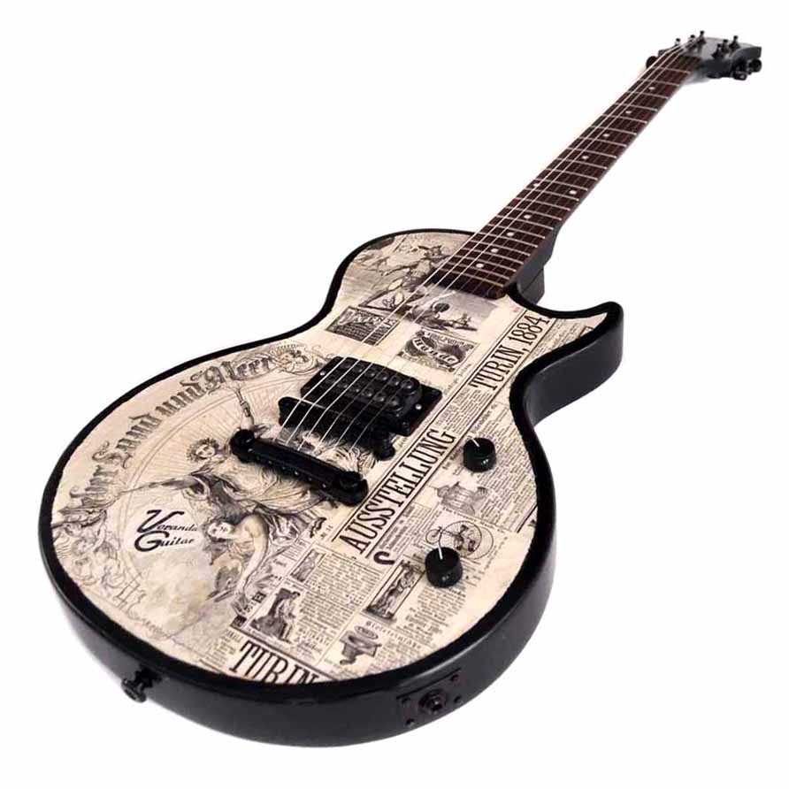 Die Decke der Gitarre besteht aus einer Collage unterschiedlicher Zeitungsausschnitte und -inserate aus dem Jahr 1884!