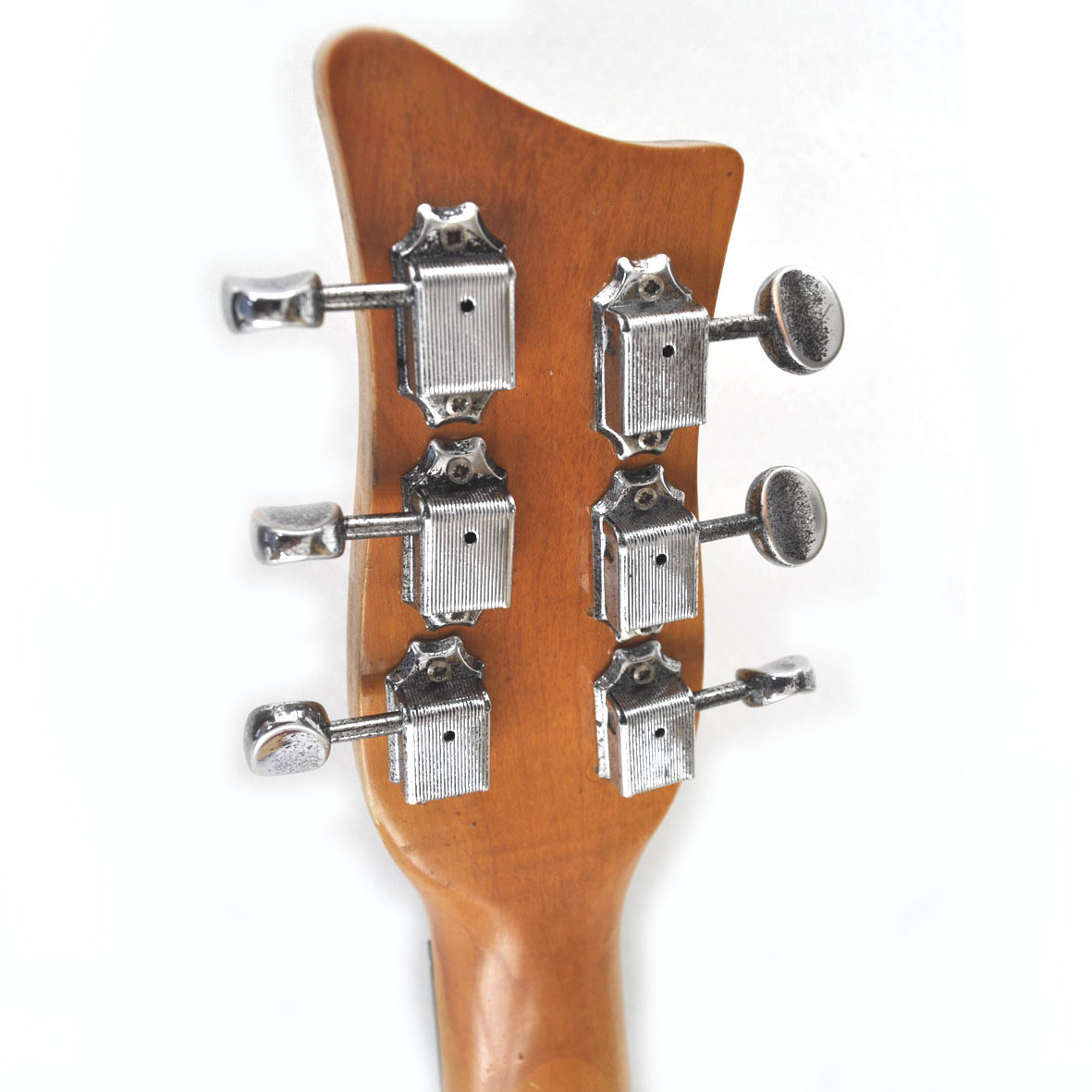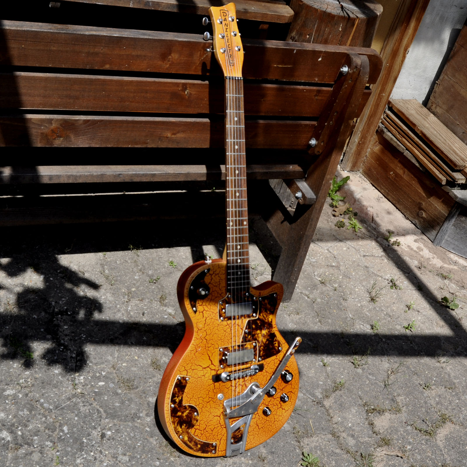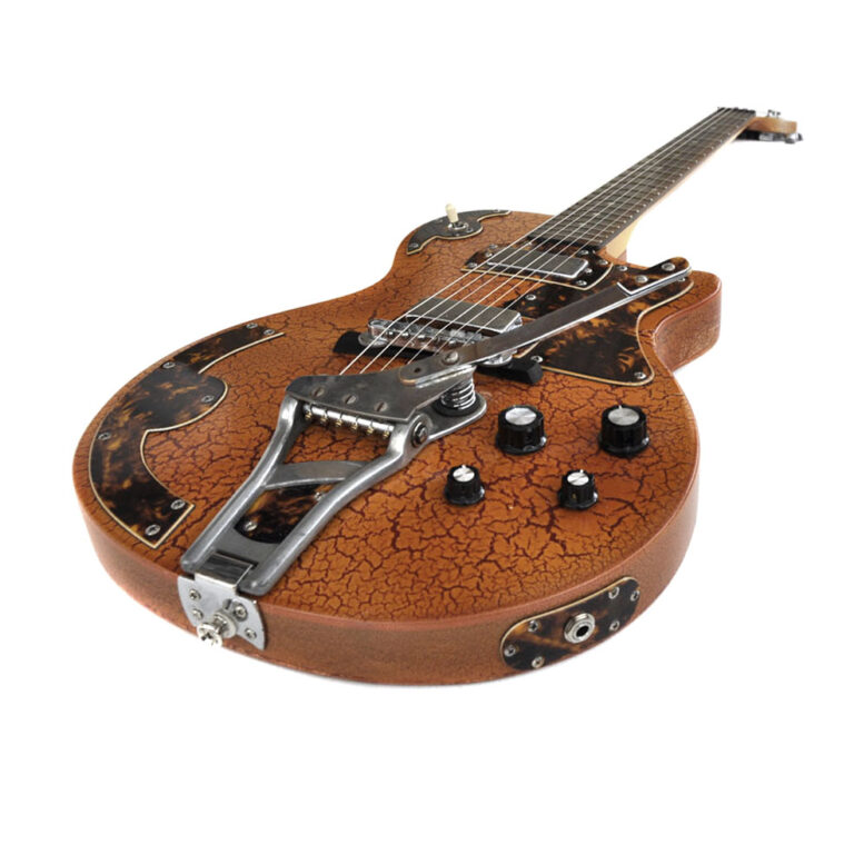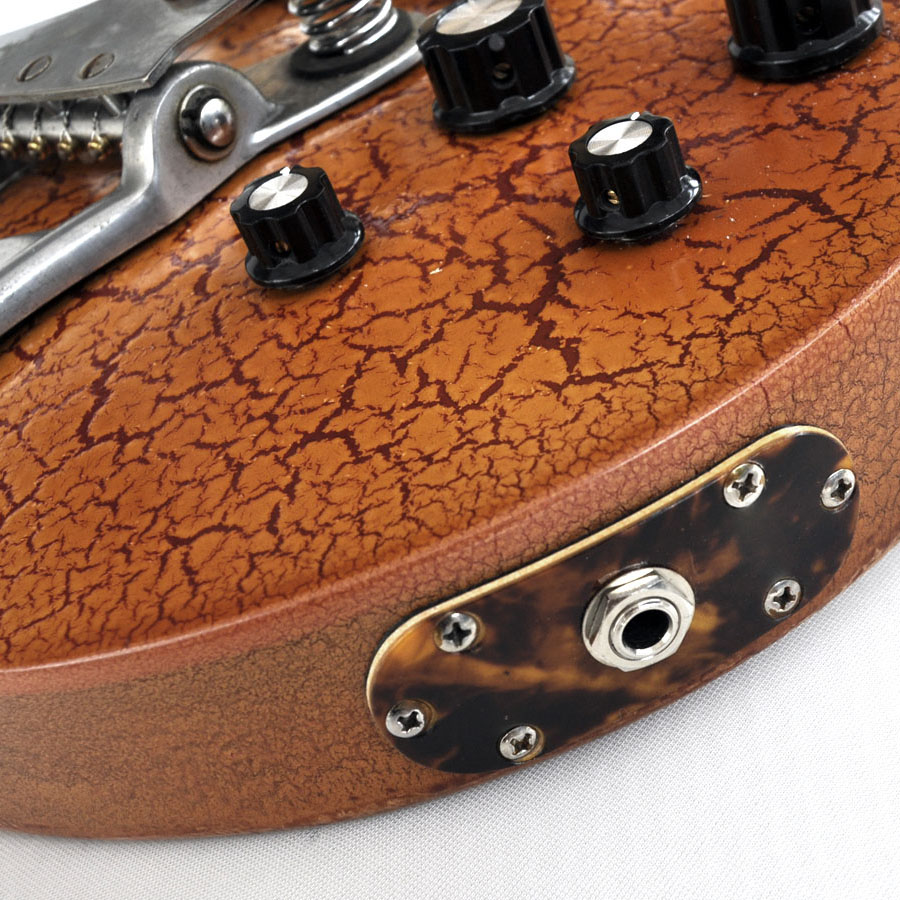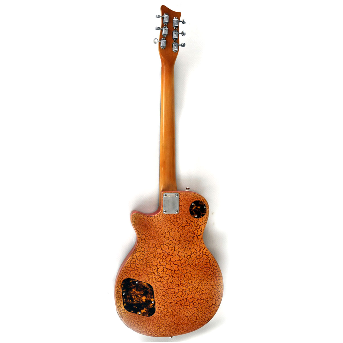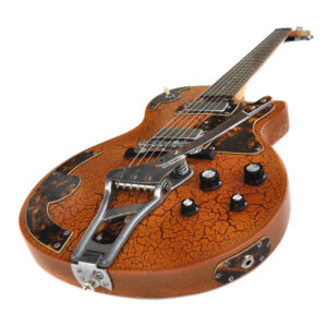 Im Stile der 1950er Jahre kommt diese Schönheit daher. Ein neuerer Danelectro-Hals wurde an einen Les Paul-artigen und sehr leichten Erlekorpus, in gretschig-orangenem Reißlack gefinished, geschraubt. Die coole Optik der Lackierung wird unterstützt von zehn handgefertigten Tortoise-Anbauteilen: Pickguard, Pickup-Rahmen, Switch-Rahmen, Arm-Rest, zwei Tremolo Applikationen, die Buchsenplatte und zwei Elektronikfachabdeckungen zieren den Body. Zwei Mini-Humbucker sind im klassischen Gibson-Stil verdrahtet, ein altes Schaller Tremolo und eine Old-School Bridge dienen der Saitenaufhängung. Wer ein auffälliges und gut spielbares und klingendes Instrument sucht, ist mit diesem tollen Einzelstück bestens bedient!