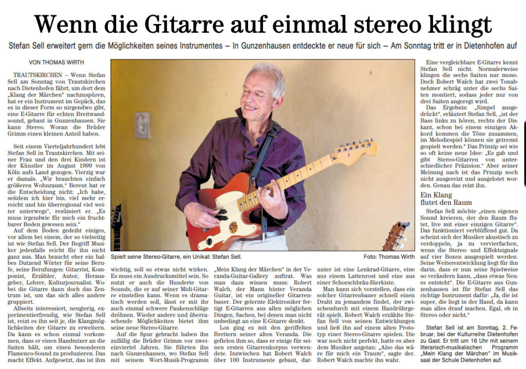 Im November 2022 trat der mir bis dahin noch nicht bekannte Gitarren-Virtuose Stefan Sell im Rahmen des Gunzenhäuser Erzählfestes in der Veranda-Guitar-Gallery auf. Er ist Konzertgitarrist, Komponist, Autor, Erzähler und Produzent. Nach einer klassischen Gitarrenausbildung bereiste er Spanien mit dem Flamenco-Theater fuegos de miel. Mitte der 1990er Jahre war er Chefredakteur des bundesweiten Kulturmagazins foglio. Sell ist Preisträger des 1. Kölner-Open-Mike-Wettbewerbs. Er initiierte Kompositionsprojekte im Bereich der Neuen Musik und war als Musikalischer Leiter und Klangregisseur an einem Projekt der Staatsoper Stuttgart beteiligt. Musikalisch begleitete er die Lyrikprogramme des Rezitators Lutz Görner und sorgte für die Musik der Literaturstunde im Circus Roncalli. Nach seinem Konzert in Gunzenhausen sah er sich sichtlich beeindruckt meine Gitarrensammlung an. Speziell mein Stereoumbau einer alten Teisco Spectrum 5 (letztes Foto Mitte) hatte es ihm angetan. Nachdem wir uns fachlich und menschlich hervorragend verstanden, kam es im Laufe einiger Begegnungen zu einer Auftragserteilung zum Bau einer speziellen „Stefan Sell Stereo“ Gitarre. Sie sollte die Bespielbarkeit einer guten Fender und eben eine absolute Trennung der drei hohen von den drei tiefen Saiten aufweisen. Das Ergebnis seht ihr hier. Verbaut wurde ein erstklassiger Strat-Hals, ein kupferfarbener Telebody in „Relic-Optik“ und zwei rare Keystone USA Noiseless Pickups (by Bill Lawrence), die über ein Stereopoti auf zwei getrennte Ausgangsbuchsen geführt werden. Die dadurch erzielbaren Stereoeffekte an zwei Amps sind umwerfend! Im Video unten zu sehen ist das Experimentalstück „Oreja Del Alma“. Der angehängte Presseartikel über Stefan und seine Gitarre stammt aus der „Fränkischen Landeszeitung“ vom 31. Januar 2025 (mit freundlicher Genehmigung der FLZ)