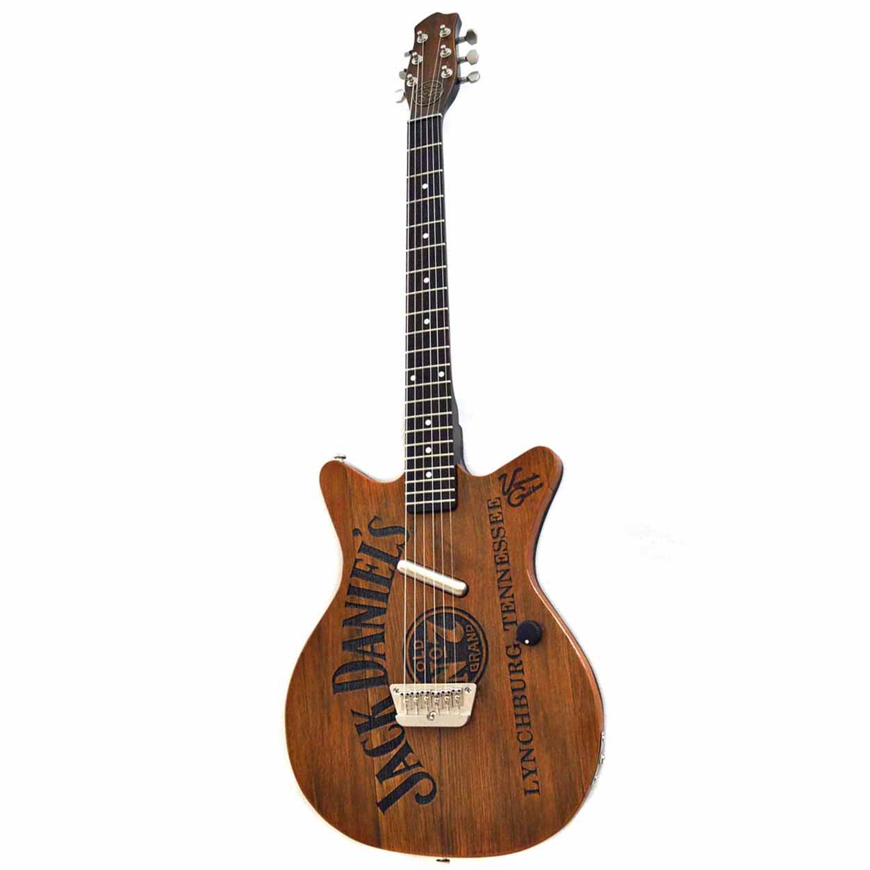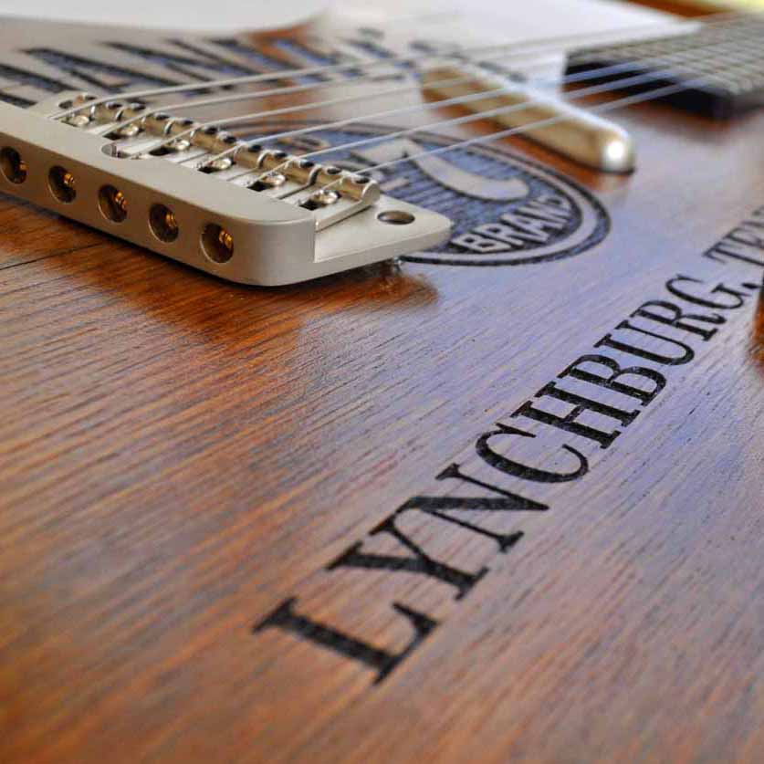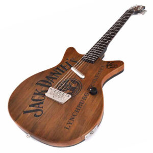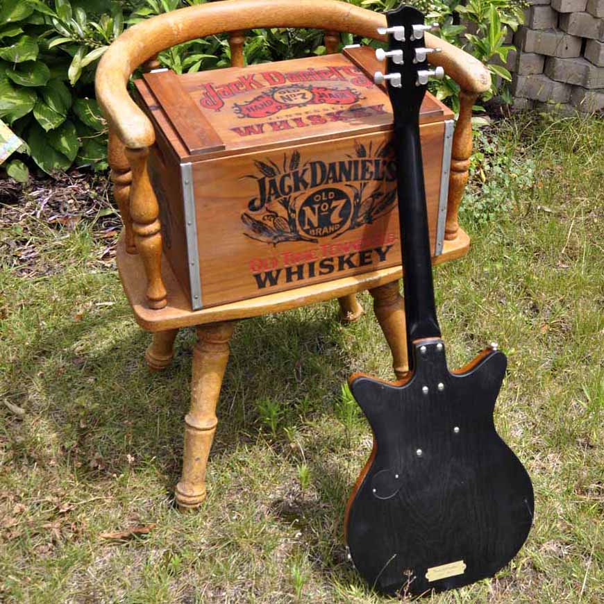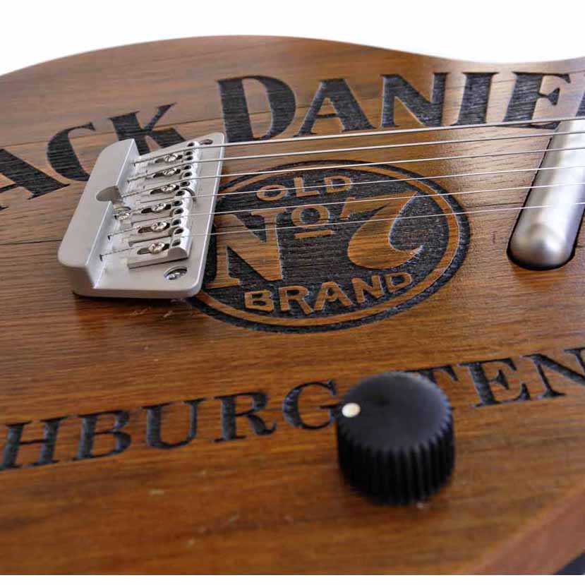us designerischen Gründen hab ich das Poti so platziert, dass der Punkt des Knopfes ganz aufgedreht genau am Komma zwischen „Lynchburg“ und „Tennessee“ steht. Der linke Rand der Brücke unterstreicht das „K“ von „JACK“ und der Lipstick Tonabnehmer in der optischen Verlängerung des „L“ von „DANIEL’S“ – den beiden letzten Buchstaben des Vor- und Nachnamen des Firmengründers.