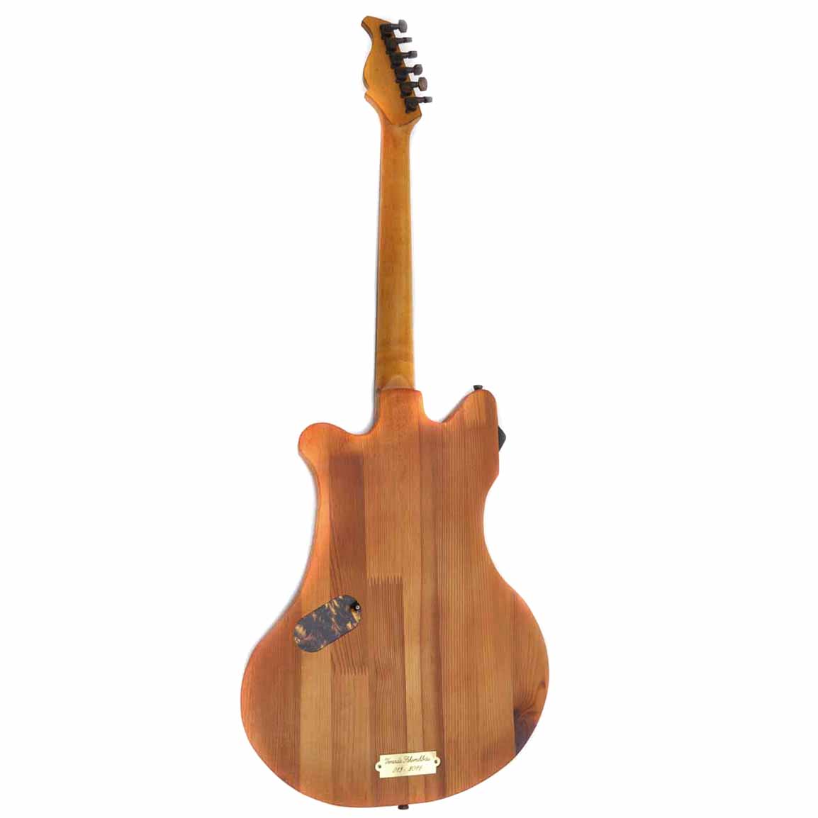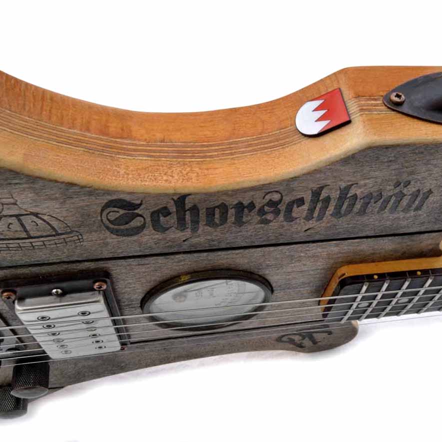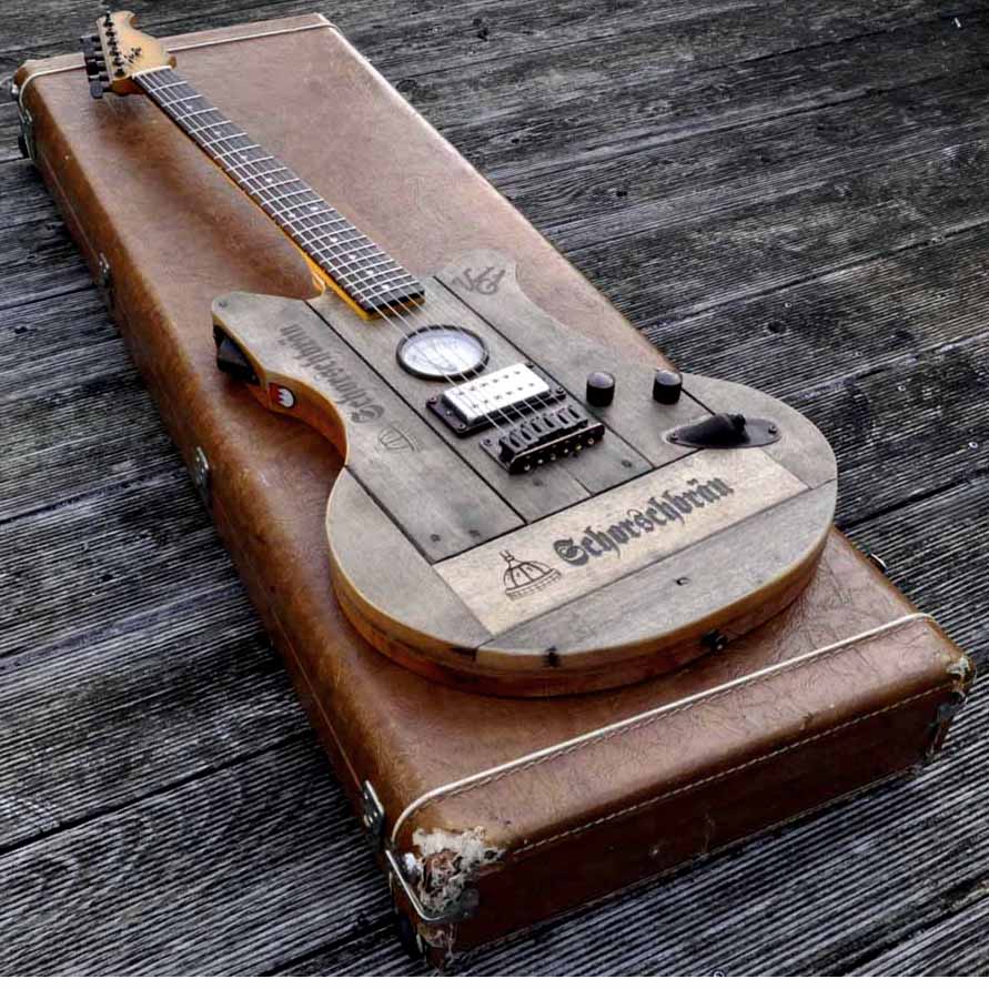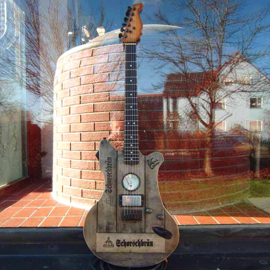 Die Deckbeplankung der Schorsch-Gitarre und das komplette Gehäuse des Verstärkers wurden aus echt abgerockten alten original Bierkisten hergestellt, die schon seit 10 Jahren nicht mehr im Umlauf sind. Ein altes AEG Manometer und stimmige Kupferhardware runden die Optik der Gitarre ab! Der Pickup ist ein DiMarzio DP156 „from hell“ mit einer raffinierten Regelung: 1 Poti ist das Mastervolumen und mit dem Zweiten kann eine Spule des Humbuckers dazu- oder weggeblendet werden. Stellt somit sowohl einen perligen Singlecoil- wie auch einen rotziger Humbuckersound zur Verfügung!
