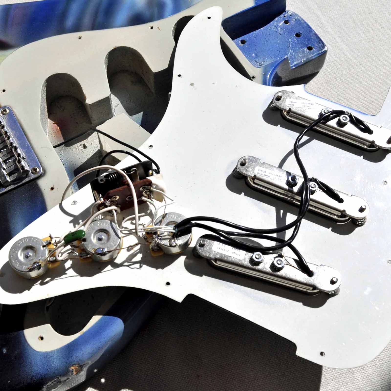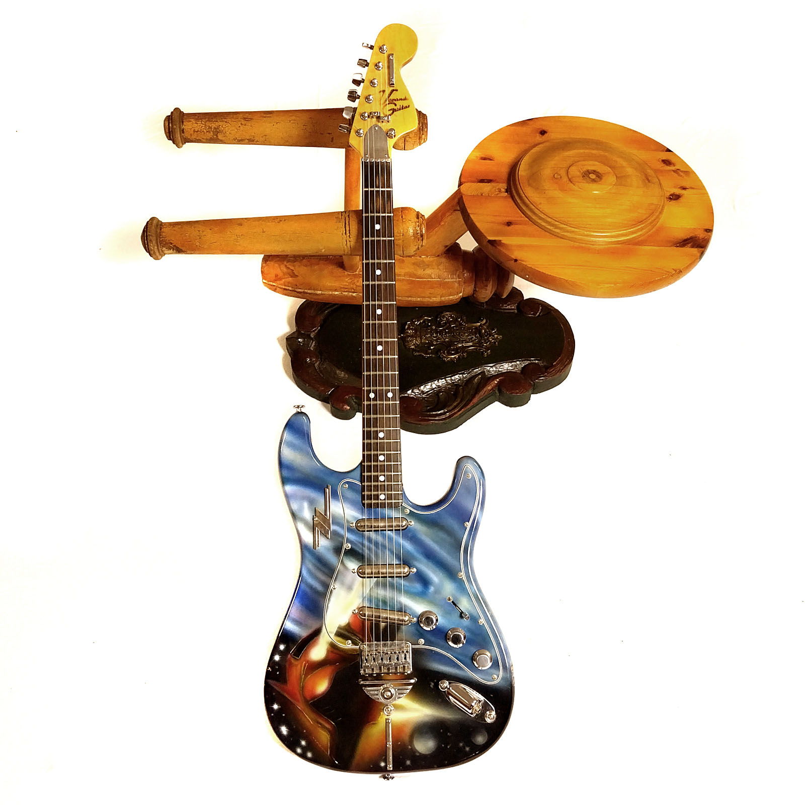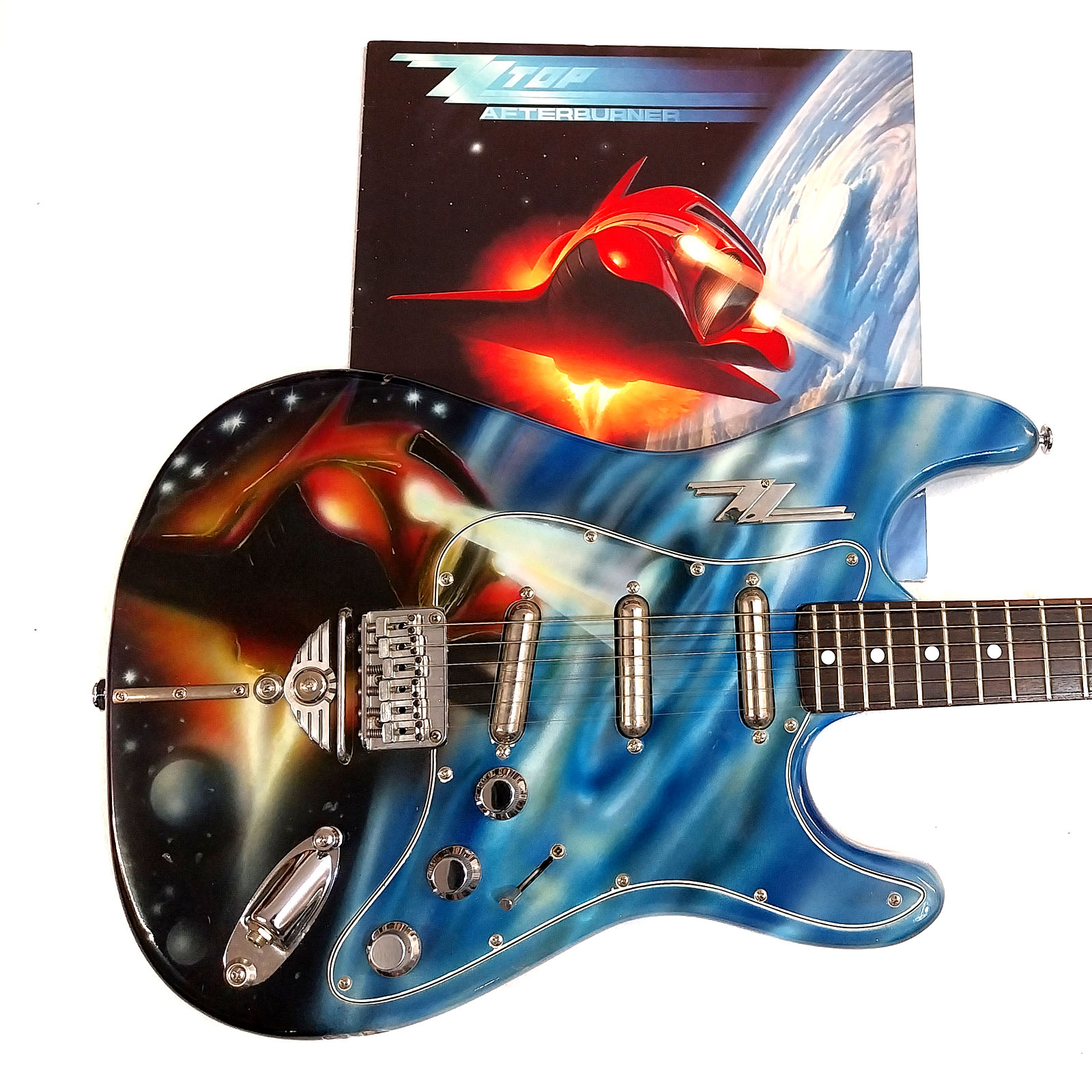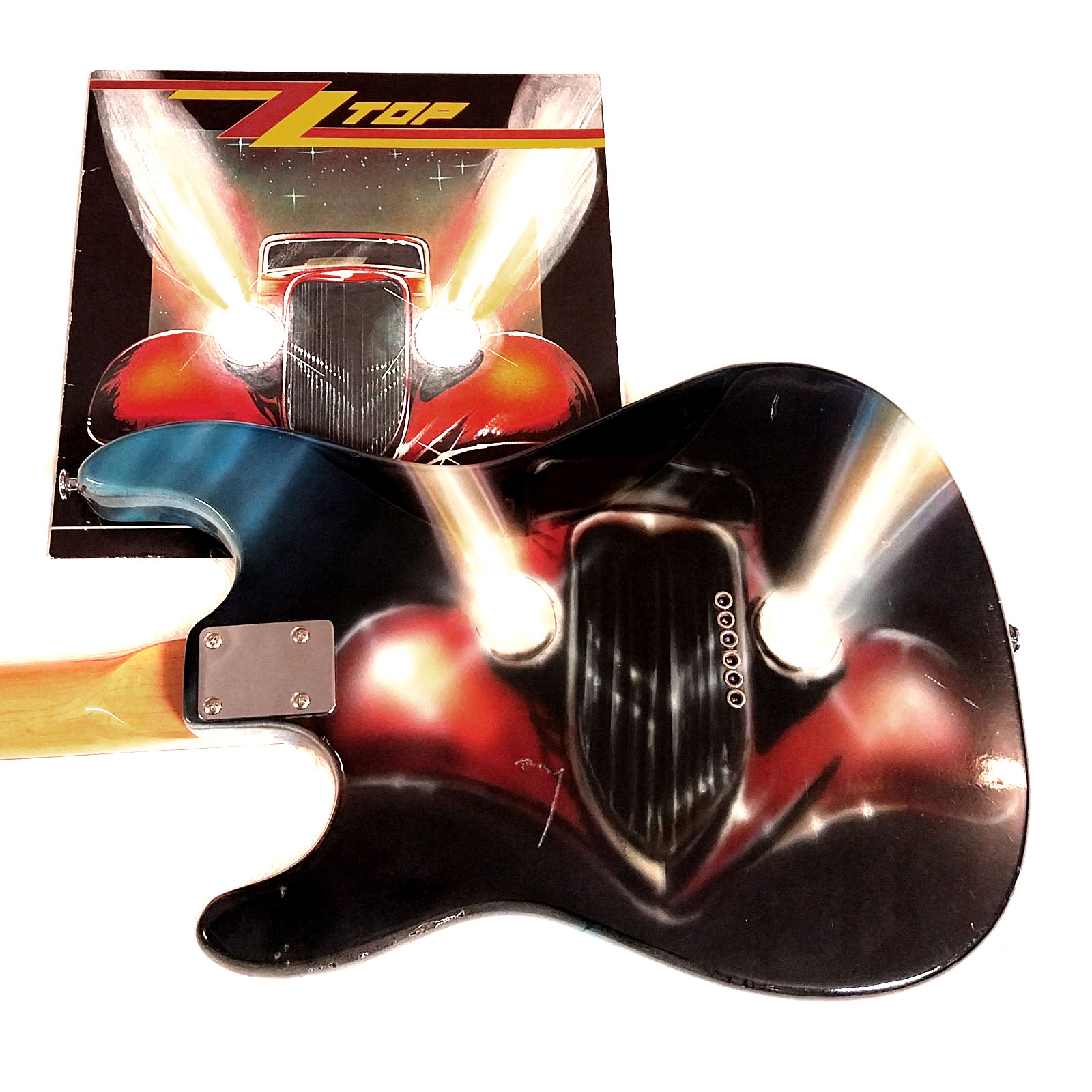 Wie schon bei meiner „Ludwig“ Gitarre war auch bei der Afterminator der Ursprung ein bereits lackierter alter japanischer Stratbody. Vermutlich schon Mitte der 1980er Jahre hat hier ein mir unbekannter Fan seine Strat Kopie in Airbrushtechnik mit den Motiven der beiden ZZ Top Alben „Afterburner“ (1985) und „Eliminator“ (1983) besprüht. Da auch ich diese beiden Scheiben seit ihrem Erscheinen mein Eigen nenn‘ und auch immer noch ab und zu auflege, hab ich mich entschlossen, die Gitarre anzukaufen, zu „schlachten“ und neu aufzubauen. Verwendet wurden Body, Pickguard und Brücke. Der Hals wurde durch einen besseren aus der gleichen Epoche ersetzt. Auch die komplette Elektrik wurde getauscht: drei Lipsticks von Seymour Duncan und CTS Poties fanden Verwendung. Als besonderer Clou wurde ein ZZ-Schlüsselanhänger, wie in vielen Videos von ZZ Top aus den 1980er Jahren zu sehen, am Korpus befestigt! Das kleine Video hat der Fladdy eingespielt – Lipstick Pickups klingen einfach cool! Das Foto mit dem Ford Streetrod 1932 entstand während des 12. US-Car Treffens im schönen Gunzenhausen.