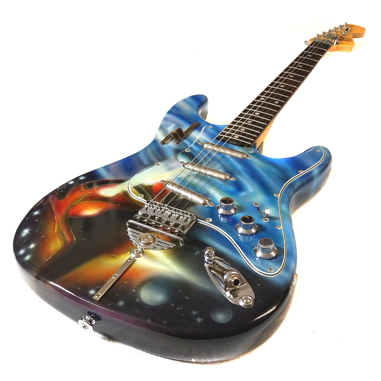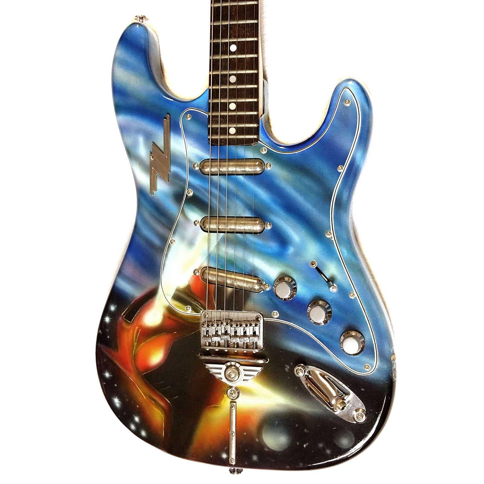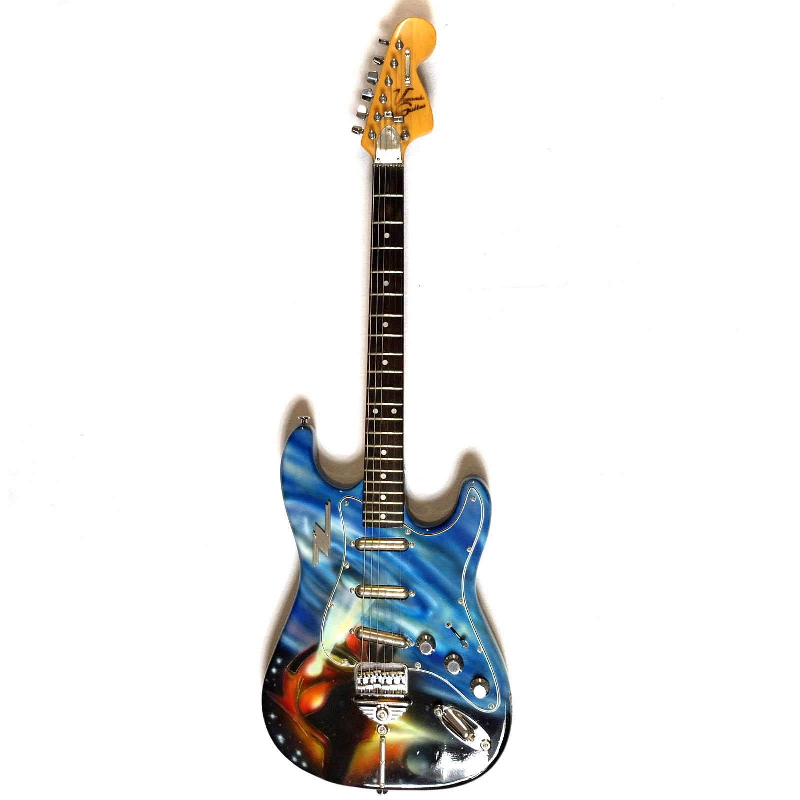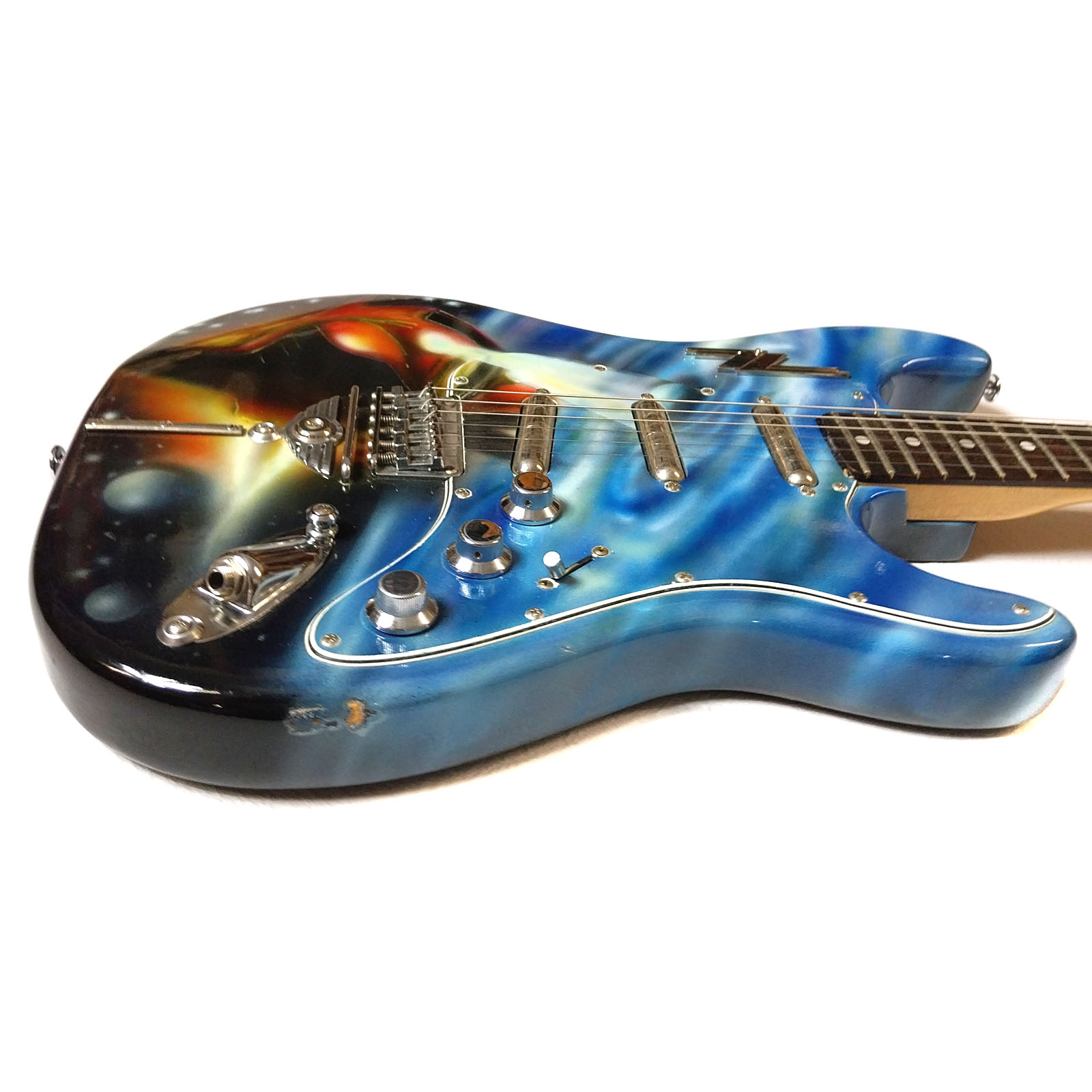 Wie schon bei meiner „Ludwig“ Gitarre war auch bei der Afterminator der Ursprung ein bereits lackierter alter japanischer Stratbody. Vermutlich schon Mitte der 1980er Jahre hat hier ein mir unbekannter Fan seine Strat Kopie in Airbrushtechnik mit den Motiven der beiden ZZ Top Alben „Afterburner“ (1985) und „Eliminator“ (1983) besprüht. Da auch ich diese beiden Scheiben seit ihrem Erscheinen mein Eigen nenn‘ und auch immer noch ab und zu auflege, hab ich mich entschlossen, die Gitarre anzukaufen, zu „schlachten“ und neu aufzubauen. Verwendet wurden Body, Pickguard und Brücke. Der Hals wurde durch einen besseren aus der gleichen Epoche ersetzt. Auch die komplette Elektrik wurde getauscht: drei Lipsticks von Seymour Duncan und CTS Poties fanden Verwendung. Als besonderer Clou wurde ein ZZ-Schlüsselanhänger, wie in vielen Videos von ZZ Top aus den 1980er Jahren zu sehen, am Korpus befestigt! Das kleine Video hat der Fladdy eingespielt – Lipstick Pickups klingen einfach cool! Das Foto mit dem Ford Streetrod 1932 entstand während des 12. US-Car Treffens im schönen Gunzenhausen.