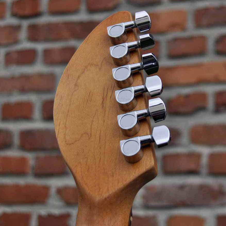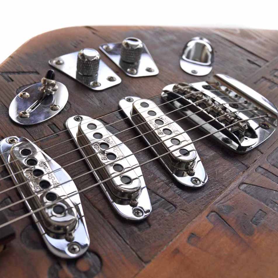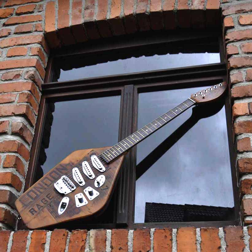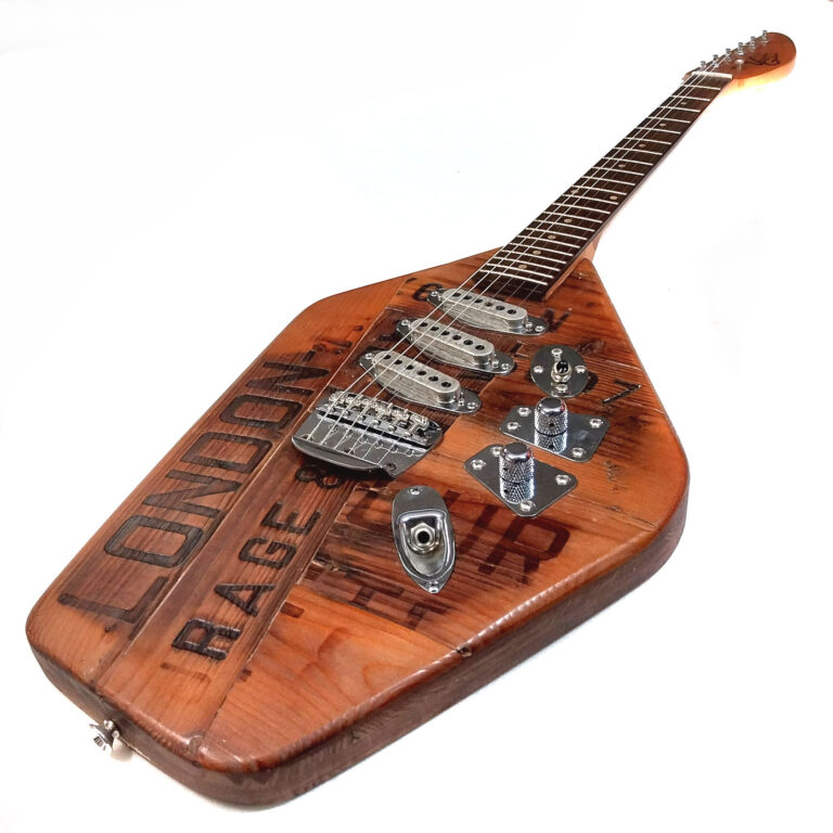 Mit der Veranda London Rage wollte ich mal einen Ausflug in den englischen Gitarrenbau unternehmen. Die Korpusform ist an die berühmten britischen VOX Phantom Gitarren der 1960er Jahre angelehnt, die PUs sind drei BURNS Tri-Sonic Single Coils und das Korpusholz stammt von einer uralten Londoner Bierkiste der Courage & Co London Alton Brewery, mithilfe derer vermutlich schon Charles Dickens mit Stout Ale versorgt wurde.