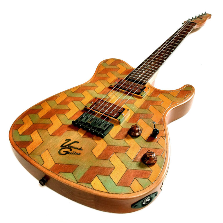 Der holländische Künstler Maurits Cornelis Escher hat die Welt mit einer Unzahl an fantastischen, faszinierenden und großartigen Bildern bereichert. Vor allem durch seine perspektivisch unmöglichen und widersprüchlichen Abbildungen wurde er ab Mitte des letzten Jahrhunderts zu einer Art Rockstar der graphischen Darstellung. Neben seinen detailverliebten Bildern hat er auch diverse dreidimensionale Muster entworfen, die heute von der Tapete bis zum Sofabezug alles mögliche zieren. Ab sofort auch eine E-Gitarre. Das Grundmuster hab ich mit Hilfe eines Hilfsliniengitternetzes auf Korpus, Humbuckerrahmen und Kopfplatte übertragen. Danach die sichtbaren Linien fest aufgedrückt mit Bleistift nachgezogen und dann vorsichtig überschliffen, bis die Hilfslinien verschwunden waren. Die entstandenen Felder hab ich danach in drei Farben mit schweizer Wachspastellkreide ausgemalt. Sämtliche Arbeiten erforderten selbstredend äußerste Konzentration. Man ist schon mal geneigt, eine Linie nachzuziehen, die eigentlich unsichtbar bleiben sollte oder die falsche Fläche auszumalen. Aber wie jeder sehen kann, hab ich alles richtig gemacht. Freu. Nach weiteren kleinen Zwischenbehandlungen wurde dann alles noch mit einem bernsteineingefärbten Transparentlack überzogen, was auch dieser Gitarre wieder einen gewissen „Vintage“ Charakter verleiht. Weitere Besonderheiten der Gitarre sind die GuitarHeads Lumberbucker Pickups mit Echtholz-Spulenkörper und die Potiknöpfe ebenfalls aus Holz. Die string-through-body Brücke und die Mechaniken sind in antik Kupfer gehalten. Alles in allem wieder eine rundum stimmige und optisch sehr interessante Gitarre!