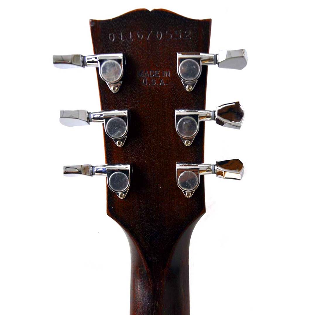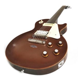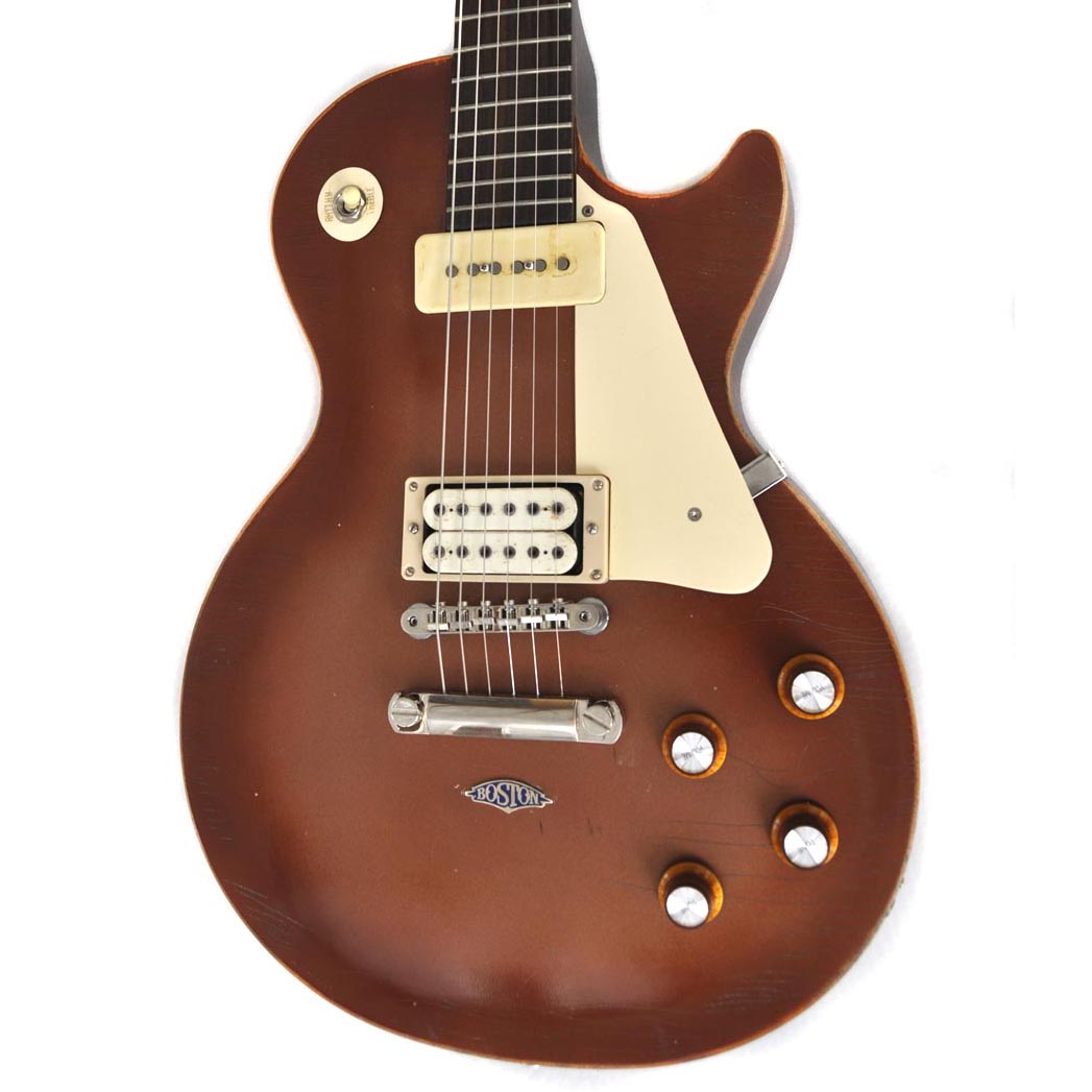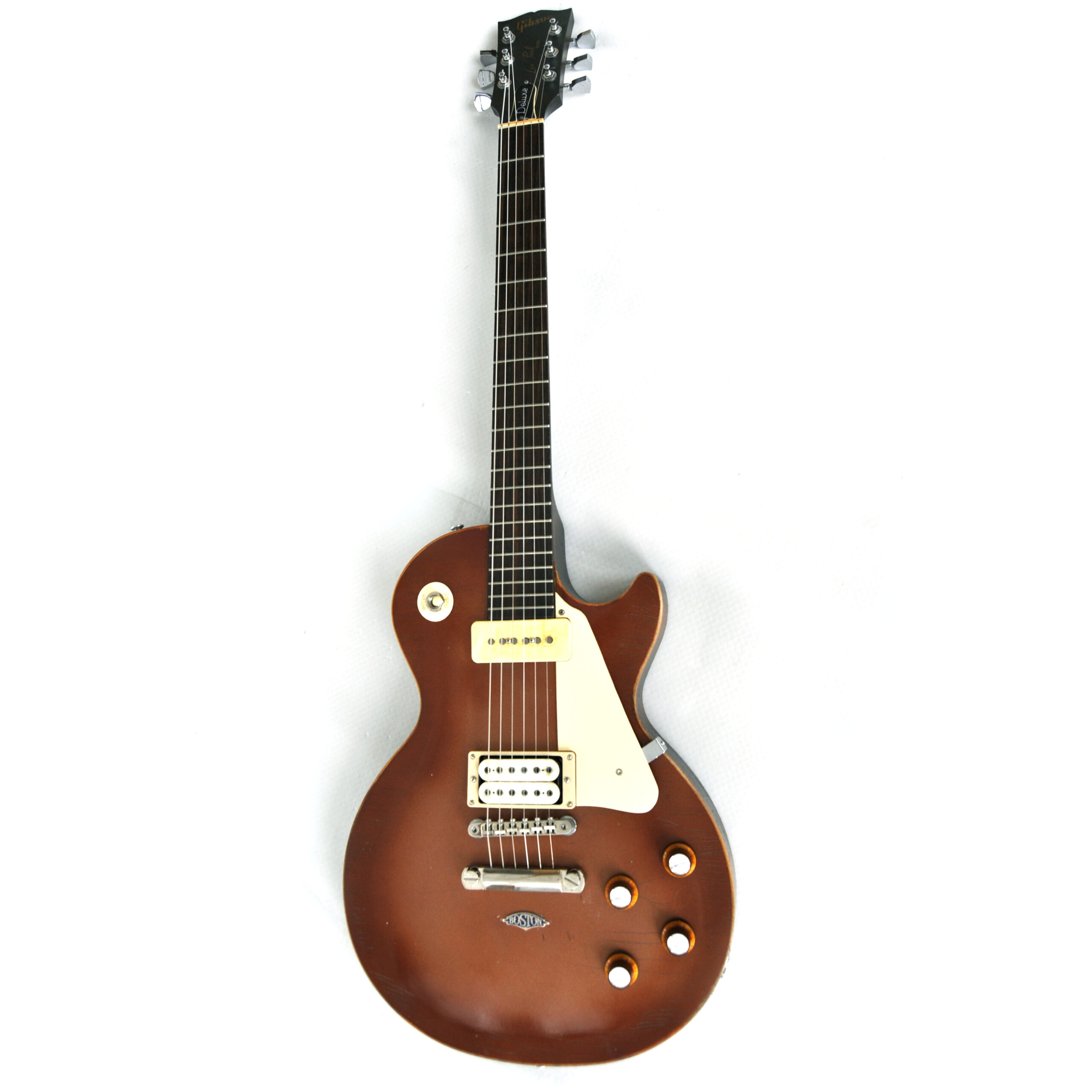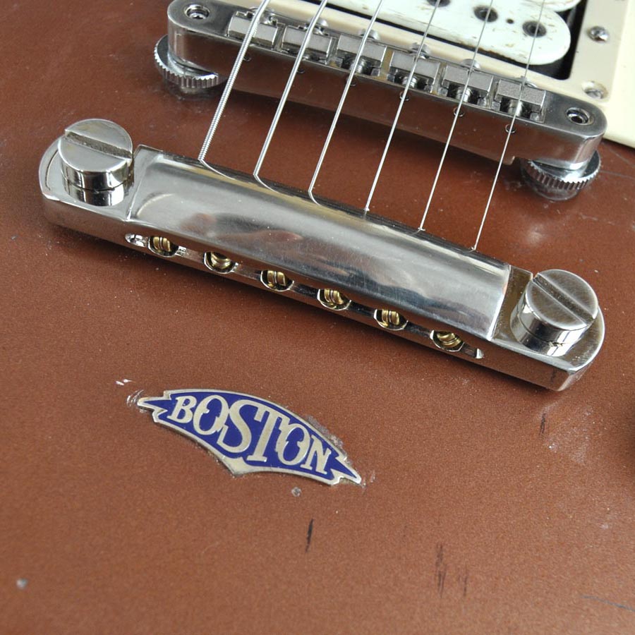 Die Idee dazu hatte ich, als mir der Torso einer modifizierten Gibson Les Paul BFG von 2007 angeboten wurde. Es wurde ja viel gerätselt, wofür dieses „BFG“ stand. Mancher behauptete es wäre eine „Billy F. Gibbons“ Gitarre, andere sprachen von einer „Bad F*cking Guitar“, Gibson hatte wohl eher „Barely Finished Guitar“ im Sinne. Jedenfalls waren hier schon mal die Pickupfräsungen passend und der Vorbesitzer hatte bereits die wellig geschnitzte Oberfläche glatt geschmirgelt und die Decke in einer Art „Goldtop“ lackiert. Es sieht zwar mehr nach „Kupfer“ als nach „Gold“ aus, mir hat es jedenfalls auch so gefallen. Einen alten „DiMarzio“, einen Gibson P-90, einen Satz Grover Tuners und ein altes originales „Deluxe“ Trussrod Cover hatte ich noch am Lager. Das ganze ordentlich verdrahtet und mit einer alten „Boston“ Plakette geschmückt, und schon war meine spezielle „Tom Scholz Gedächtnisgitarre“ fertig. Besonders cool find ich auch die nicht vorhandenen Griffbrettmarkierungen.