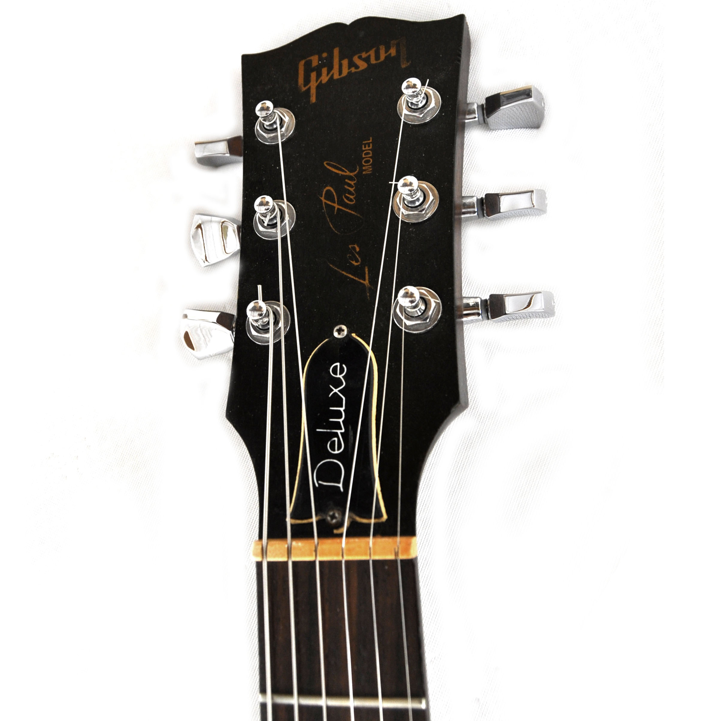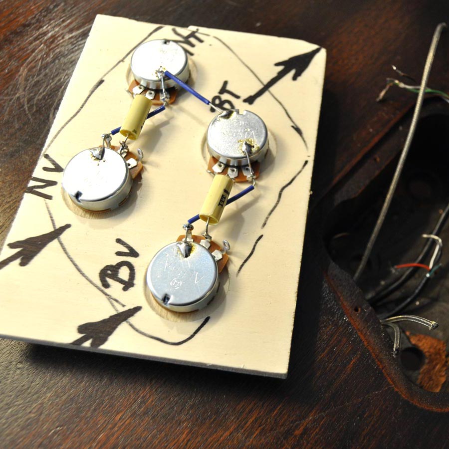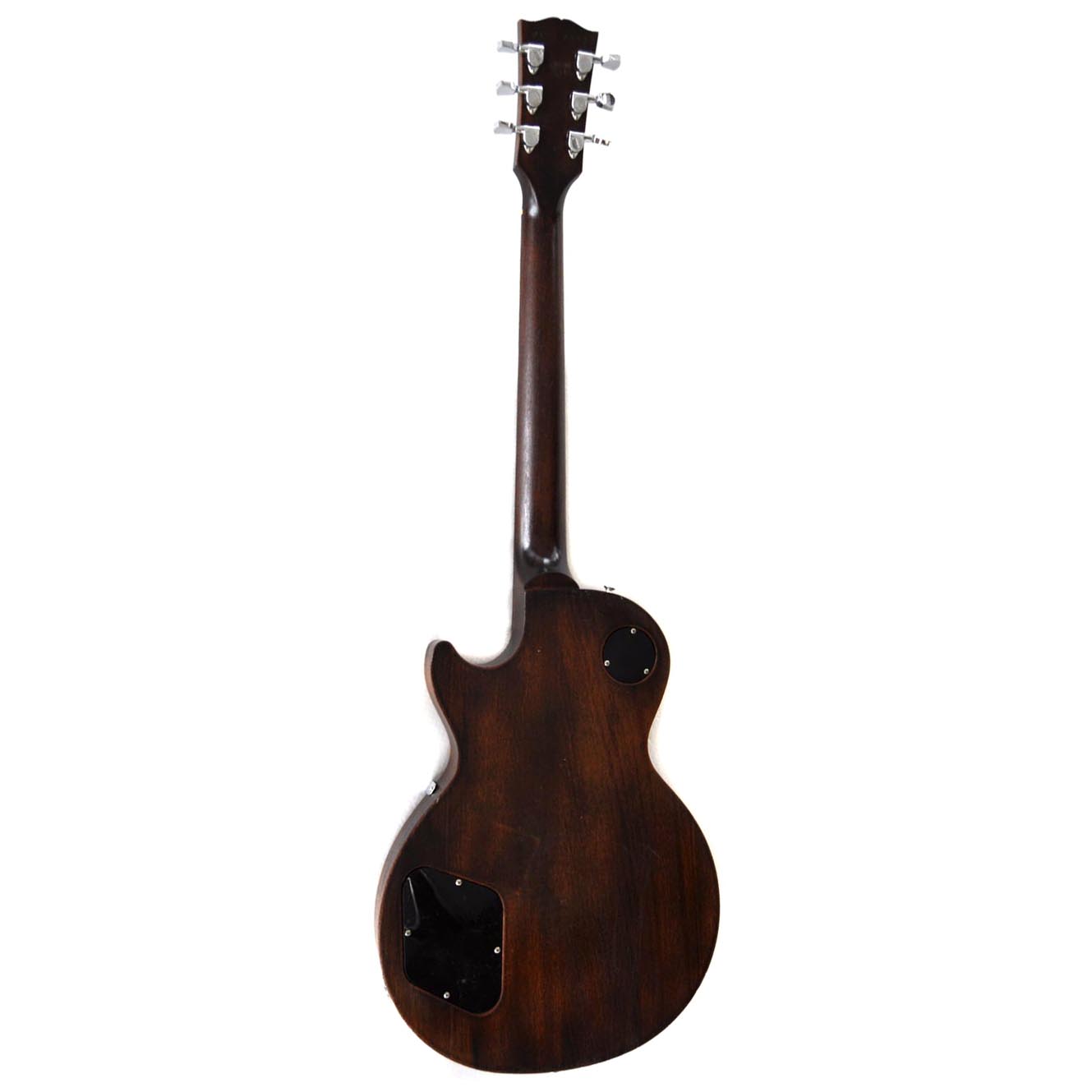 Die Idee dazu hatte ich, als mir der Torso einer modifizierten Gibson Les Paul BFG von 2007 angeboten wurde. Es wurde ja viel gerätselt, wofür dieses „BFG“ stand. Mancher behauptete es wäre eine „Billy F. Gibbons“ Gitarre, andere sprachen von einer „Bad F*cking Guitar“, Gibson hatte wohl eher „Barely Finished Guitar“ im Sinne. Jedenfalls waren hier schon mal die Pickupfräsungen passend und der Vorbesitzer hatte bereits die wellig geschnitzte Oberfläche glatt geschmirgelt und die Decke in einer Art „Goldtop“ lackiert. Es sieht zwar mehr nach „Kupfer“ als nach „Gold“ aus, mir hat es jedenfalls auch so gefallen. Einen alten „DiMarzio“, einen Gibson P-90, einen Satz Grover Tuners und ein altes originales „Deluxe“ Trussrod Cover hatte ich noch am Lager. Das ganze ordentlich verdrahtet und mit einer alten „Boston“ Plakette geschmückt, und schon war meine spezielle „Tom Scholz Gedächtnisgitarre“ fertig. Besonders cool find ich auch die nicht vorhandenen Griffbrettmarkierungen.