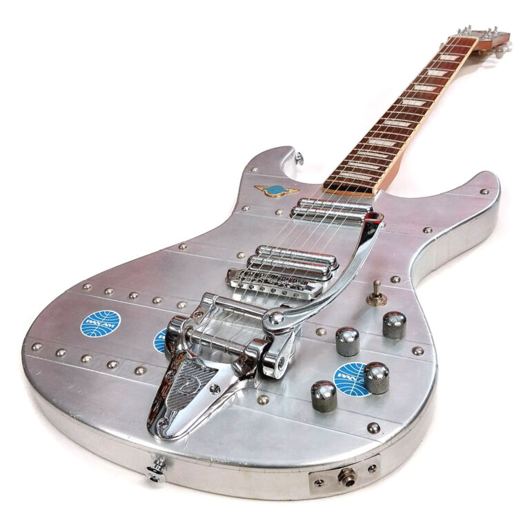 Wie schon bei meiner Jever Gitarre hab ich mich wieder mal für die „Mosrite“ – Form entschieden. Korpus und Hardware hab ich einer alten Danelectro Hodad entnommen. In diesem Fall steht das „D“ auf dem Tremolo aber selbstredend für „Düsen-Jet“! Der gesamte Korpus wurde, wie früher die Außenhäute von Flugzeugen, mit Aluminium beschichtet. Die Nähte der Aluelemente verlaufen parallel zu den Doppel-Lipstick-PUs. Am Korpus entdeckt man außerdem ein originales Abzeichen, das einst die Uniform einer adretten Panam-Stewardess zierte („Junior Clipper Stewardess“)! Dazu passend findet man den „Junior Clipper Pilot“ auf der Kopfplatte. Der noble Ahornhals hat ein eingefasstes Rosewoodgriffbrett mit vornehmen Trapez-Inlays. Das auf den Fotos zu sehende Flugzeugmodell ist übrigens eine legendäre Boeing 707. Mit so einem Exemplar wurden auch die Beatles 1964 nach Amerika geflogen…