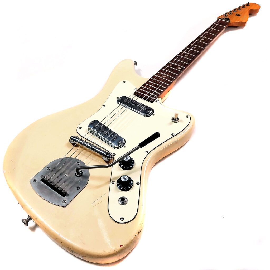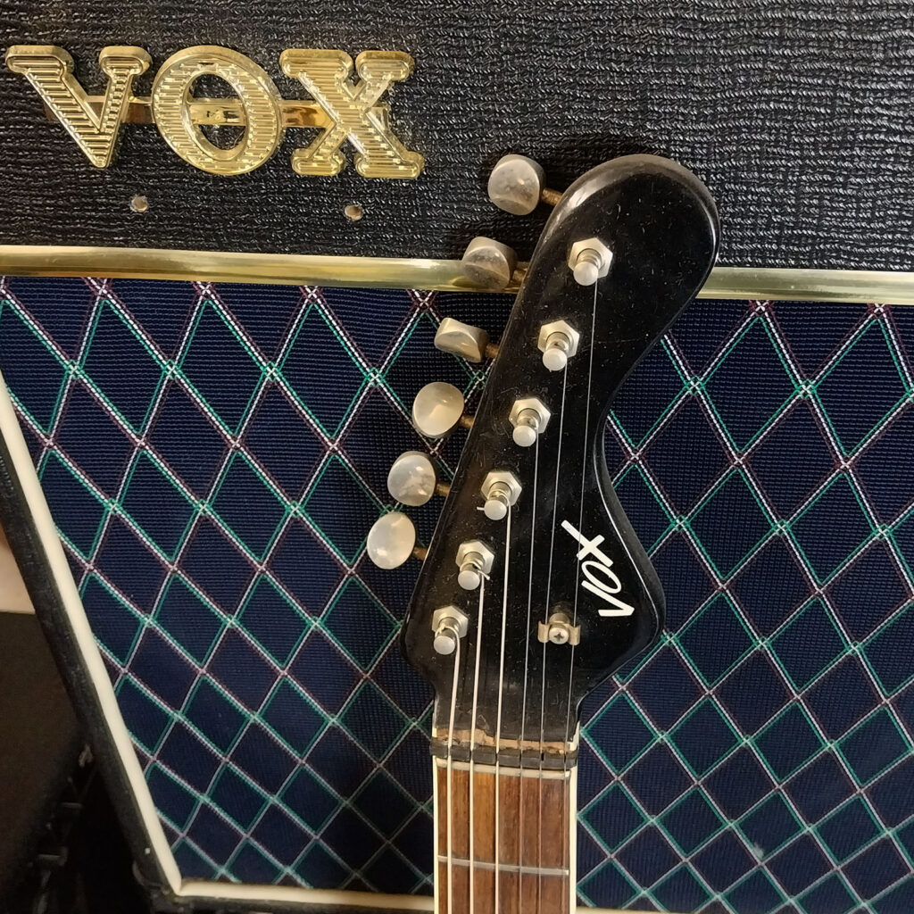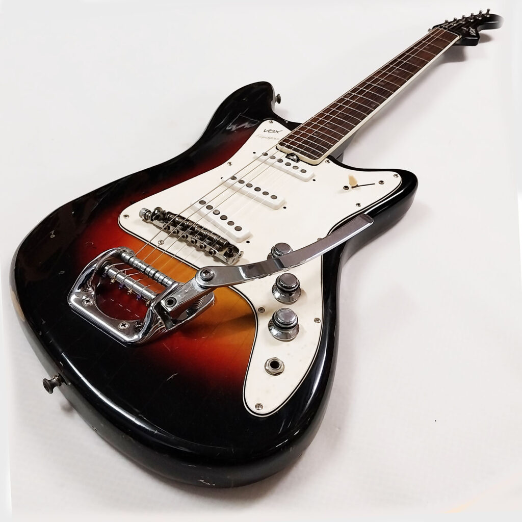 Im ’66er VOX Katalog wurde die Spitfire folgendermaßen beschrieben: „Contoured body, quick flick 3 position pick-up switch, 3 pick-ups, rosewood fingerboard, true spring action vibrato, adjustable master bridge channel, 6 individual string bridges, sunburst. 2-way string damper.“ Ein Gurtpin wurde mal versetzt. Ansonsten ist sie in gutem Originalzustand und kommt auch im Originalkoffer! Made in Italy.