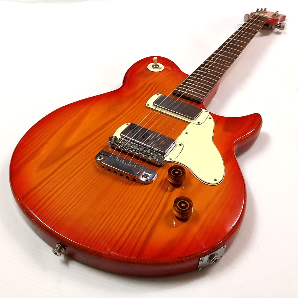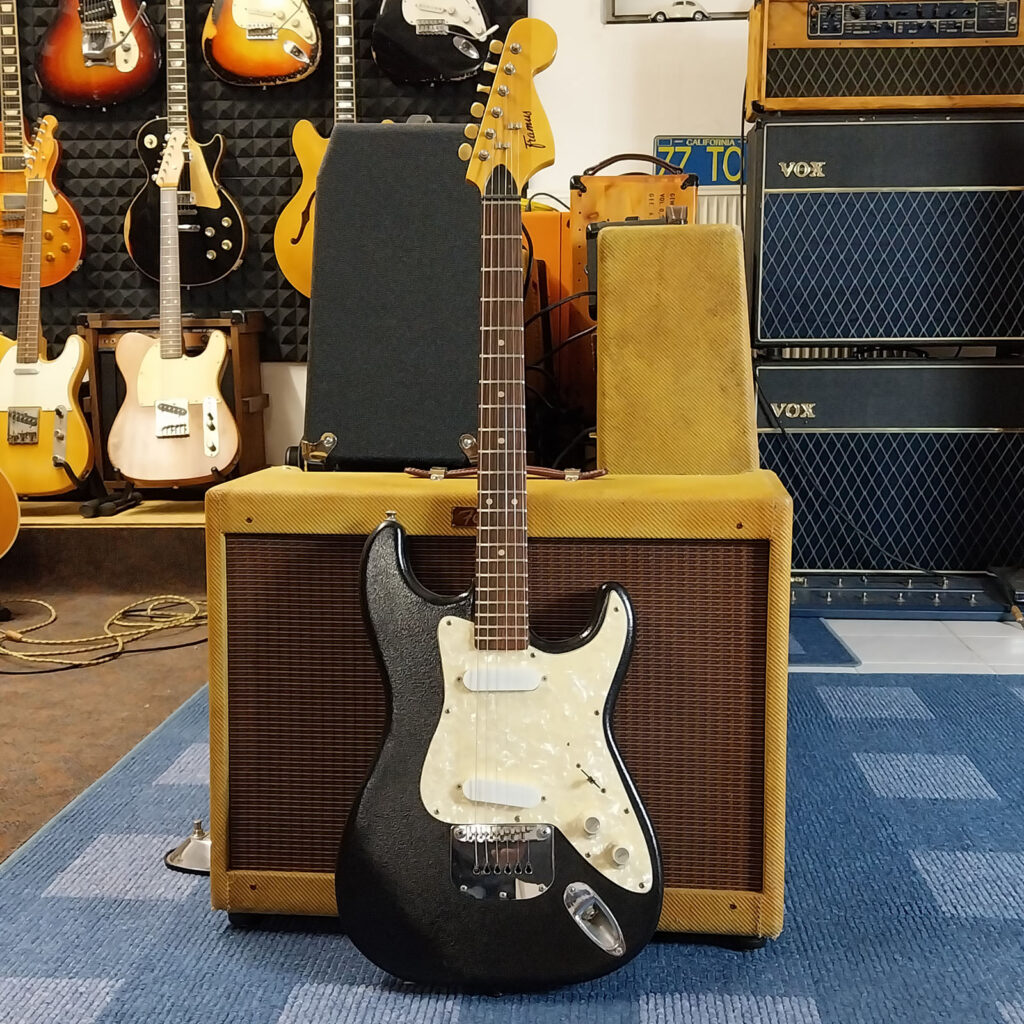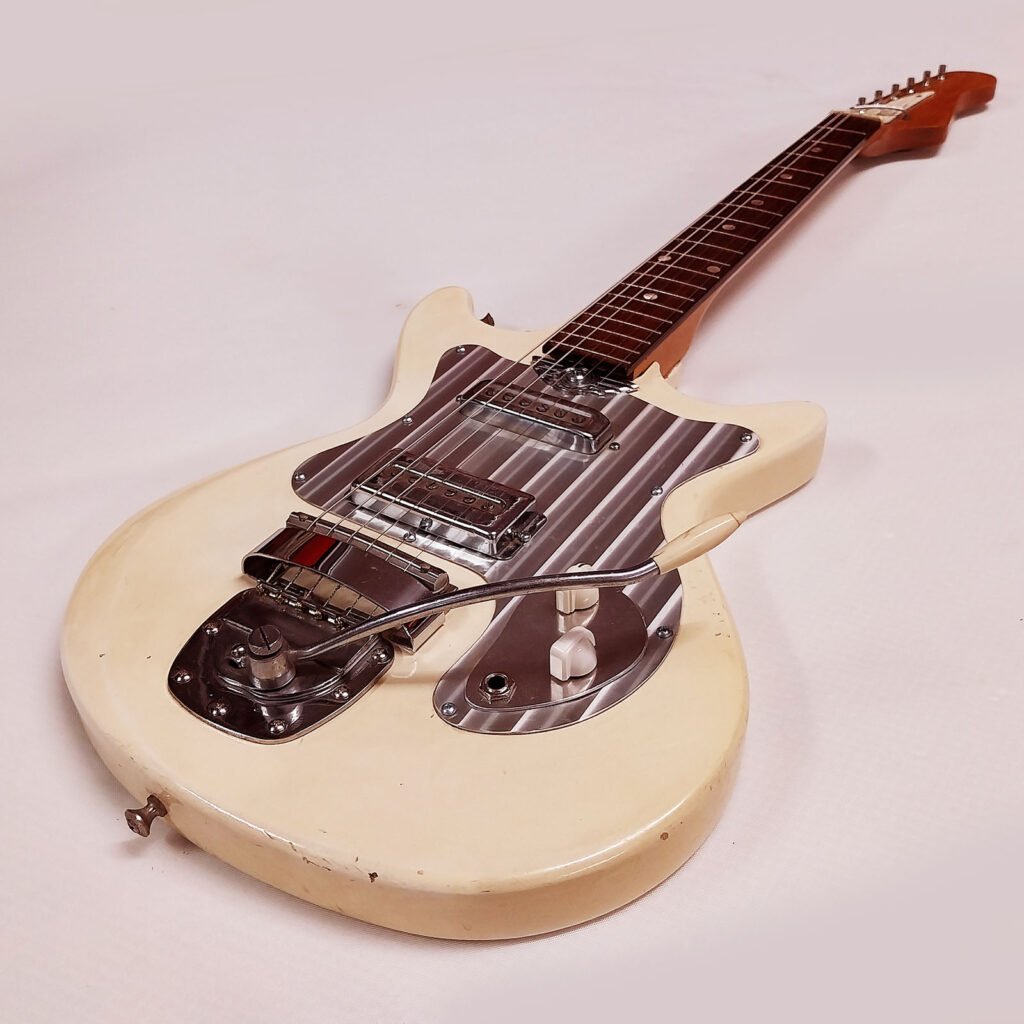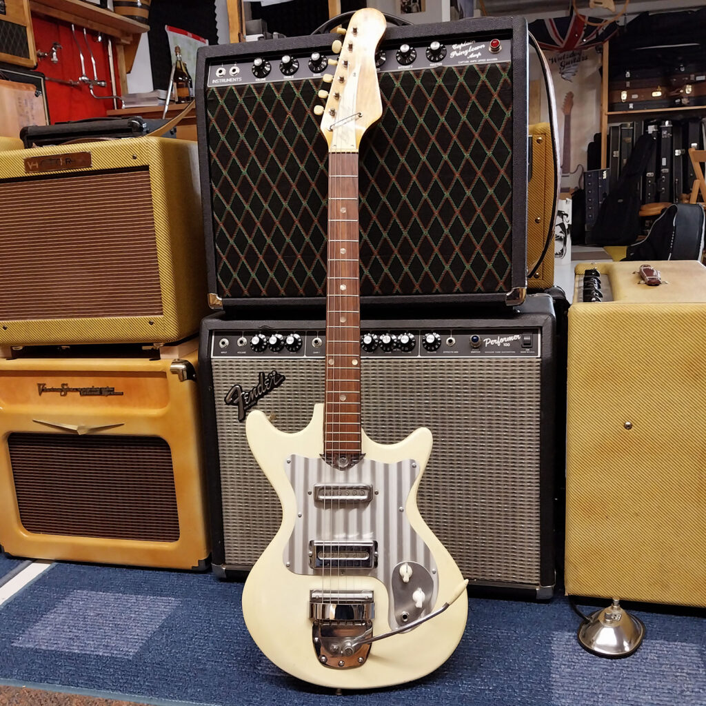 Im ’66er VOX Katalog wurde die Spitfire folgendermaßen beschrieben: „Contoured body, quick flick 3 position pick-up switch, 3 pick-ups, rosewood fingerboard, true spring action vibrato, adjustable master bridge channel, 6 individual string bridges, sunburst. 2-way string damper.“ Ein Gurtpin wurde mal versetzt. Ansonsten ist sie in gutem Originalzustand und kommt auch im Originalkoffer! Made in Italy.