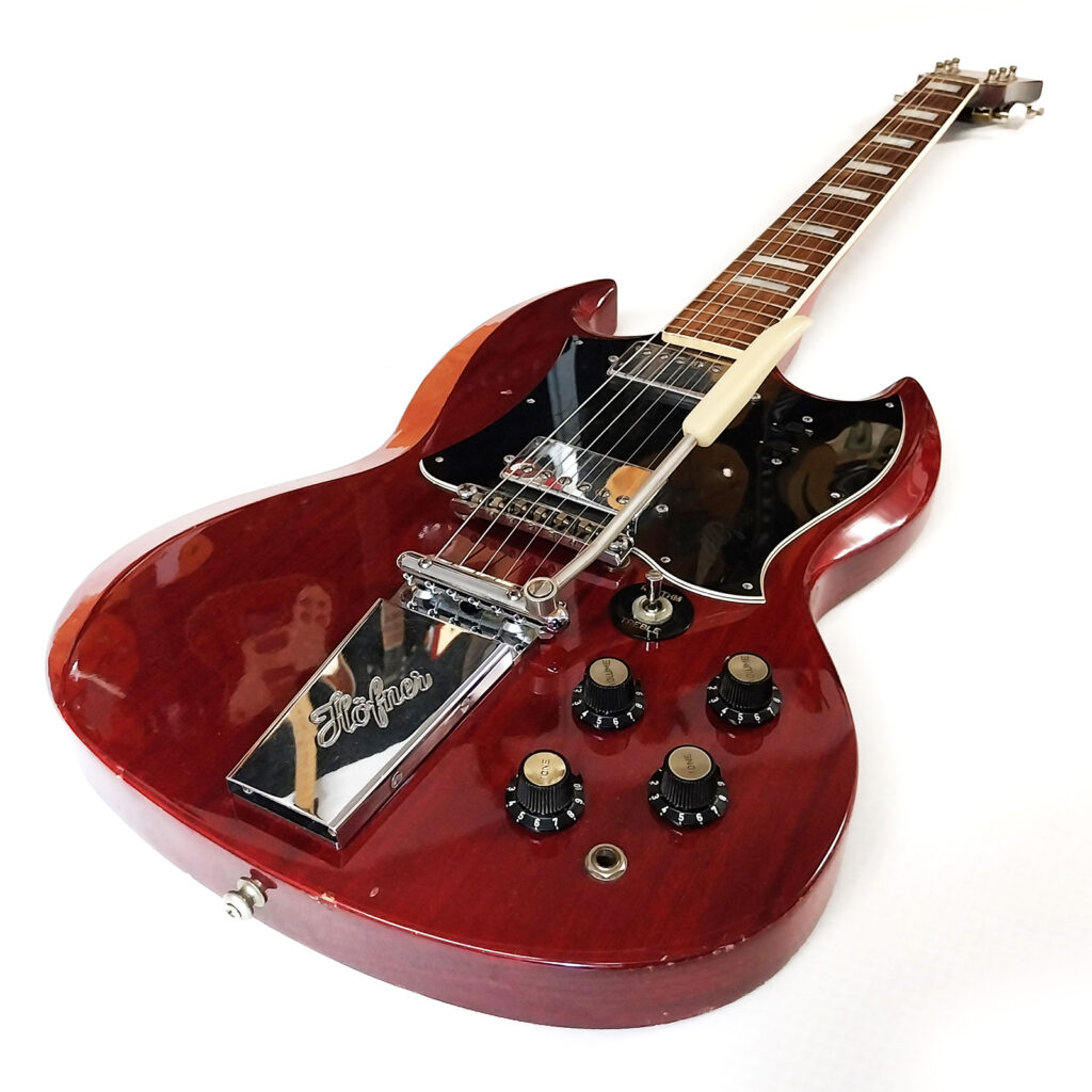 Sehr coole und originale Höfner SG Kopie mit zwei Humbuckern und extrem seltenem „Höfner“ graviertem Vibrola Tremolo.