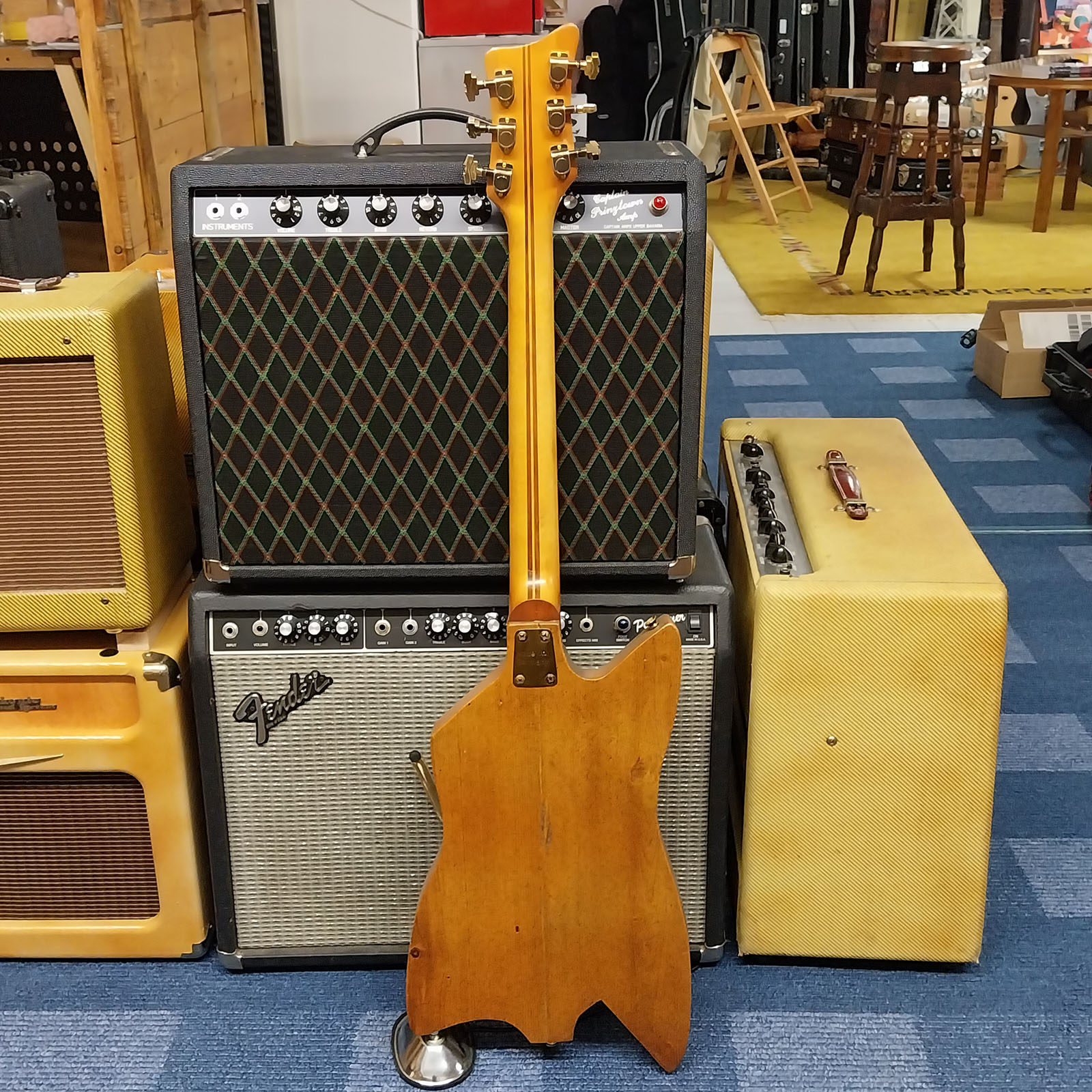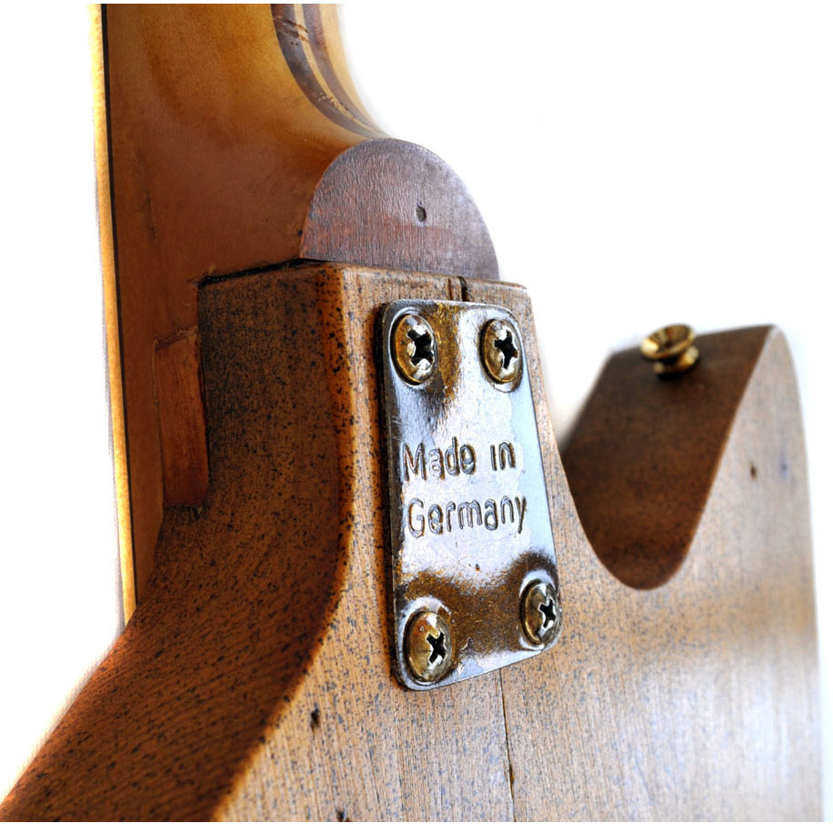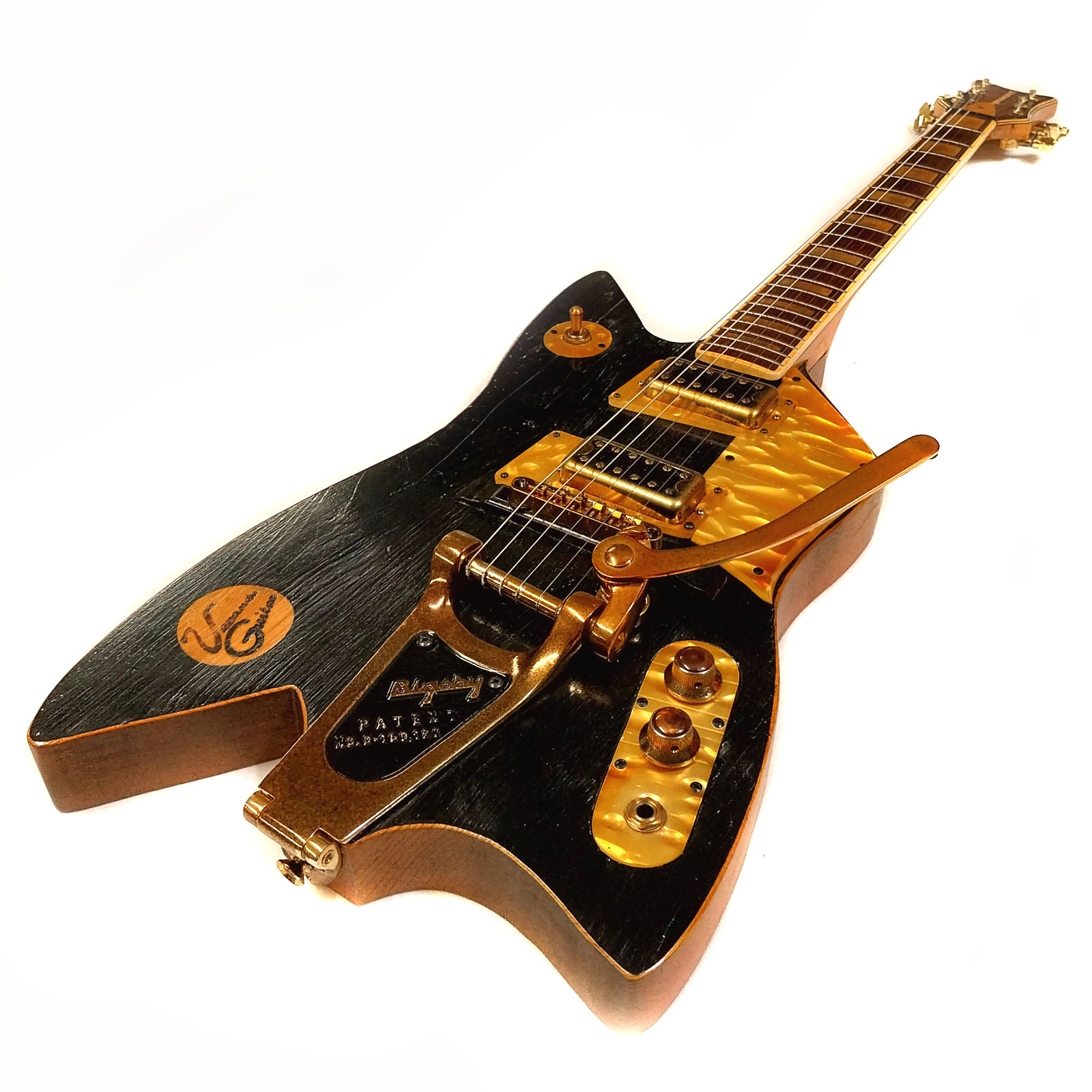 Jubiläumsalarm! Meine 100ste Gitarre ist fertig! Da bin ich jetzt tatsächlich selber ganz überrascht. Auch diesmal ist wieder eine originelle „Recycling“ Axt entstanden. Die Basis war ein alter Dynacord Hals aus den 1960er Jahren. Jawoll, der traditionsreiche Orchesterelektronikhersteller aus Straubing ließ in Vergangenheit tatsächlich auch kurzzeitig zwei E-Gitarrenmodelle (Cora und DC 3) unter dem Label „Dynacord“ fertigen. Heute sind das gesuchte Raritäten! Von einer DC 3 stammt auch dieser Hals mit der schönen asymmetrischen Kopfplattenform, die mich sofort an die Heckflosse eines alten Amischlitten erinnert hat. Das schrie ja förmlich nach einer „Billy Bo“ bzw. Jupiter Thunderbird Interpretation! Bo Diddley hat sich ja bekanntlich in seiner Jugend drei Exemplare dieser abgedrehten Gitarre, von der Heckflosse seines ’59er Cadillac inspiriert, in Sonderanfertigung von einem damaligen Gretsch-Mitarbeiter bauen lassen. Im unten verlinkten Video sind zwei davon zu sehen. Eine spielte der Chef persönlich, die andere seine damalige Gitarristin Norma-Jean Wofford (1942-2005). Sein Original hat Mister Diddley dann 1969 an ein junges Ausnahmetalent aus Texas verschenkt: An Billy Gibbons von ZZ Top!
