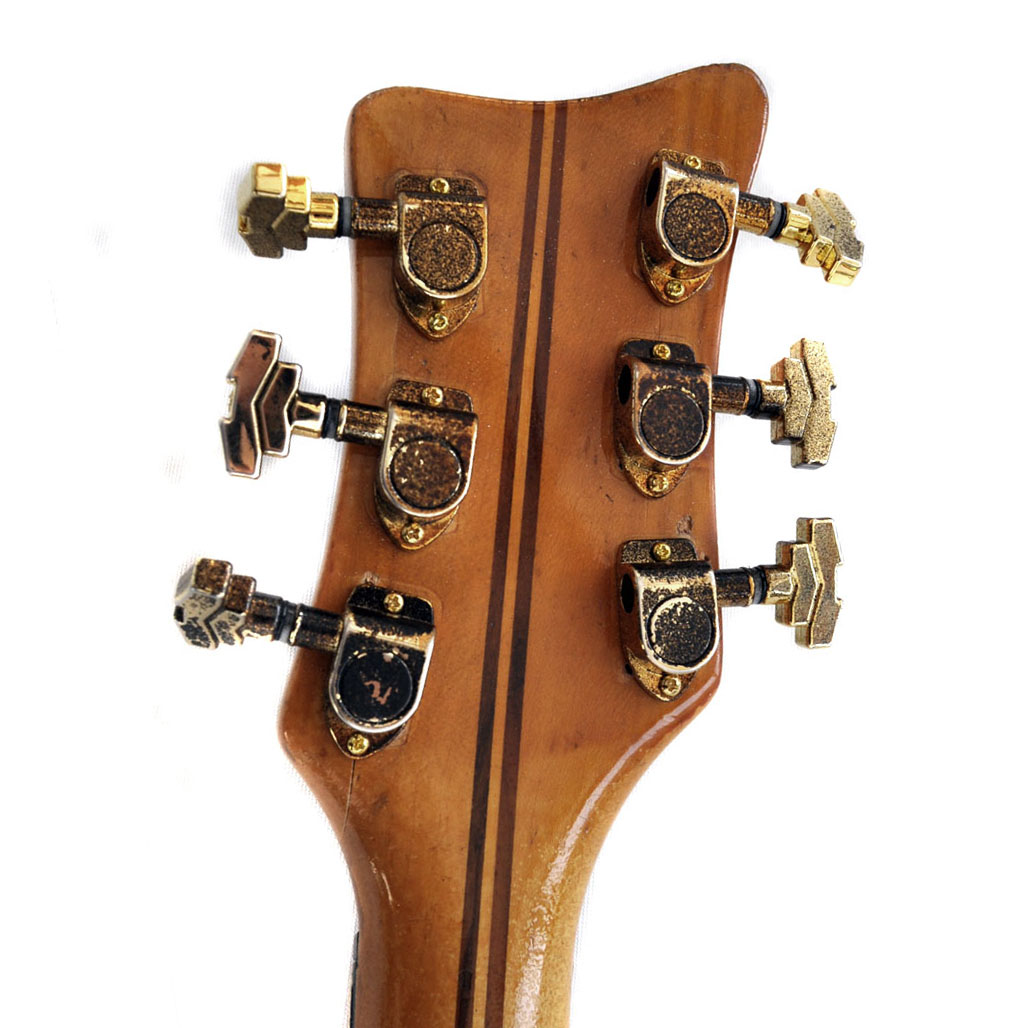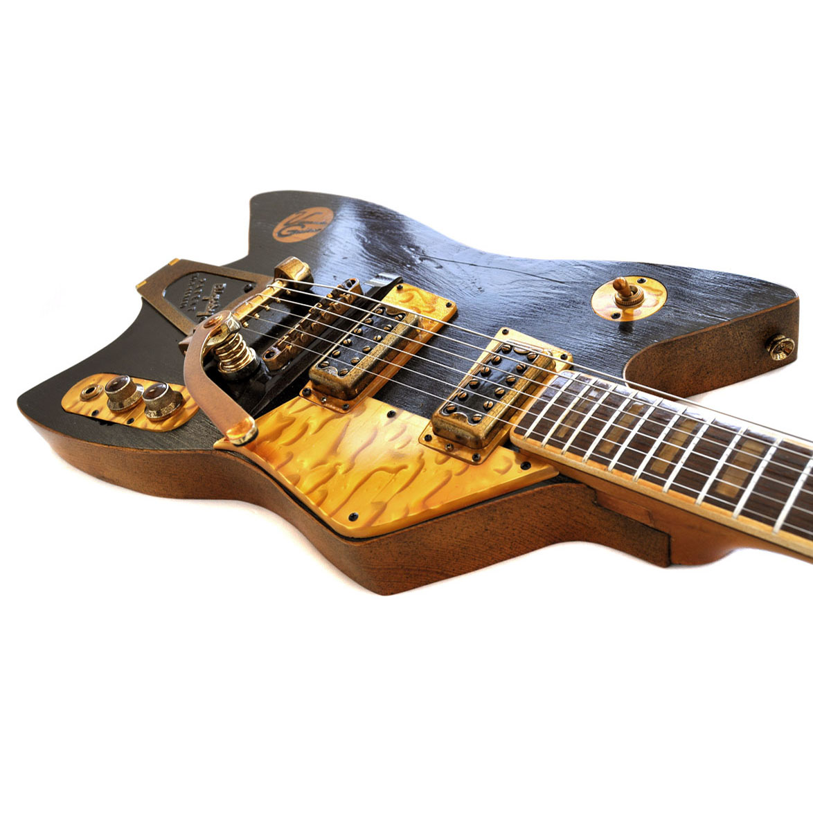 Der Korpus meiner Black Bo ist kürzer als der des Originales. Das ist einerseits der Tatsache geschuldet, dass es mir optisch so besser gefallen hat, andererseits mein Rohmaterial nicht mehr hergab. Diesen definitiv uralten Holzblock (Fichte ?) hab ich im Spätsommer ’21 auf einer coolen Geburtstagsfeier mit Unterstützung einer Bekannten (danke Kerstin!) vor den Flammen des Lagerfeuers gerettet! Sämtliche Aussparungen für die Elektronik hab ich von der Oberseite her vorgenommen. Das sorgt für eine elektronikfachfreie Korpusrückseite. Die Schalter- und Reglerplatten, das Pickguard, die Pick-up-Rahmen und das Trussrod-Cover hab ich aus einer originalen Bakelitplatte aus den 1950er Jahren gefertigt. Sämtliche Metallteile und auch die beiden Gretsch Pickups hab ich einer optischen Oberflächenbehandlung unterzogen. Auch in mir steckt ein kleiner Alchimist! Das alles in Verbindung mit der schwarzen Deckenlackierung ist doch einer einhundertsten Gitarre würdig! Ich bin jedenfalls sehr glücklich und zufrieden damit! Ach, was red ich: ich bin vollkommen begeistert!