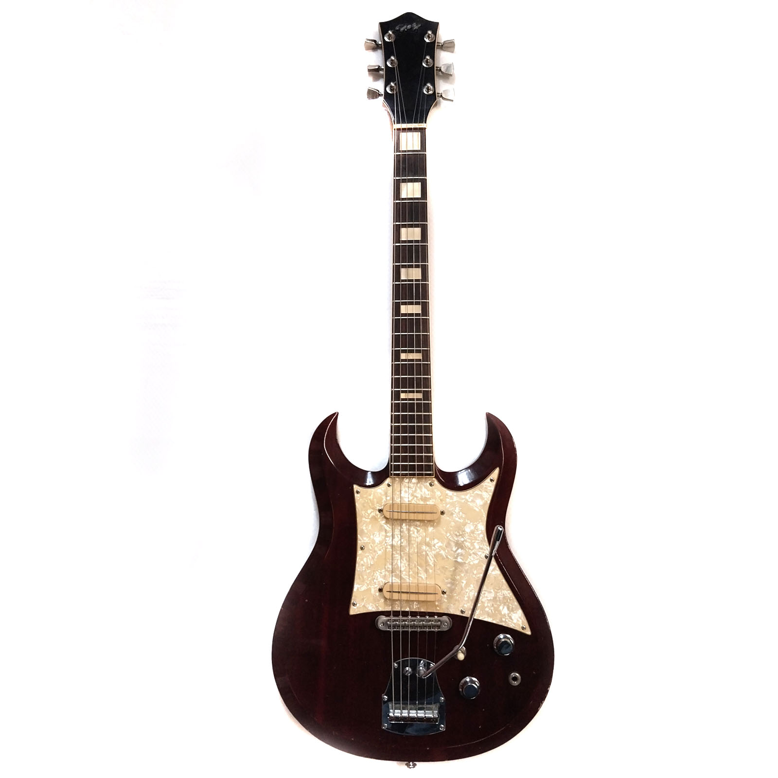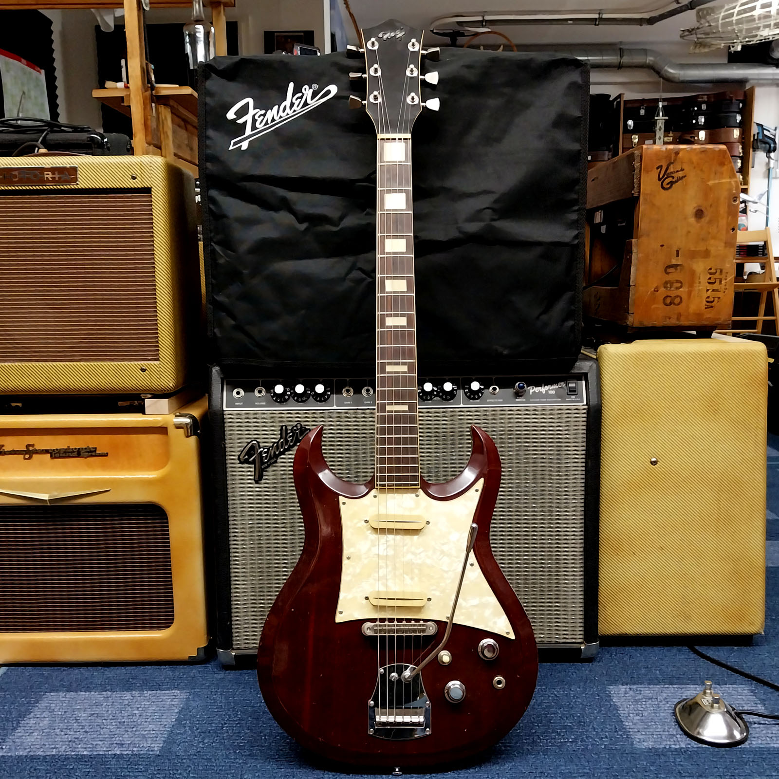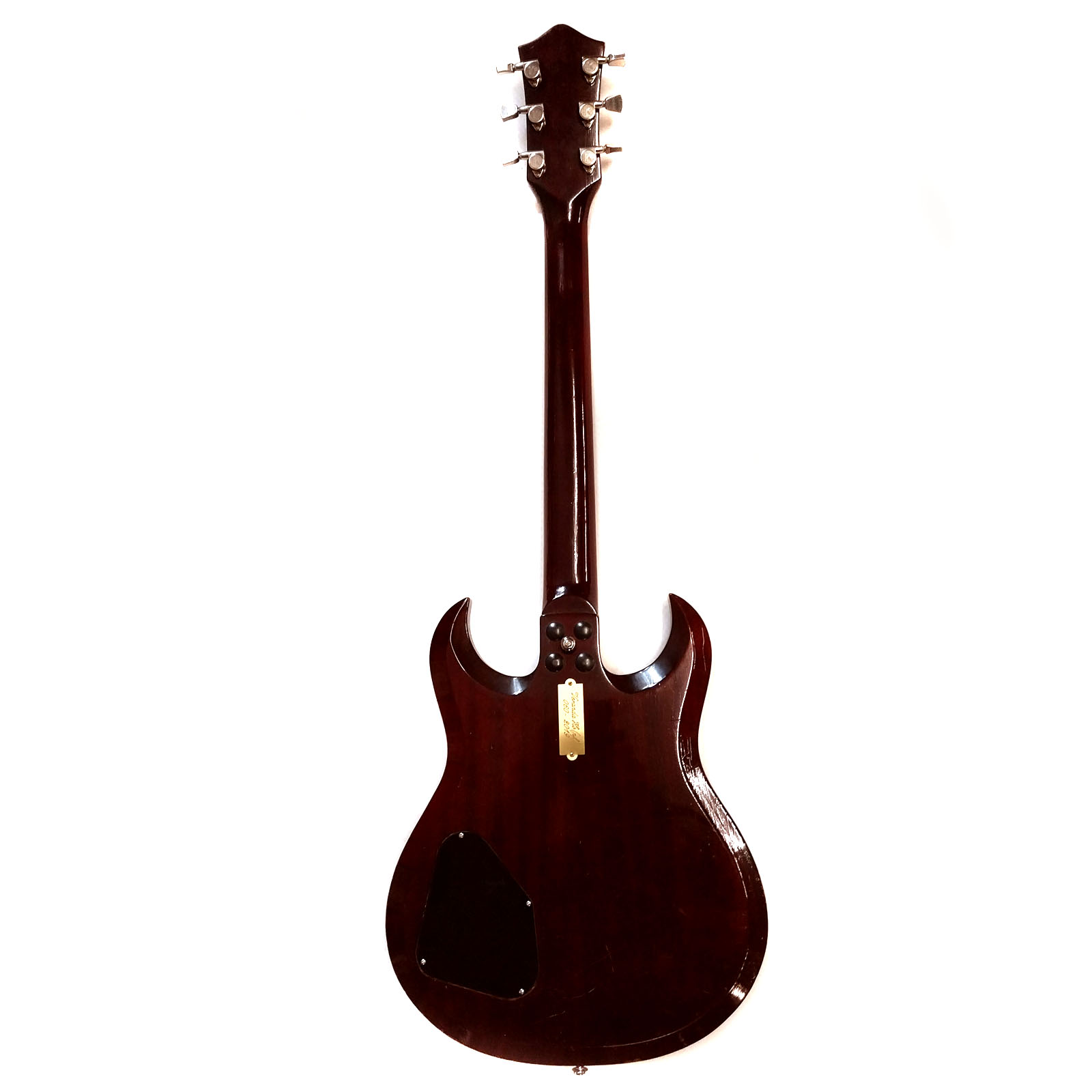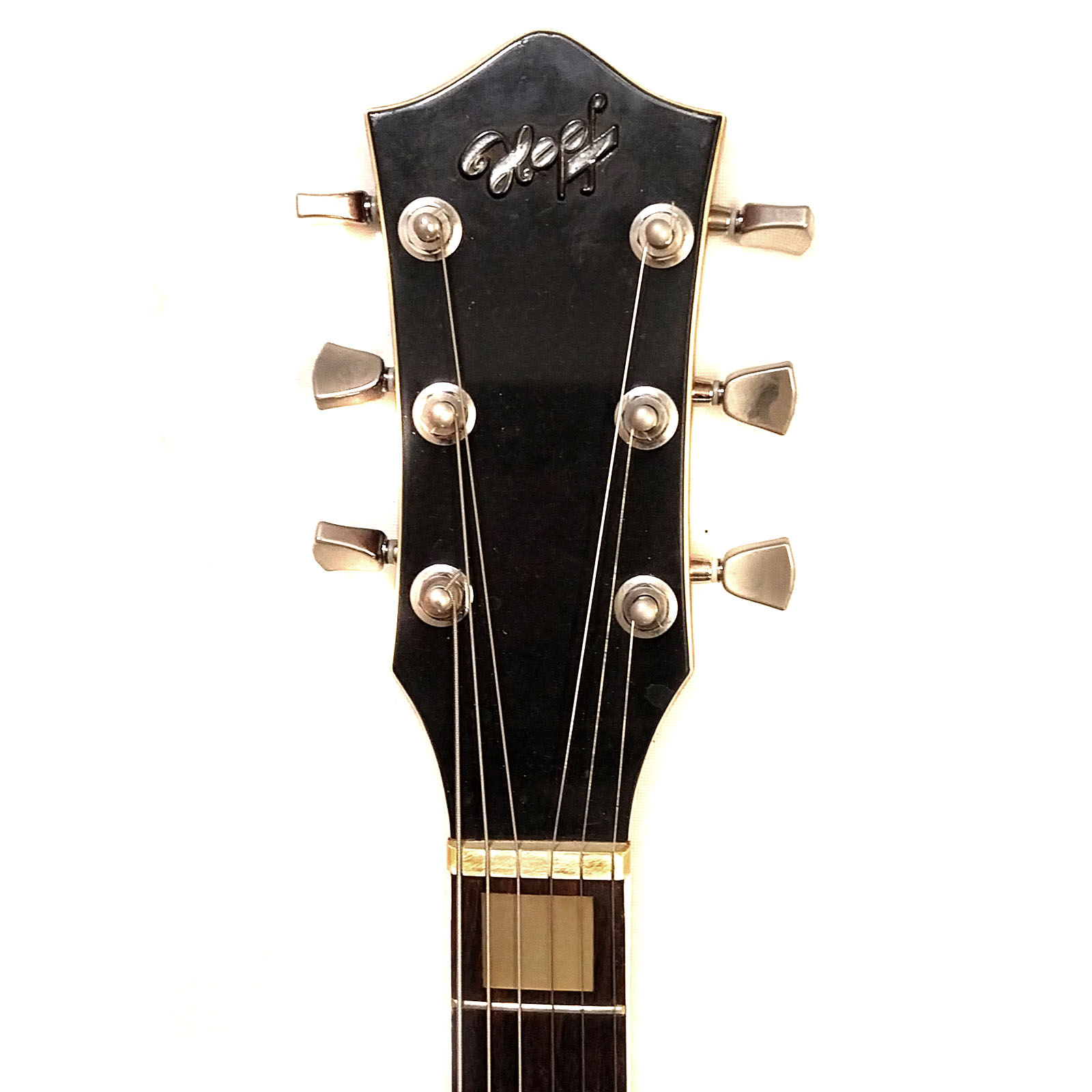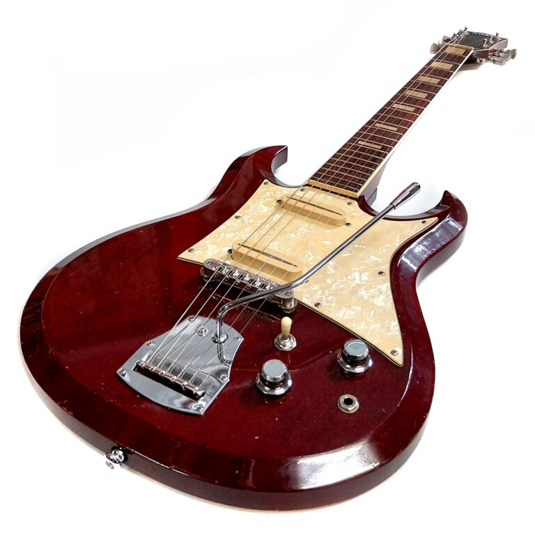Die Geschichte der Instrumentenbauerfamilie Hopf aus dem Vogtland hat vor exakt 350 Jahren begonnen. 1669 wird erstmalig der Instrumentenbauer Caspar Hopf aus Klingenthal urkundlich erwähnt. Die genauere Firmengeschichte bis zum heutigen Tag kann man auf der Website der Firma Hopf nachlesen. Bekannte Modelle aus den 1960er Jahren waren auch die Saturn, Allround und Telstar (siehe Foto – die hatte ich alle schon mal „in stock“). Das vorliegende Modell „Studio“ ist eine Art Kreuzung aus Gibson SG und Burns Bison. Laut einem interessanten Artikel in „Gitarre & Bass“ von Josef Urbanek aus dem Jahr 2005, hat Dieter Hopf, der noch heute hervorragende Konzertgitarren baut, auch schon vor 50 Jahren dieses Modell mit entworfen. Die Basis der Gitarre (im oberen Foto links) ist als durchweg hochwertig zu bezeichnen: Mahagonihals und -body in feinster cherry Nitrolackierung und ein Palisandergriffbrett mit Binding und Blockinlays.