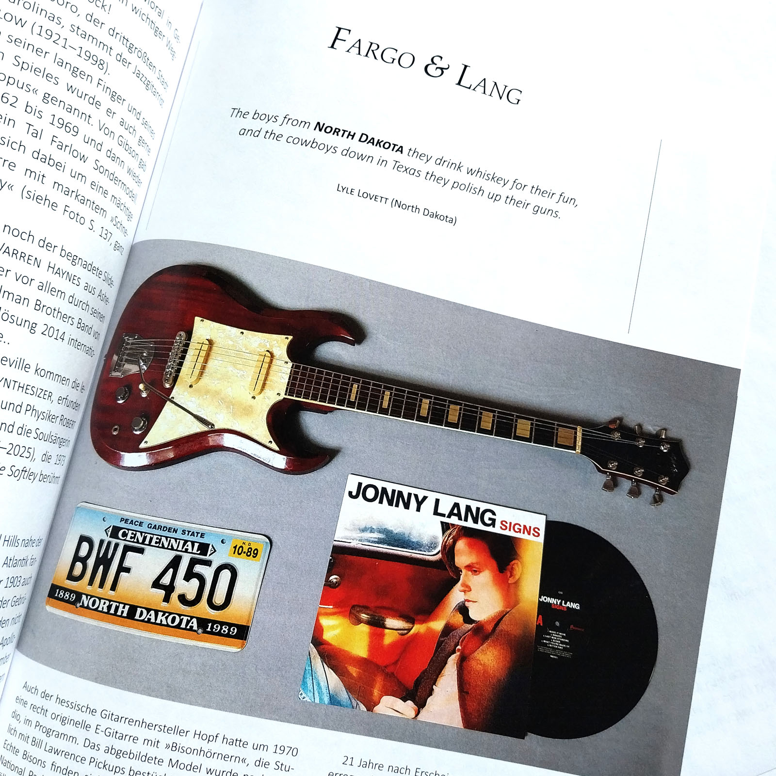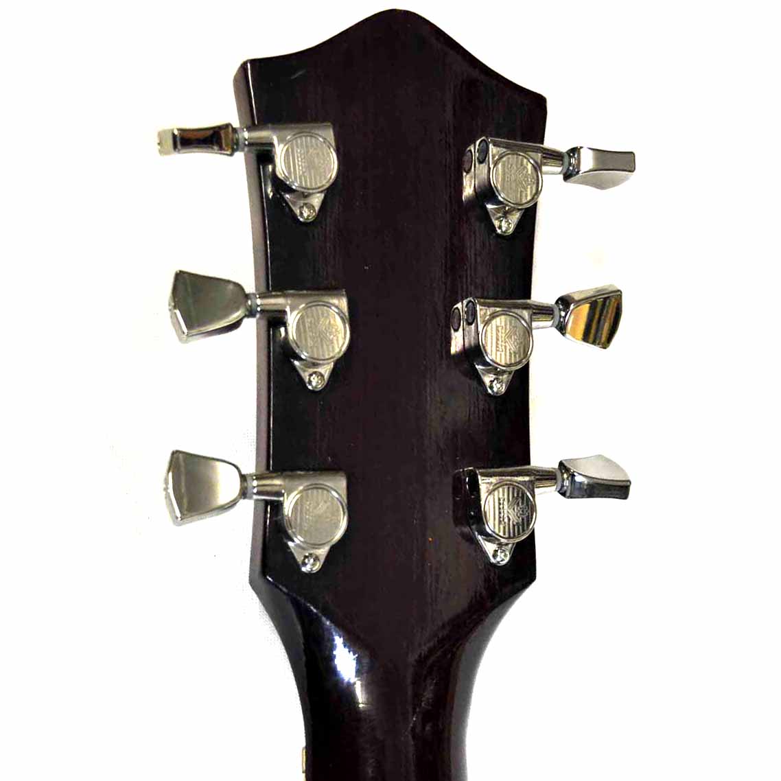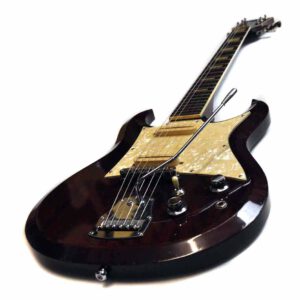 In die Löcher der Kopfplatte haben exakt ein Satz Kluson MT33N Mechaniken gepasst. Optisch und funktional perfekt. Da ich noch ein originales Schaller Tremolo in meiner Krabbelkiste hatte (wie auch damals von Hopf schon verwendet), wurde aus dieser Hardtailgitarre jetzt ein Tremolomodell. Angeblich wurden die originalen P-90 artigen Singlecoils der Hopf Studio von Bill Lawrence entworfen. Grund genug für mich, hier astreine Bill Lawrence L-250 Pickups aus den 80er Jahren in creme zu verbauen. Diese Humbucker klingen unglaublich gut und sind vor allem in creme extrem selten (…und teuer!). Montiert auf ein handgearbeitetes Perloid-Pickguard runden sie diese tolle Gitarre perfekt ab. Ein für mich absolut stimmiges Gesamtpaket!