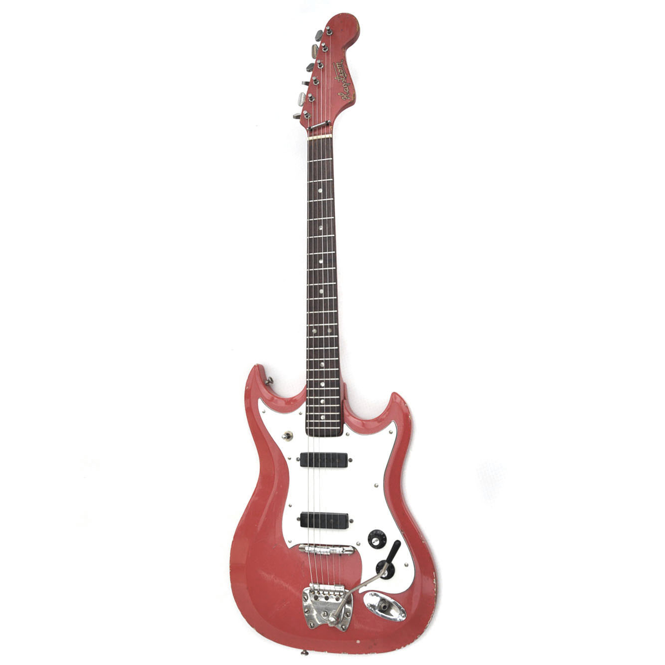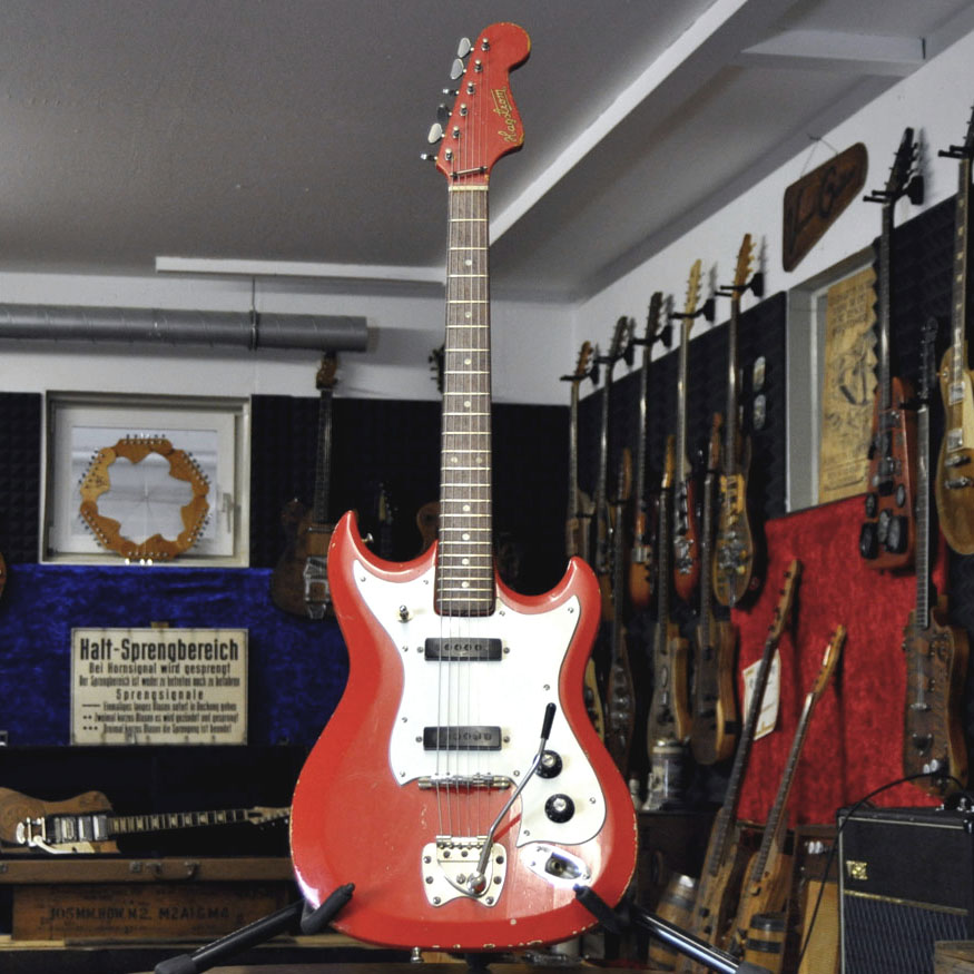 Wie schon erwähnt, hab ich die Gitarre als defekt erstanden. Sie war am Amp komplett tot. Auch der Lautstärkeregler war samt Potiachse abgebrochen und nicht mehr vorhanden. Allerdings befand sich alles andere in einem tollen Vintage Zustand: Keine Brüche oder Reparaturen, cooler roter Originallack und matching Headstock mit güldenem Logo, Mechaniken, Saitenniederhalter, Sattel, Tremolo samt Hebel, Gurtpins, Brücke und Buchse – alles komplett und original! Es hat sich schnell herausgestellt, dass nur der Mittel-PU defekt und ein paar Kabel abgerissen waren.