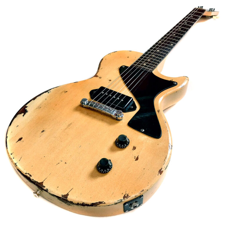 Als erstes musste ich logischerweise sämtliche Hardware und vor allem alle Nietenköpfe , die zum Glück nur aufgeklebt und nicht genagelt waren, entfernen. Danach hab ich alle nicht mehr benötigten Fräsungen und Löcher mit Holz verschlossen. Das ganze ordentlich verschliffen und dann noch ein hauchdünnes Mahagonifurnier auf die Decke geleimt. Nochmals sauber verschliffen, danach grundiert, lackiert und optisch den Look einer 65-Jährigen verpasst! Beim Neuaufbau kamen dann die Brücke und Mechaniken einer alten Gibson Melody Maker aus den 1960er Jahren und ein „Nowaxx“ Hot-Dog P-90 Pickup aus dem bayerischen Straubing zum Einsatz. Mir persönlich gefällt das Ergebnis ganz hervorragend und auch der Sound scheint mir deutlich besser als zuvor zu sein. Im letzten Foto der Galerie sieht man den wohl prominentesten Anhänger der Gibson Les Paul Junior der Welt! (Foto by Bjørnulf Vik)