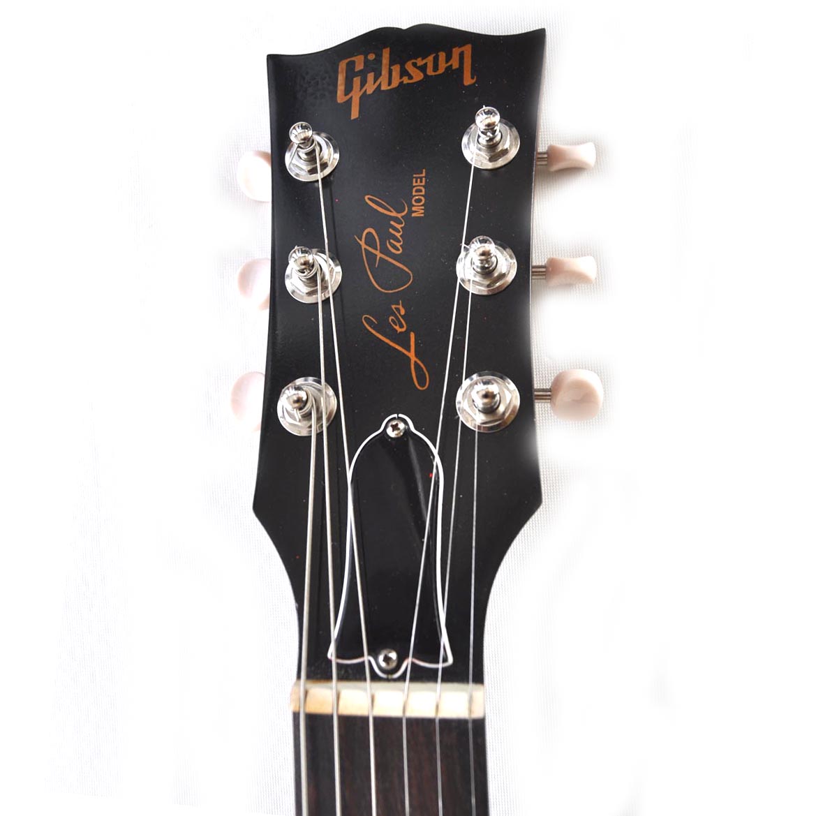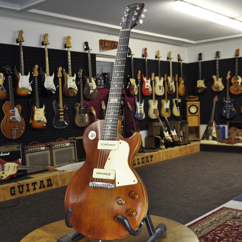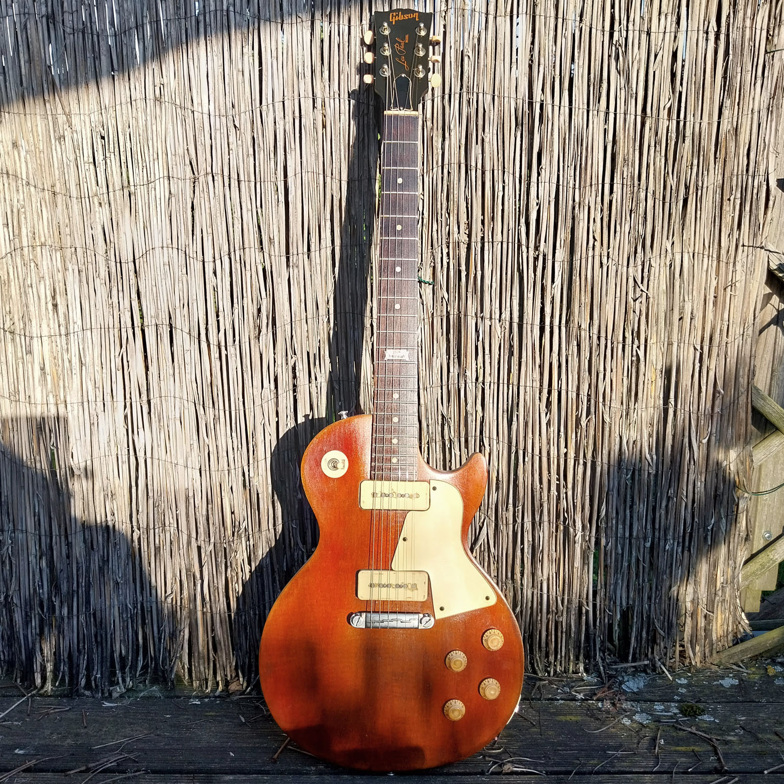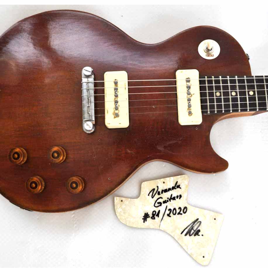 1957 Gibson Les Paul SpecialIm oberen Foto sieht man den Originalzustand der Gitarre in mattschwarz. Nachdem sie sich wirklich gut spielen ließ und auch hervorragend klang, beschloss ich, ihr eine neue Optik zu verpassen. Sozusagen ein „Makeover“. Sie hat jetzt ein antikes Naturfinish (nitro), cremefarbene Plastikteile, neue Potiknöpfe, eine alte Wrap-around Brücke und ein neutrales Trussrod Cover. Als Sahnehäubchen hab ich das Schlagbrett im Stil einer „Les Paul Special“ gefertigt und der Wölbung der Decke angepasst. Sie ist immer noch eine sehr gute Gitarre, allerdings jetzt auch optisch voll mein Ding!