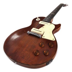 Die klassische Melody Maker wurde von 1959 bis 1971 gebaut und hatte immer einen dünnen und planen Mahagonikorpus in LP – (auch mit Double Cutaway) und später auch in SG Form. Sie war auch immer mit schmalen Single Coil Tonabnehmern bestückt. Nicht mehr so unter Herrn Juszkiewicz: Zu Ehren des 120-jährigen Jubiläums von Gibson (Firmengründer Orville Gibson hat bereits 1894 seine erste Mandoline gebaut!) hat man hier ein Nobelmodell herausgebracht. Völlig untypisch gab es einen Mahagonibody mit aufgeleimter gewölbter Ahorndecke und zwei P-90 Tonabnehmer. Im zwölften Bund ist ein schönes „120 Anniversary“ Inlay eingelegt und am Trussrod-Cover steht „Melody Maker“.