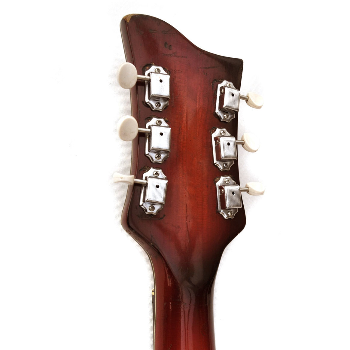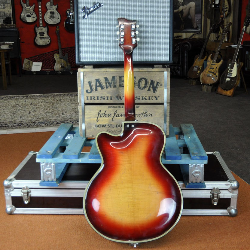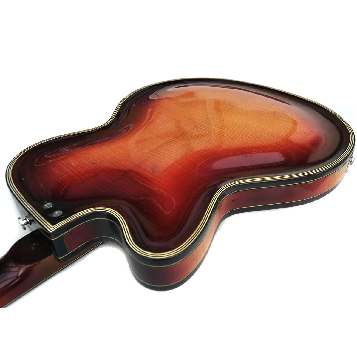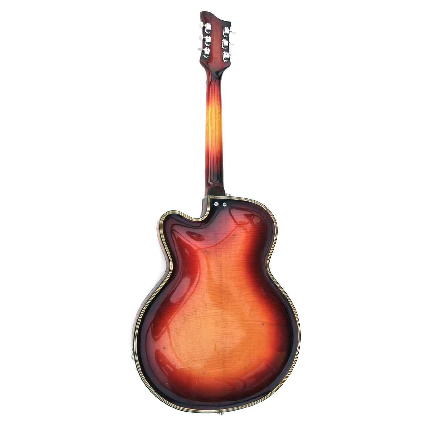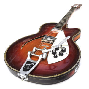 Neben der geschnitzten Fichtendecke und dem wunderschönen geflammten Ahornboden fallen auch die reichlich vorhandenen und aufwändigen Bindings und das schöne Ebenholzgriffbrett mit Blockeinlagen auf. Diverse Beschädigungen, vor allem der Decke wurden repariert und der Bereich ums rechte „F-Loch“ zum Elektronikfach erweitert. Das Instrument dürfte grob um 1960 gebaut worden sein. Da die Gitarre all seiner originalen Anbauteile beraubt wurde, kam mir die Idee, sie im „Ricky“ Stil neu aufzubauen. Im drittletzten Foto der Galerie unten ist eine top erhaltene „Rekord“ von 1955 aus meinem ehemaligen Besitz zu sehen.