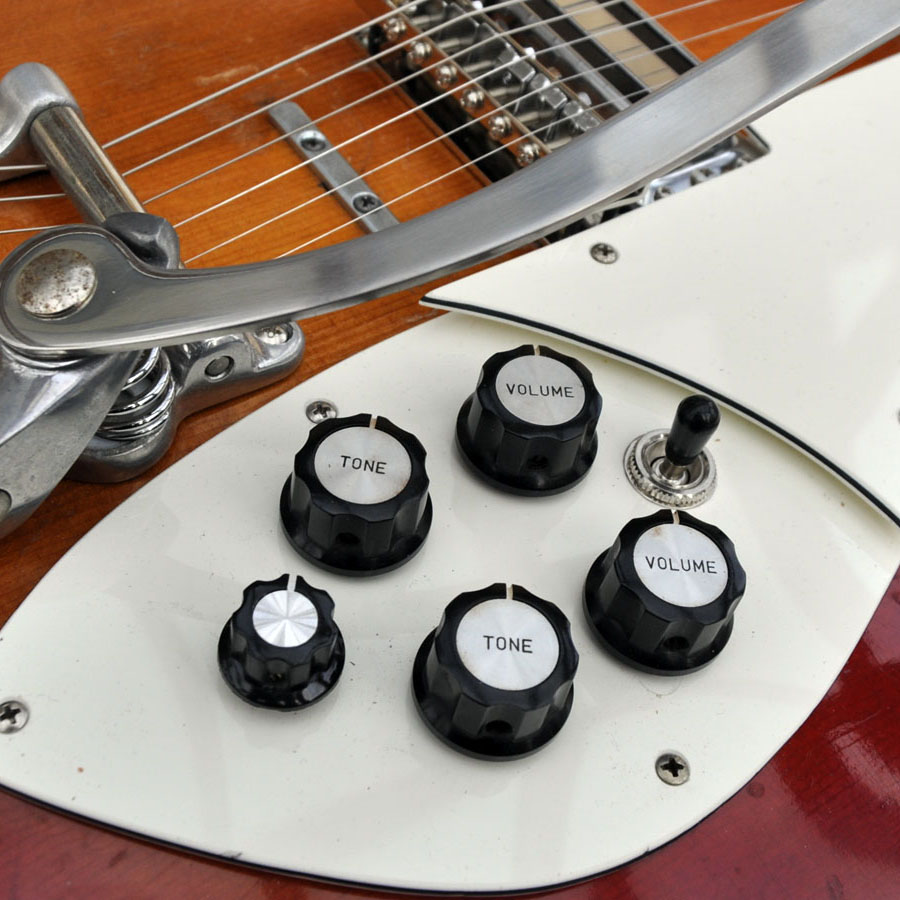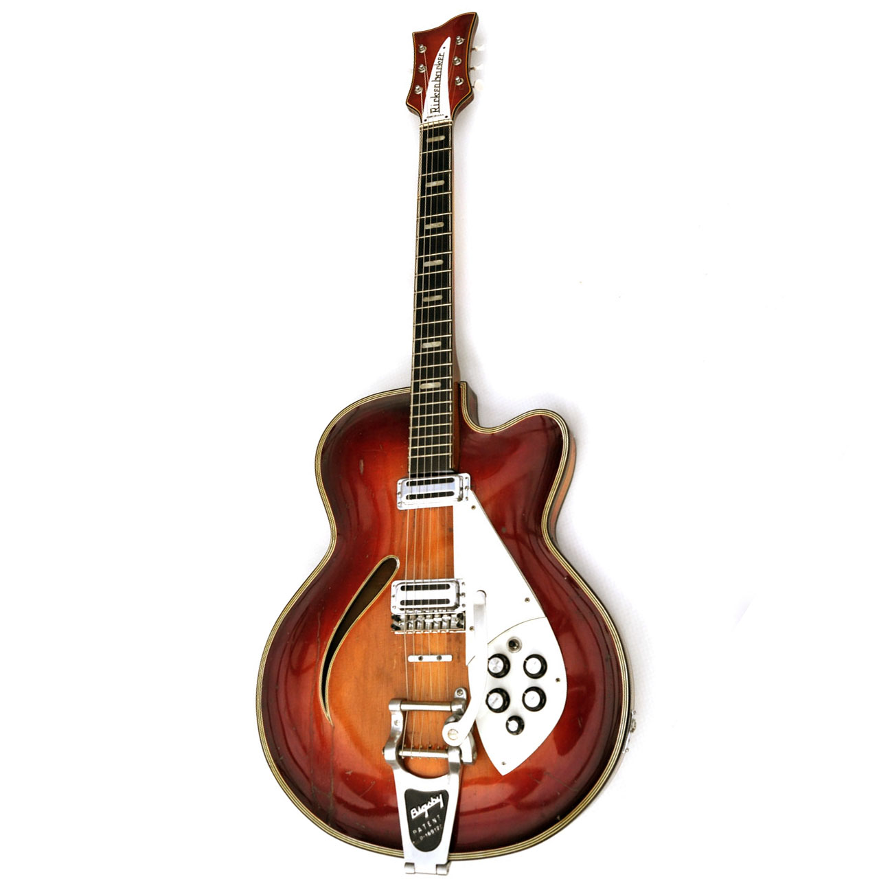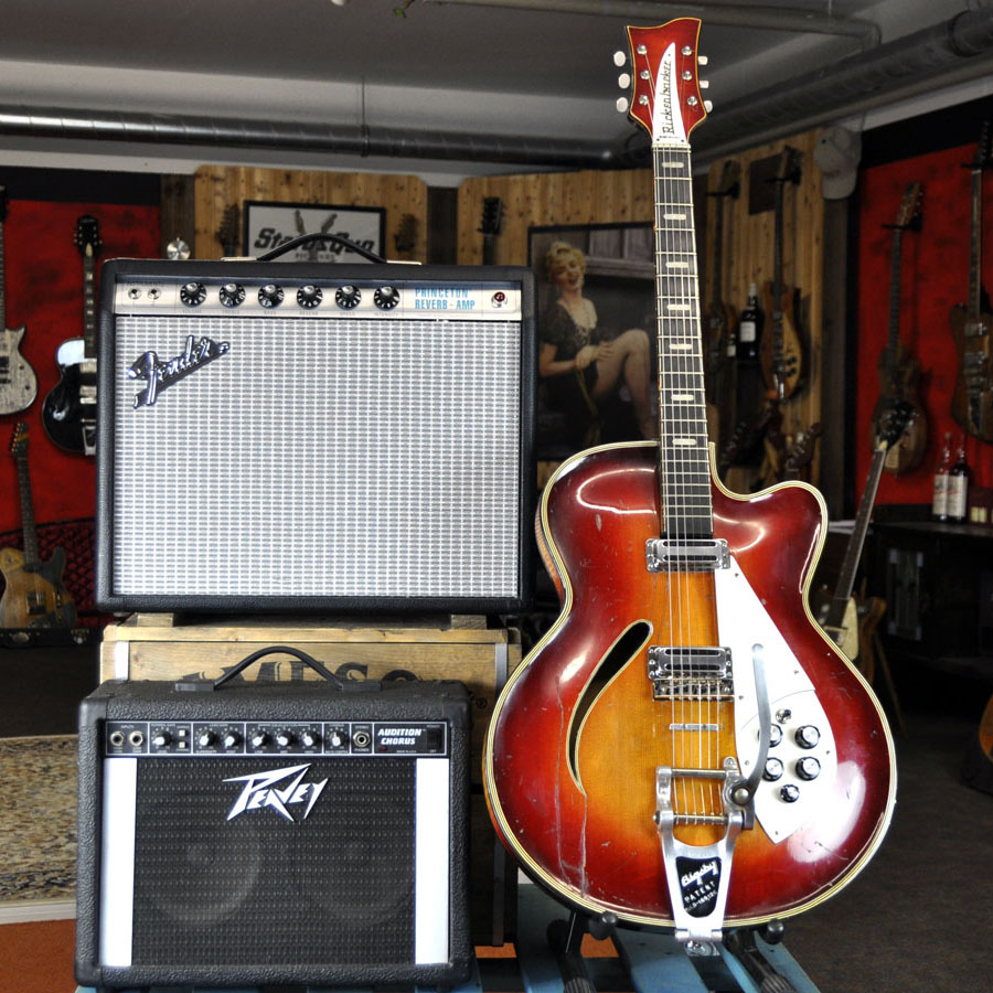 Rickenbacker Teile, Toaster PickupsNamensgeber und Mitbegründer der kalifornischen Kultmarke war der 1887 in Basel in der Schweiz geborene Adolph Rickenbacher. Zusammen mit dem texanischen Musiker George D. Beauchamp wurden ab 1931 Gitarren gebaut, die spätestens seit ihrem Einsatz bei den Beatles Weltruhm erlangten. In meiner 25-jährigen Laufbahn als Gitarrenhändler ist schon so manches  edle Instrument aus Santa Ana durch meine Hände gegangen (siehe die letzten beiden Fotos). Außerdem haben sich in meiner Werkstatt auch einige Teile angesammelt, die zusammen mit einem Satz Kluson Mechaniken, einem Bigsby B7 Tremolo und zwei handgemachten Pickguards nun zu dieser wunderschönen Gitarre, wie ich finde, komplettiert wurden. Ich möchte ausdrücklich betonen, dass das Instrument ein Kunstobjekt und Einzelstück ist, dass weder zum Verkauf bestimmt ist, noch in irgend einer direkten Weise mit der Firma Rickenbacker zu tun hat.