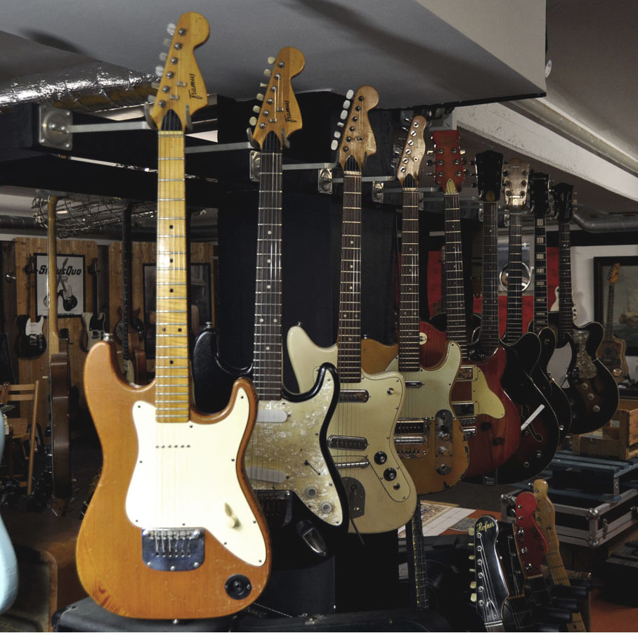 Die ebenfalls im Foto zu sehende und vollkommen überfrachtete „Radiostar“ Strat hat übrigens den gleichen Sandwichbody wie die „Guard“, vermutlich aus Kiefer, stammt aber aus dem Hause „Klira“.