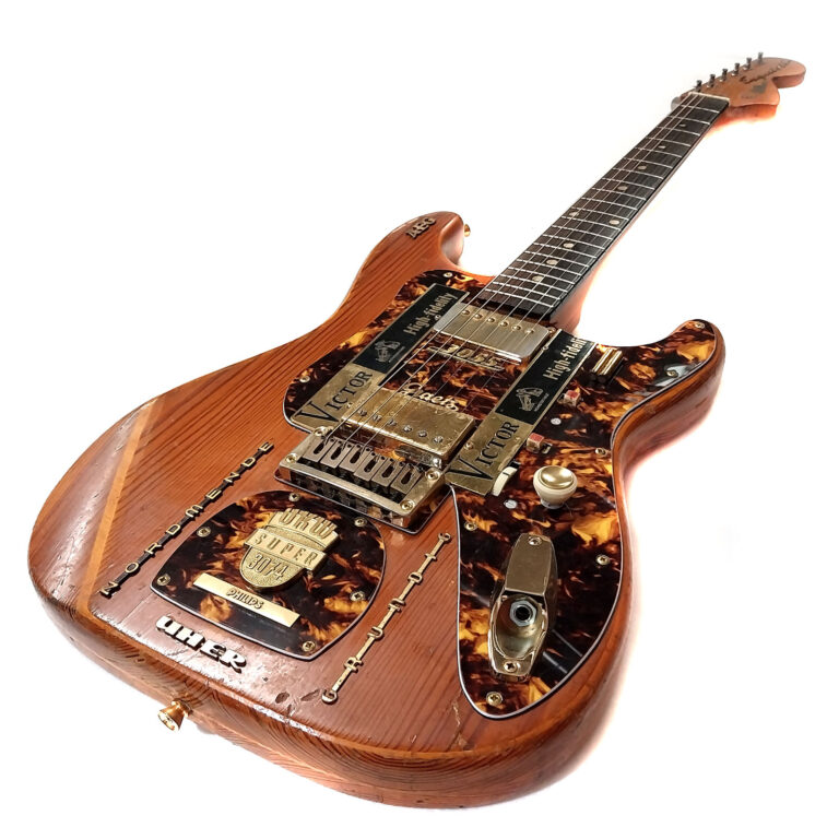 Nachdem die „Aprilscherzgitarre“, die Framus „The Guard“, kaum an Minimalismus zu unterbieten war, hab ich die „Radio Star“ fast bis an die Schmerzgrenze mit Nippes vollgepackt! Einem passionierten Röhrenradiobastler hab ich vor Jahren eine Kiste voll mit Emblemen und sonstigen Anbauteilen alter Radios abgekauft, die jetzt endlich einer neuen Bestimmung zugeführt werden konnten. Die Basis war diesmal ein alter Klira Body plus Hals. Den dekorativen Schichtholzkorpus scheint man vom gleichen Schreiner bezogen zu haben, der auch Framus belieferte. Sieht zumindest so aus. Funktional hab ich die Gitarre mit einer Saitenführung durch den Body, einer massiven Brücke und zweier guter Humbucker aufgewertet. Alles andere dient mehr der Optik und soll eine Art Hommage an die hervorragend klingenden Röhrenradios aus meinen Kindertagen sein.