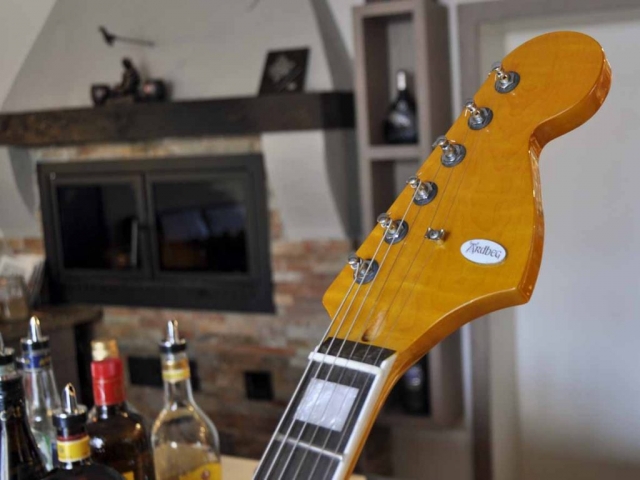 Ansonsten ist die Whiskymaster mit drei originalen Fender Pure Vintage USA Pickups bestückt: zweimal ’65 Jaguar und einmal Jazzmaster (die PU-Kappen wurden schwarz lackiert), jeweils mit einem eigenen Schiebeschalter anwähl- und frei kombinierbar! Da klingen vor allem die Zwischenstellungen sehr interessant! Da die Tremolos der amerikanischen Originale immer gerne zu rappeln und schnarren anfangen, hab ich mich hier für eine fixe Brücke entschieden. Somit auch kein Rappeln. Schaller Mechaniken „made in Germany“ sorgen für gute Stimmung. Ein weiteres Highlight der Gitarre ist der stark geflammte fette Ahornhals mit großer Kopfplatte und eingefasstem Griffbrett mit Blockeinlagen. Die schöne rote Couch steht übrigens in der Cafe-Bar Bärlin in Gunzenhausen – da hat es unter anderem auch gute Single Malts!