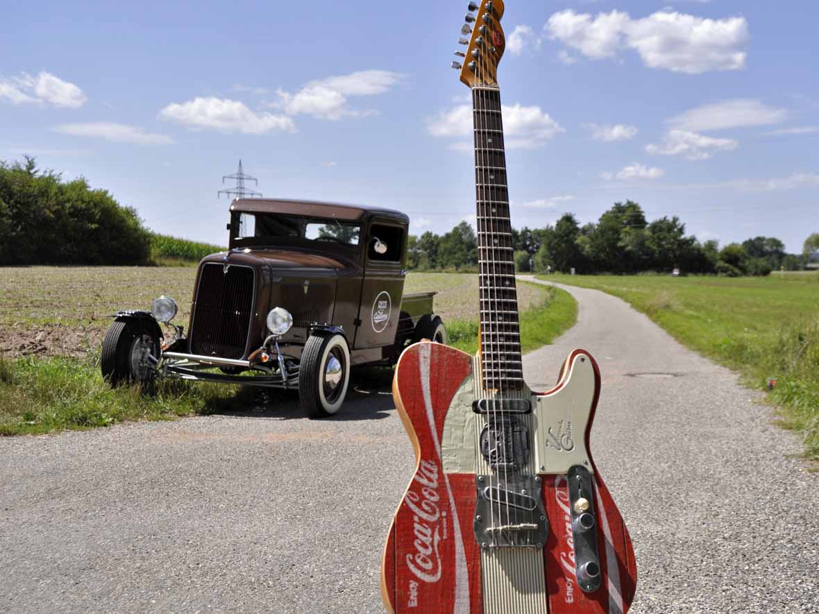 Die Brücke und die Tonabnehmer stammen von einer Ibanez Kopie von ca. 1970. Klingt sehr, sehr gut, das ganze! Zwischen den beiden Pickups wurde noch eine dekorative ehemalige Gürtelschnalle mit Coca Cola LKW Motiv platziert.