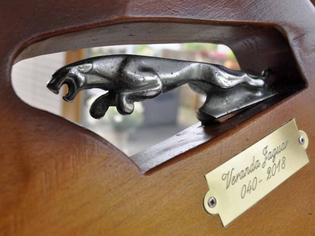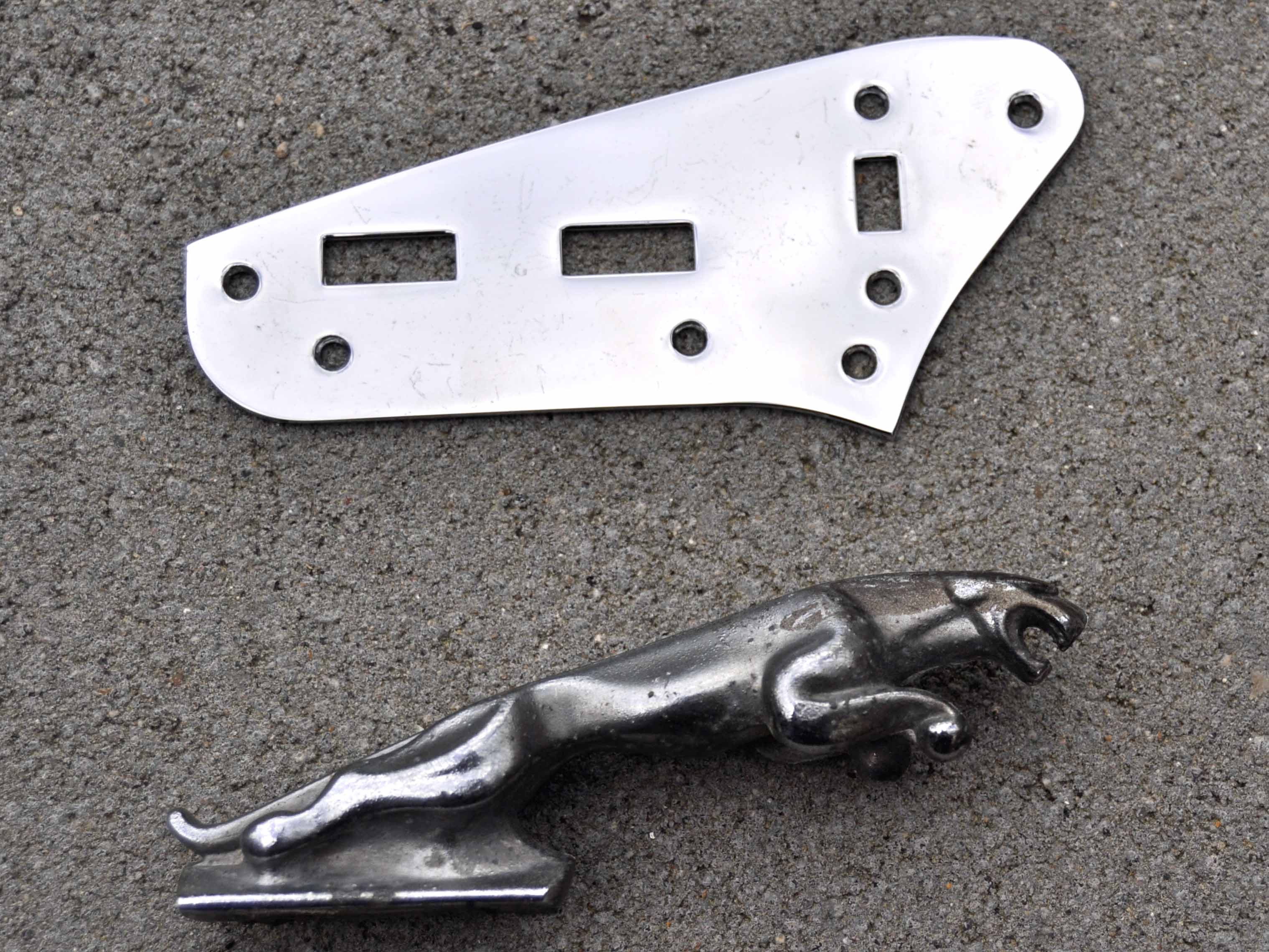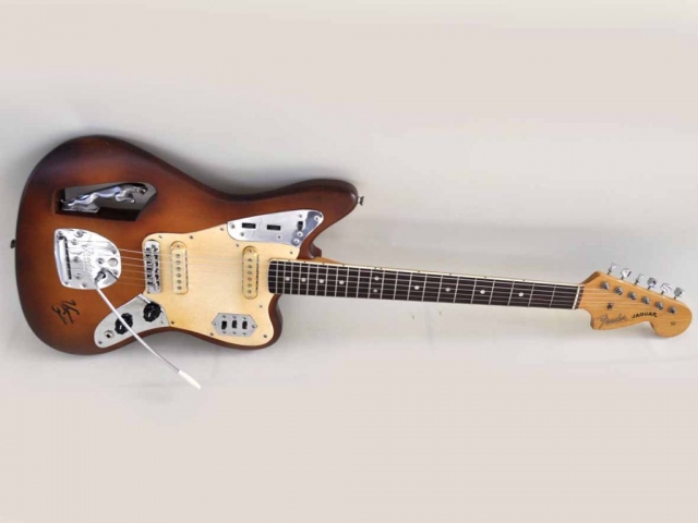 Dieses originelle Instrument hab ich definitiv nicht selbst gebaut. Es handelt sich vielmehr im Wesentlichen um eine originale amerikanische Fender Jaguar aus dem Jahr 1965. Der Unterschied zur Standardversion besteht hauptsächlich in der „eingebauten“ Kühlerfigur einer alten englischen Jaguar Karosse. Da hat – zumindest meiner Meinung nach – zusammengefunden, was in gewisser Weise auch recht gut zusammenpasst. Bevor jetzt allerdings die große „Vintage-Sakrileg-Empörung“ über mich hereinbricht: Die Fender hab ich schon verbastelt erworben. Sie war bereits ihrer kompletten Elektronik und ihres originalen Sunburst-Lackes beraubt worden und somit nicht mehr in „sammelwürdigen“ Zustand! Da war also dann die Überwindung, eine Aussparung für die Jaguar-Figur in den Jaguar-Korpus zu sägen, nicht mehr soooo groß.